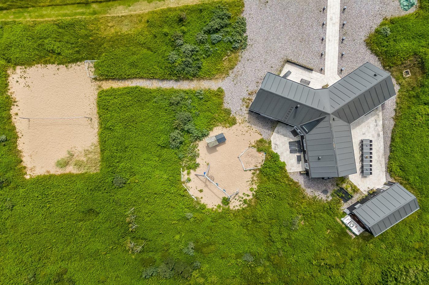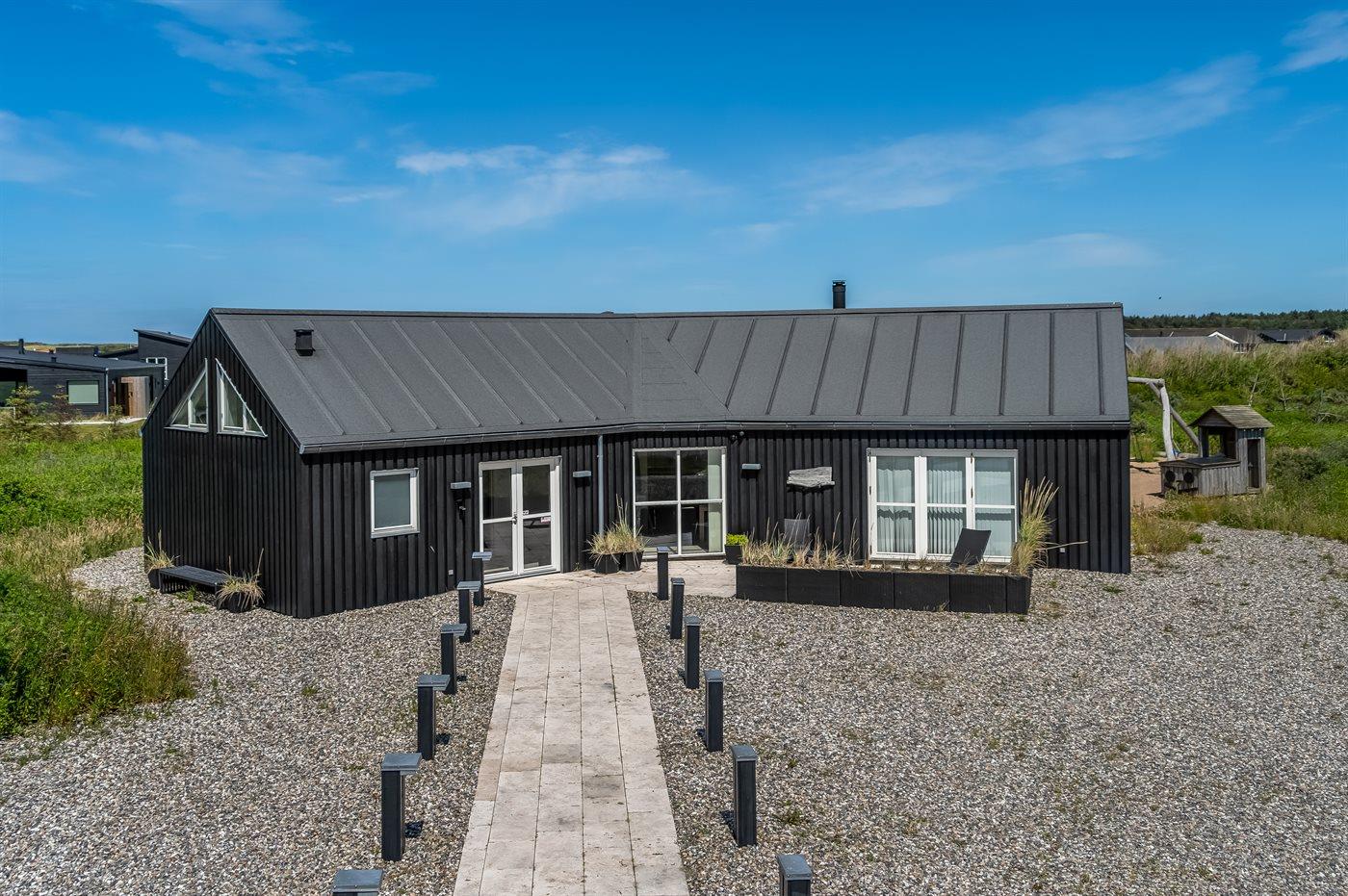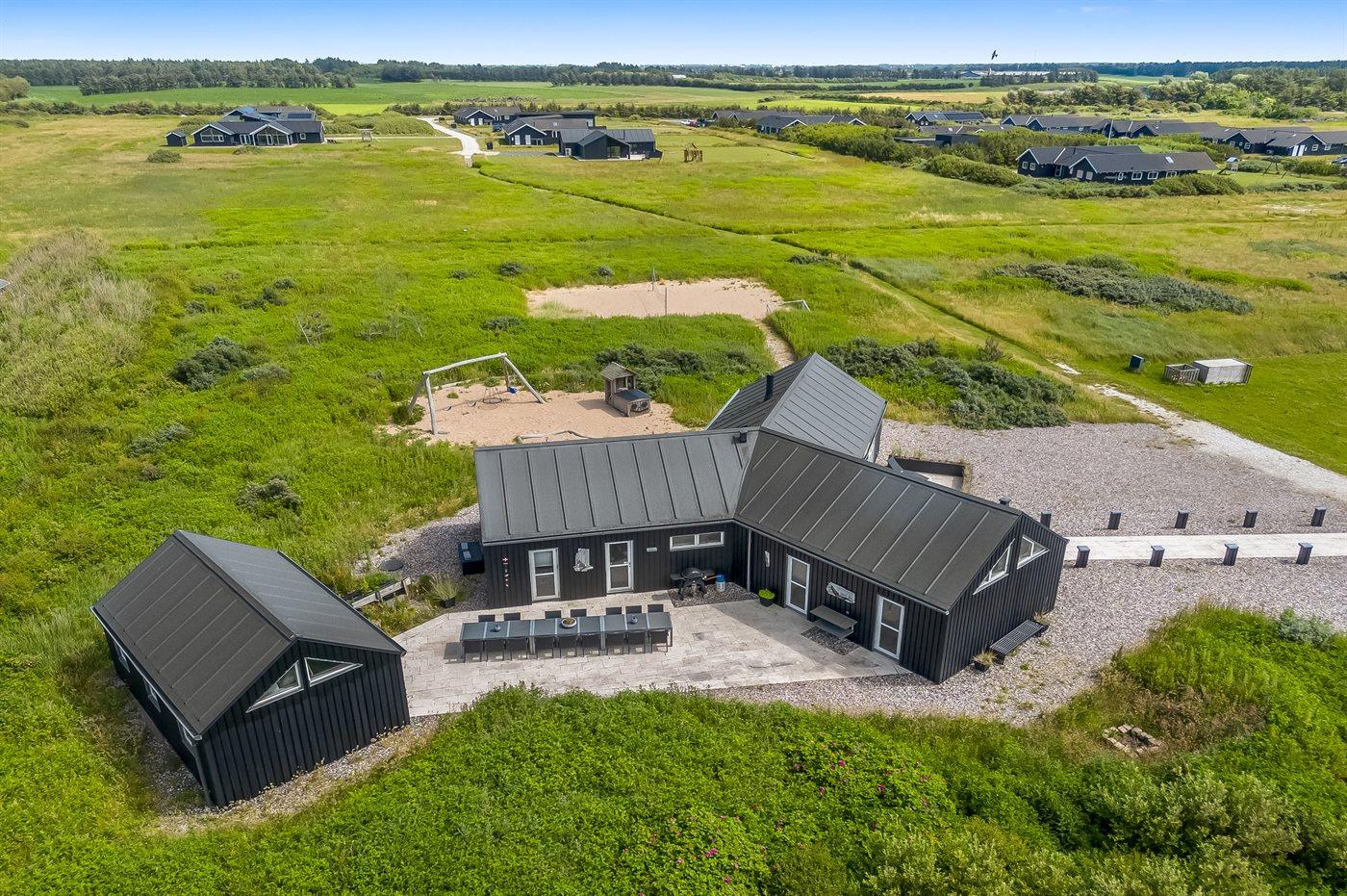 Stort arkitekttegnet sommerhus nær Løkken med spa, sauna, beachvolley og aktivitetsrum på stor naturgrund.