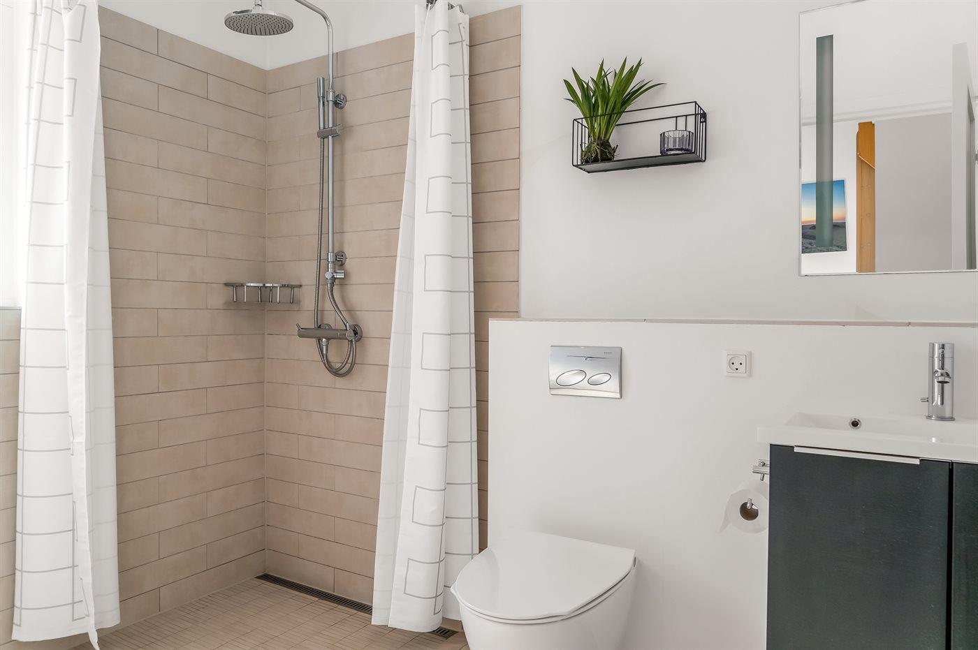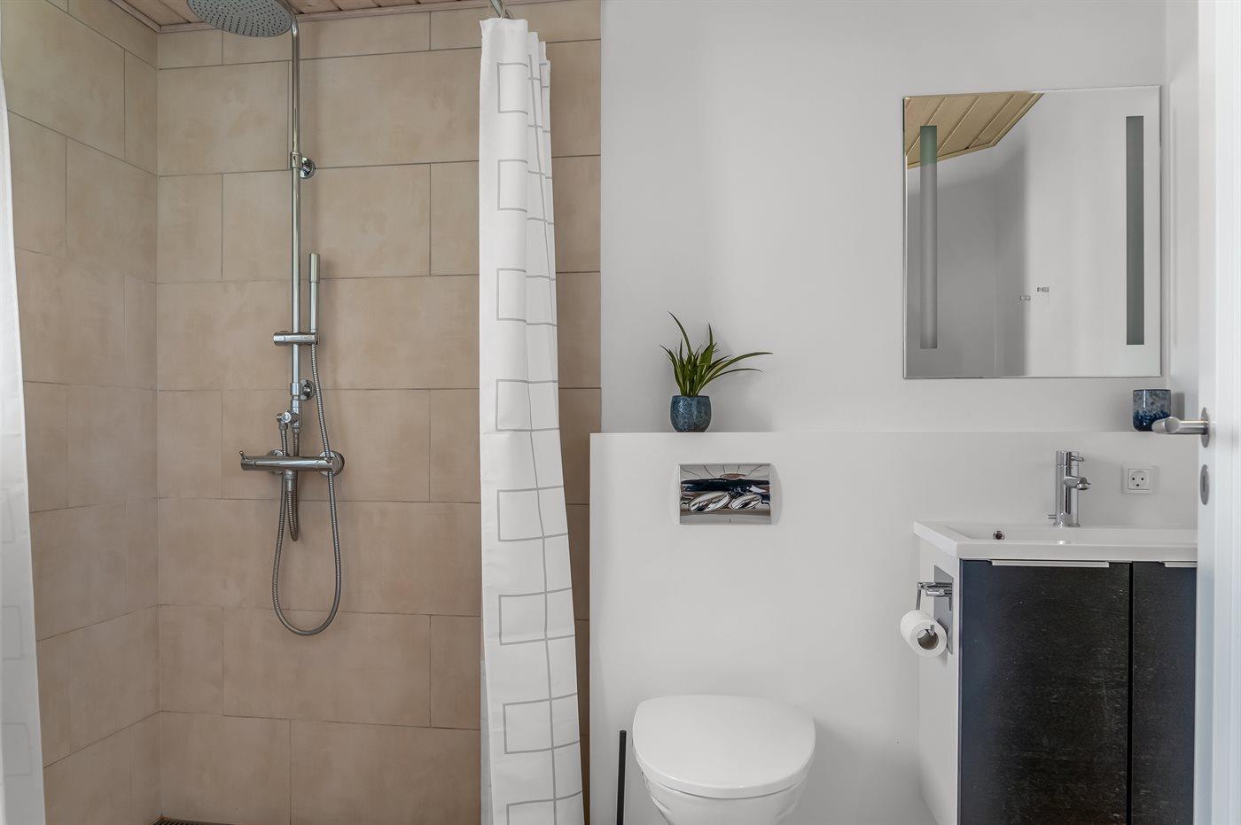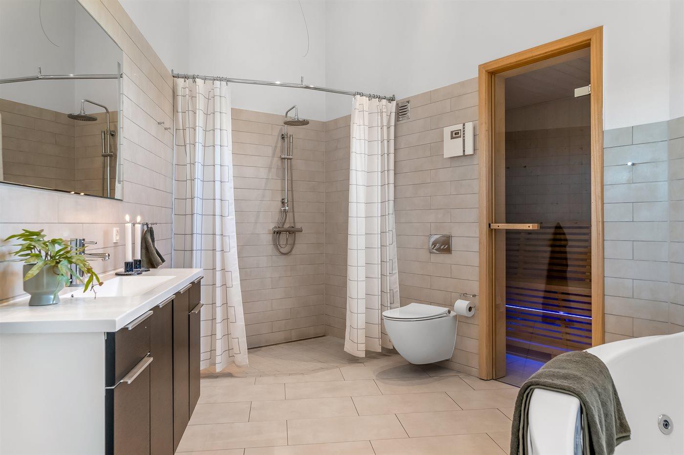 Der er 3 badeværelser med bruseniche og 3 toiletter. Der er gulvvarme på 1 badeværelse. I saunaen er der mulighed for afslapning.