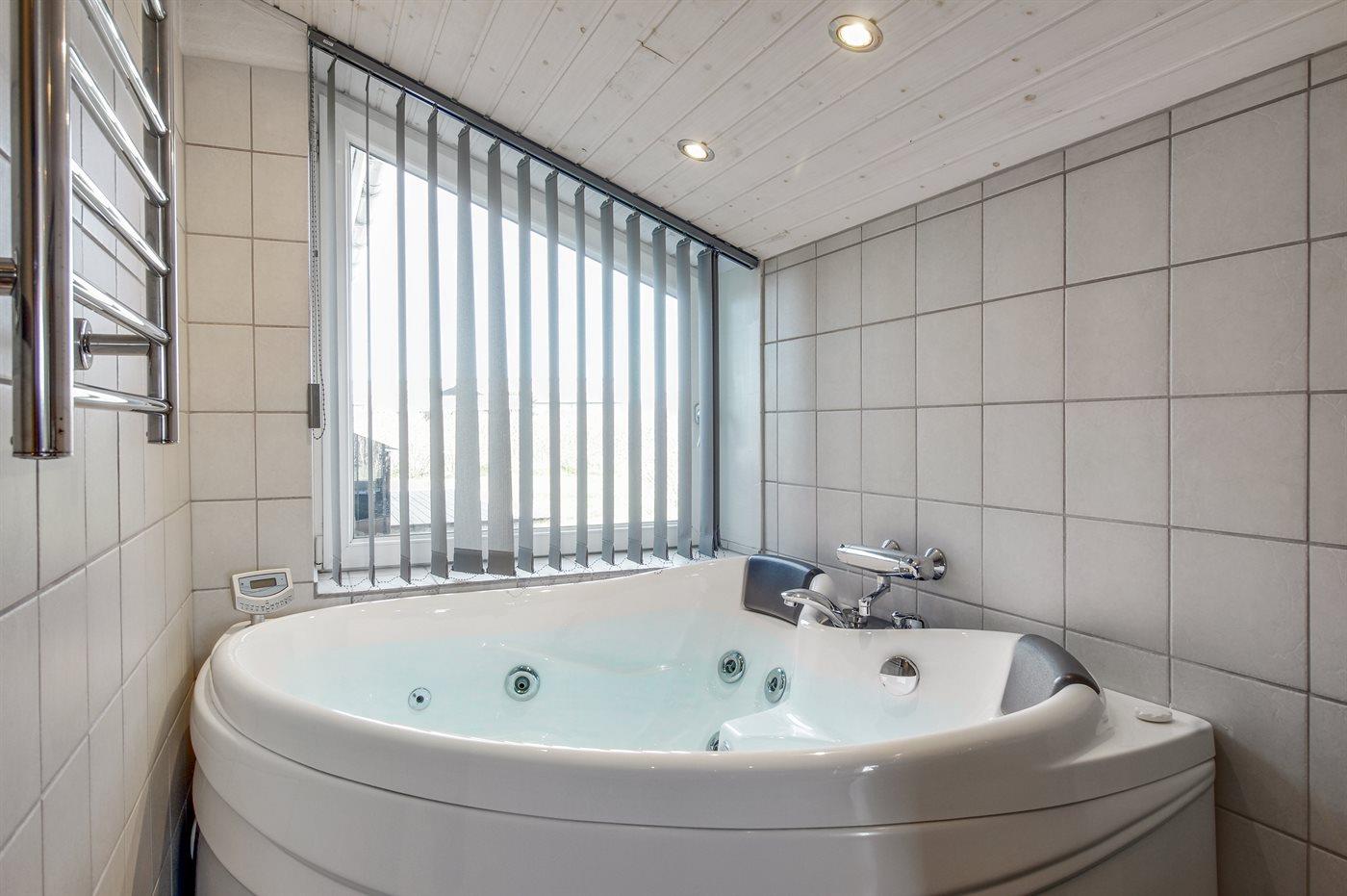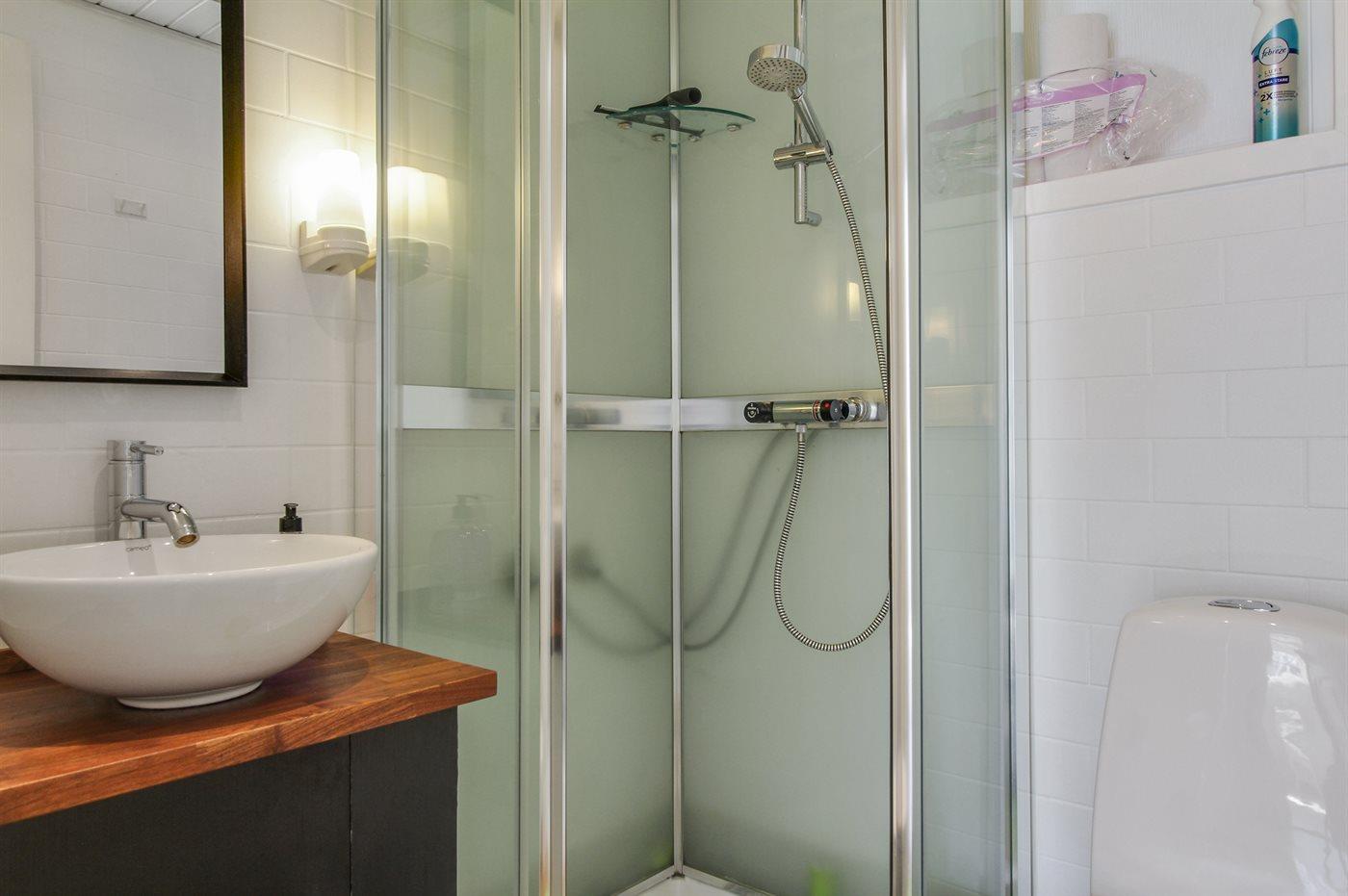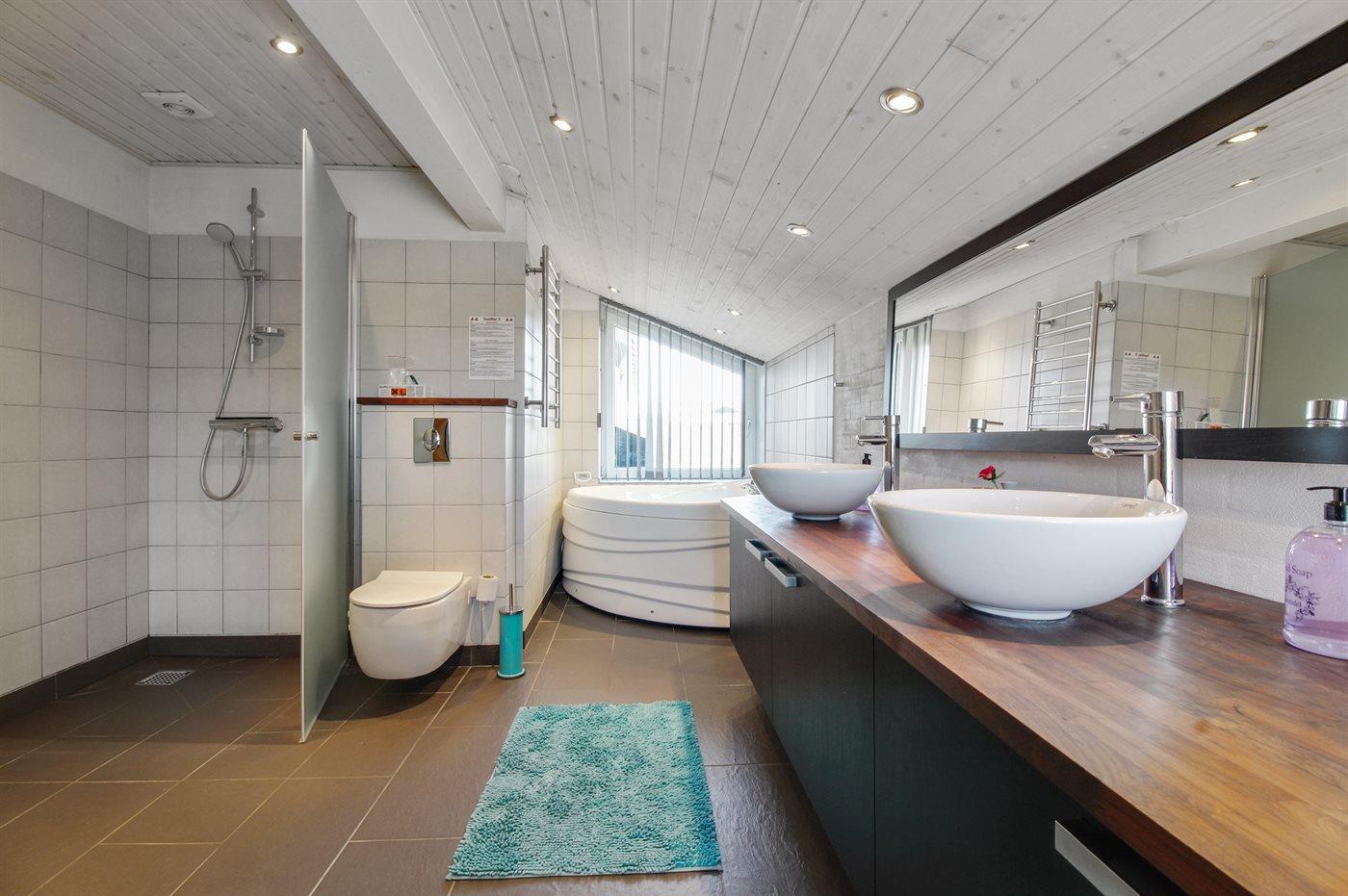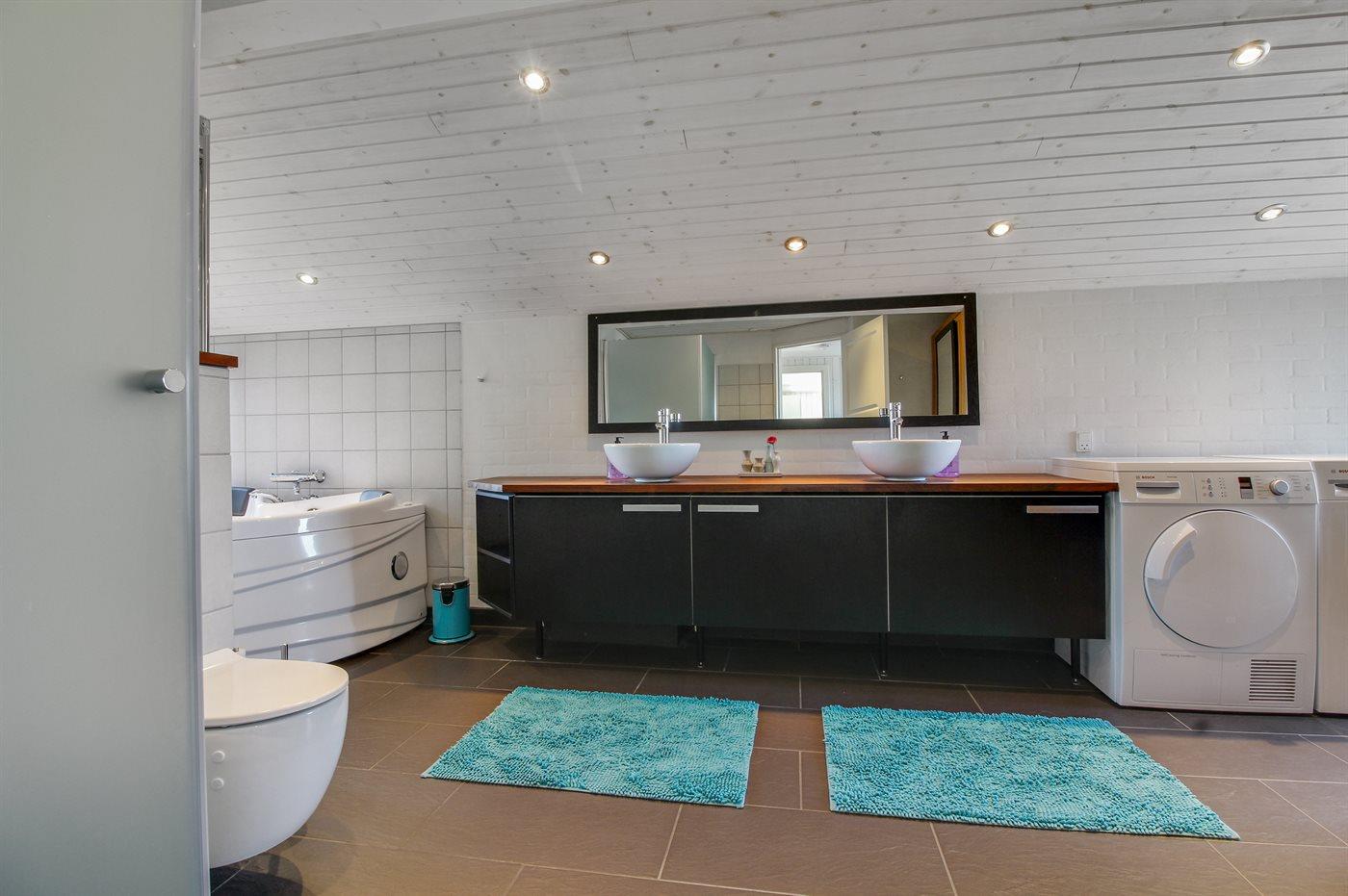 Der er 2 badeværelser med bruseniche og 2 toiletter. Der er gulvvarme på 1 badeværelse. I saunaen er der mulighed for afslapning.