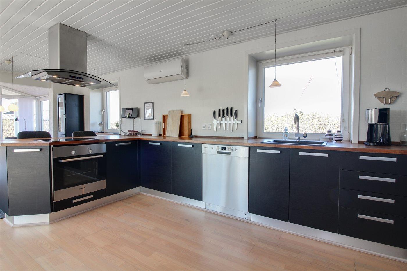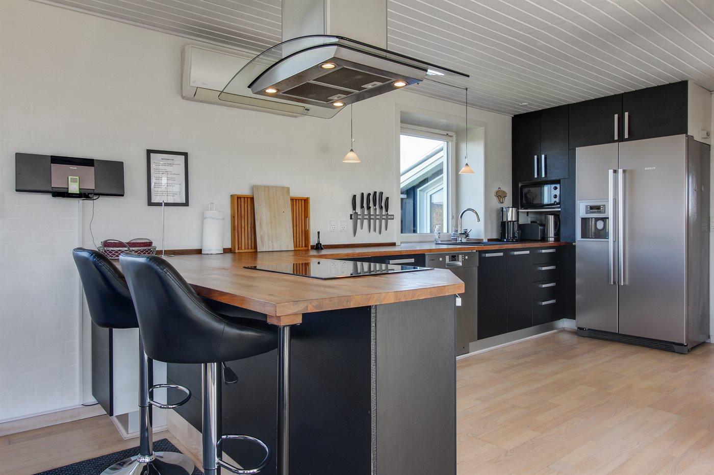 Køkkenet er udstyret med 1 køleskab. Der er 4 induktionskogeplader, varmluftovn, mikrobølgeovn samt opvaskemaskine.