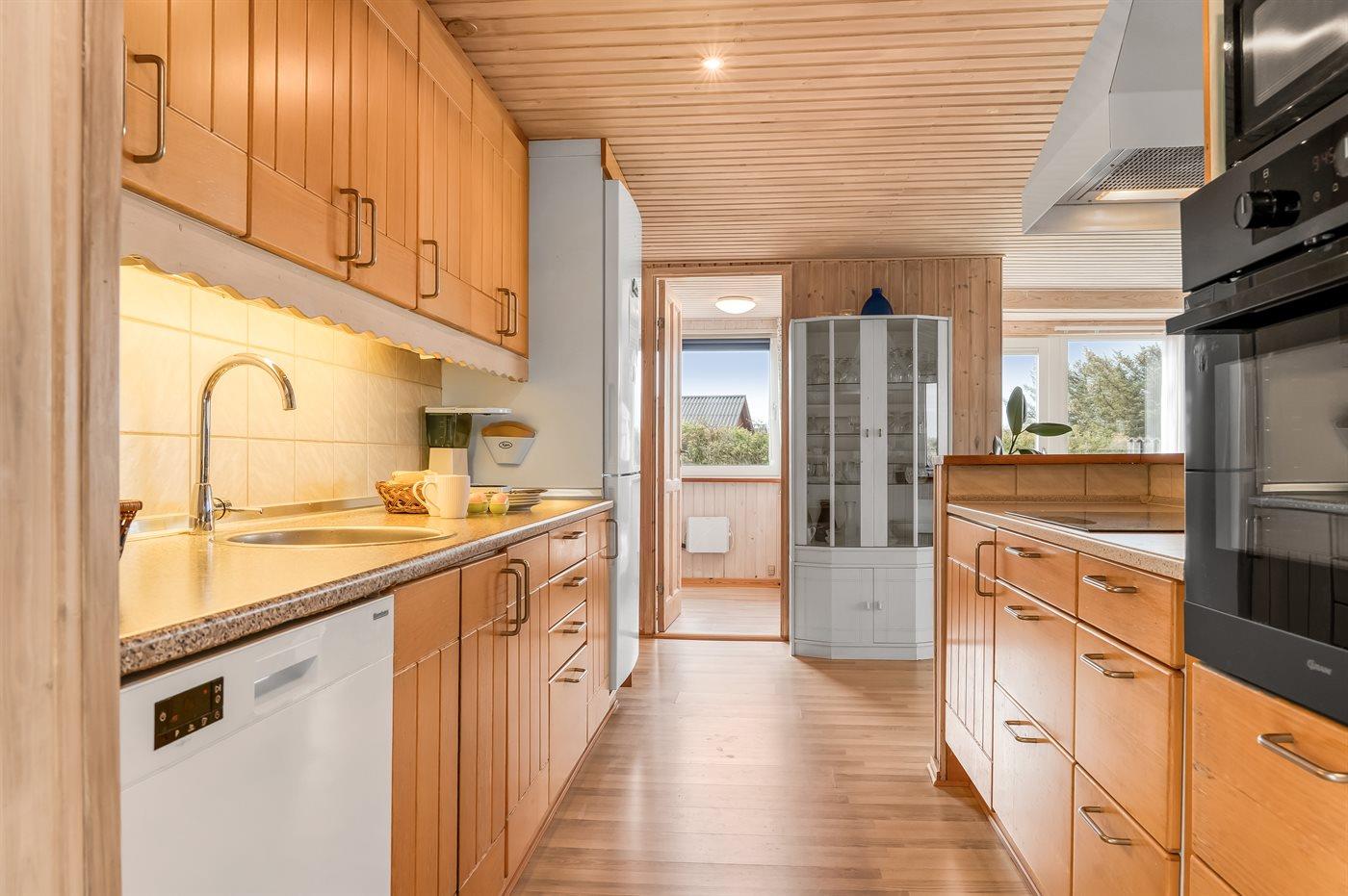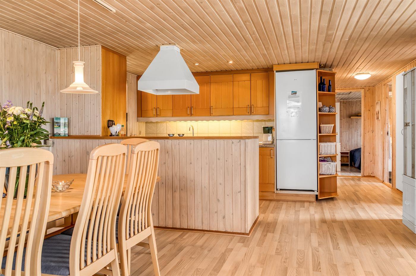 Køkkenet er udstyret med 1 køleskab. Der er 4 induktionskogeplader, varmluftovn, mikrobølgeovn samt opvaskemaskine.
