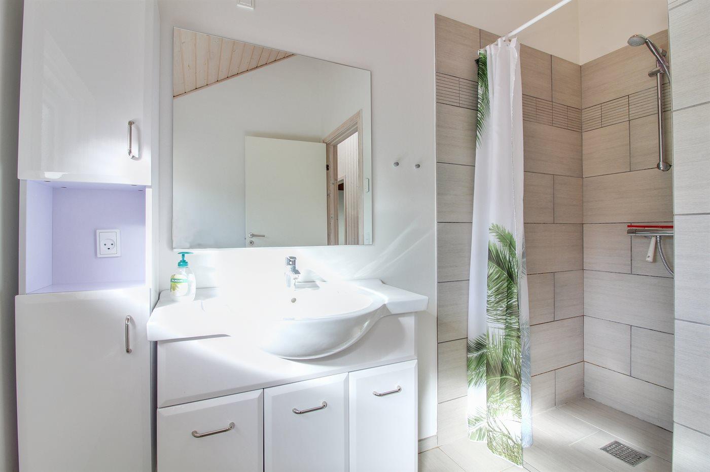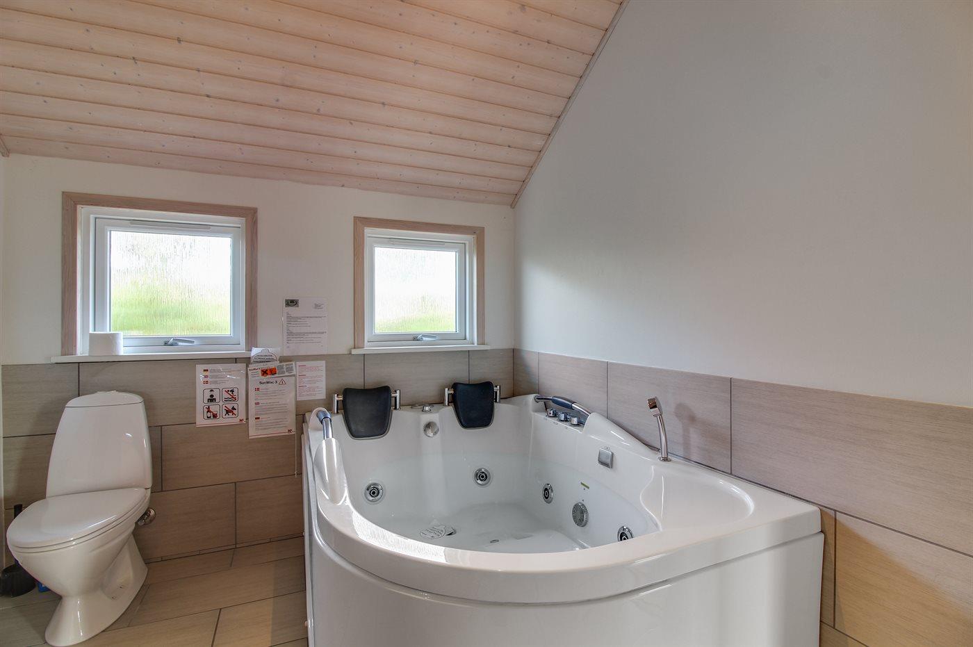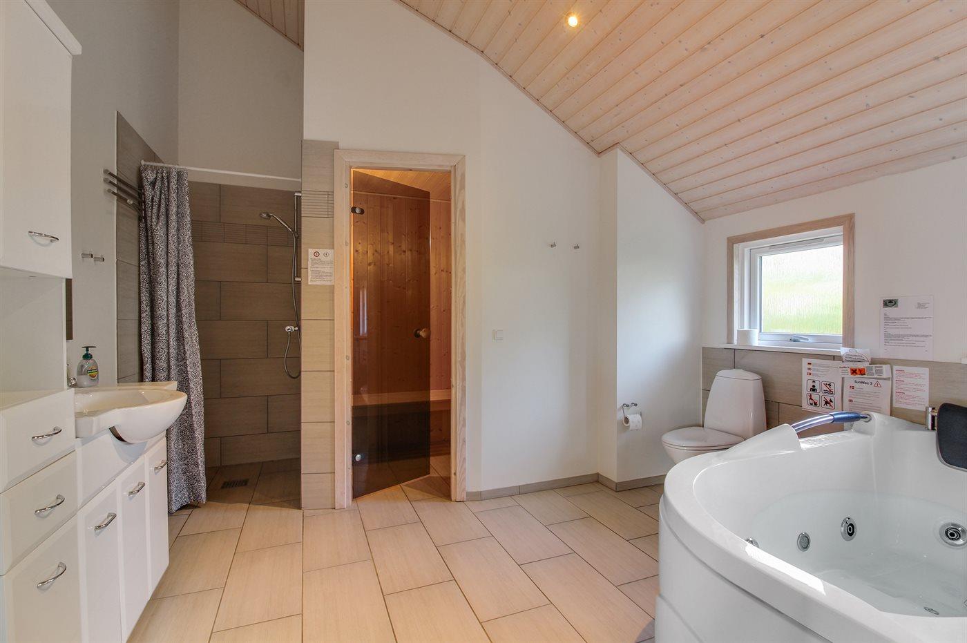 Der er 2 badeværelser med bruseniche og 2 toiletter. Der er gulvvarme på 1 badeværelse. I saunaen er der mulighed for afslapning.