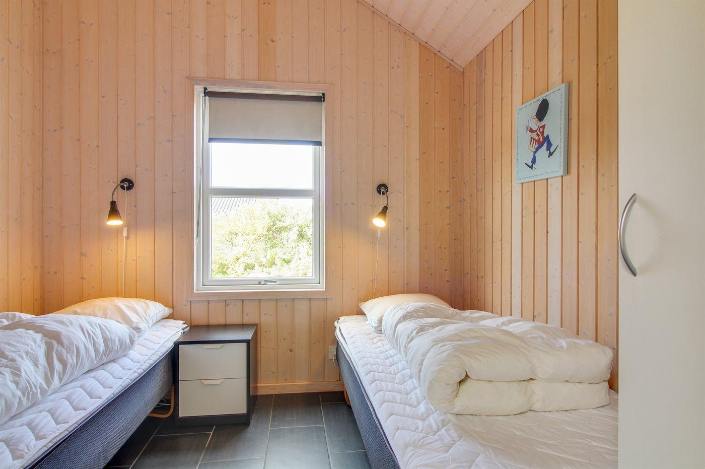 Der er i alt 4 soveværelser. Sovepladserne fordeler sig på: 4 sovepladser i dobbeltsenge. 4 sovepladser i enkeltsenge. 2 sovepladser på madrasser.- 2 af disse sovepladser befinder sig på husets hems. Derudover er der 1 stk. barneseng.