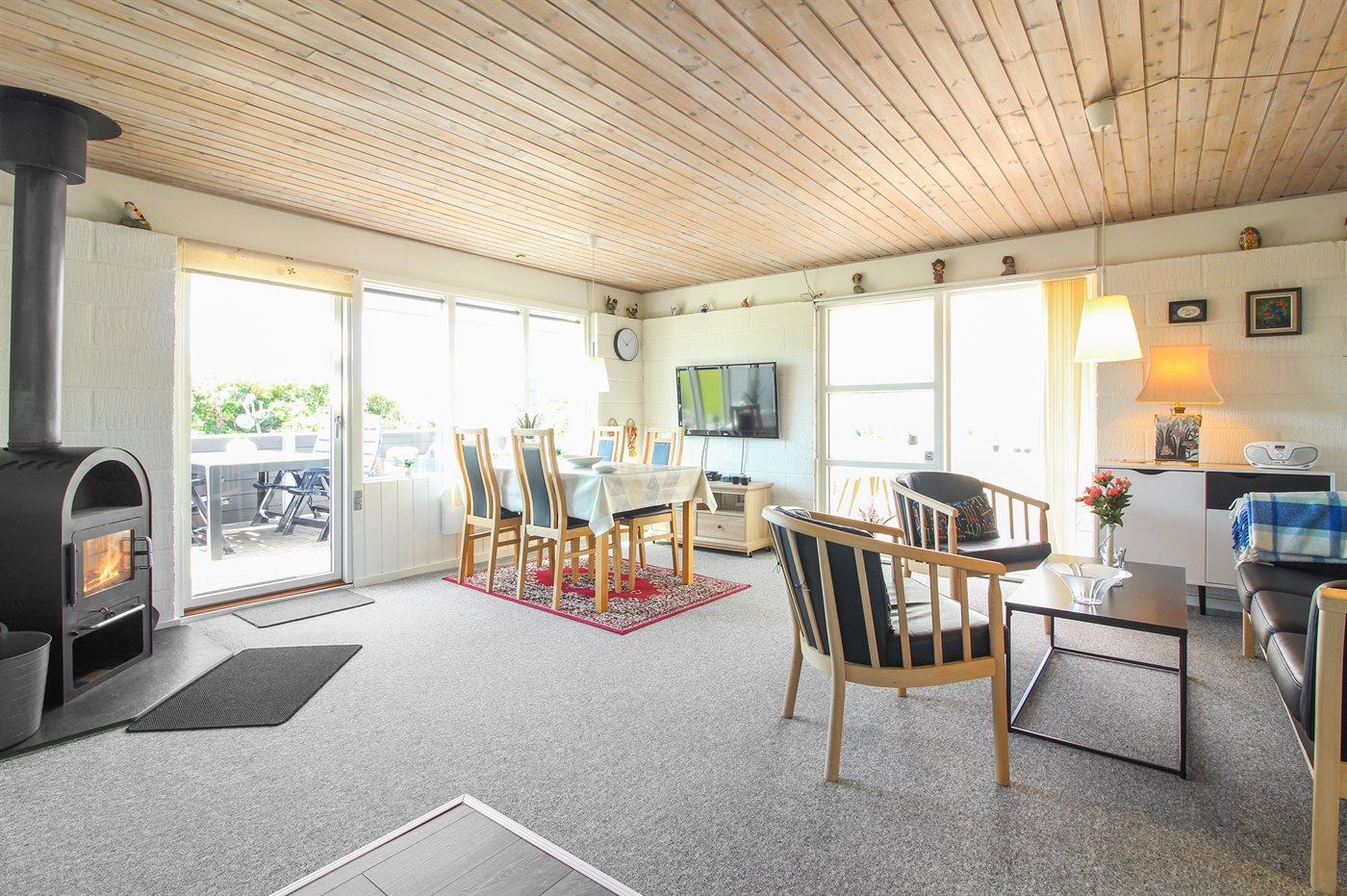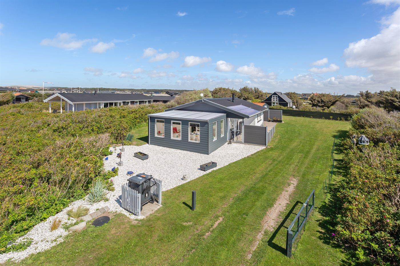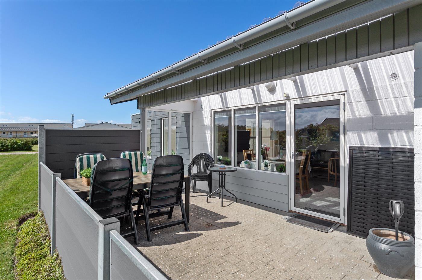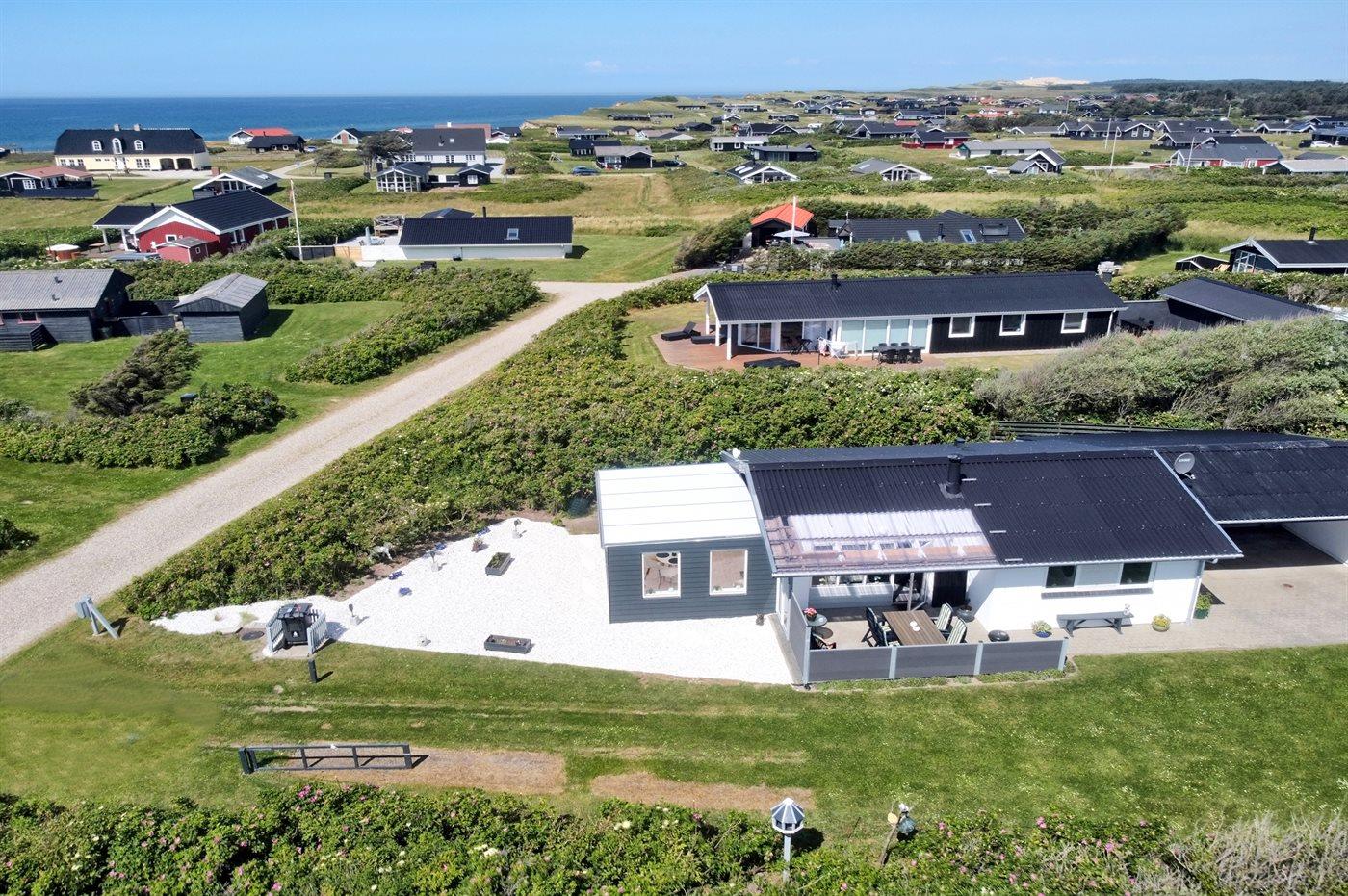 Ferieboligen er beliggende på en 1250 m² stor naturgrund. Der er 200 m til havet. Nærmeste forretning er beliggende i en afstand af 150 m. Desuden er der 10 m² overdækket terrasse. Til ferieboligen hører åbent terrasseareal. Grill til rådighed. Parkering ved ferieboligen.