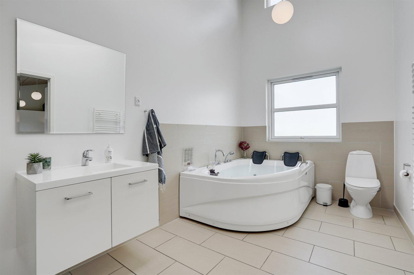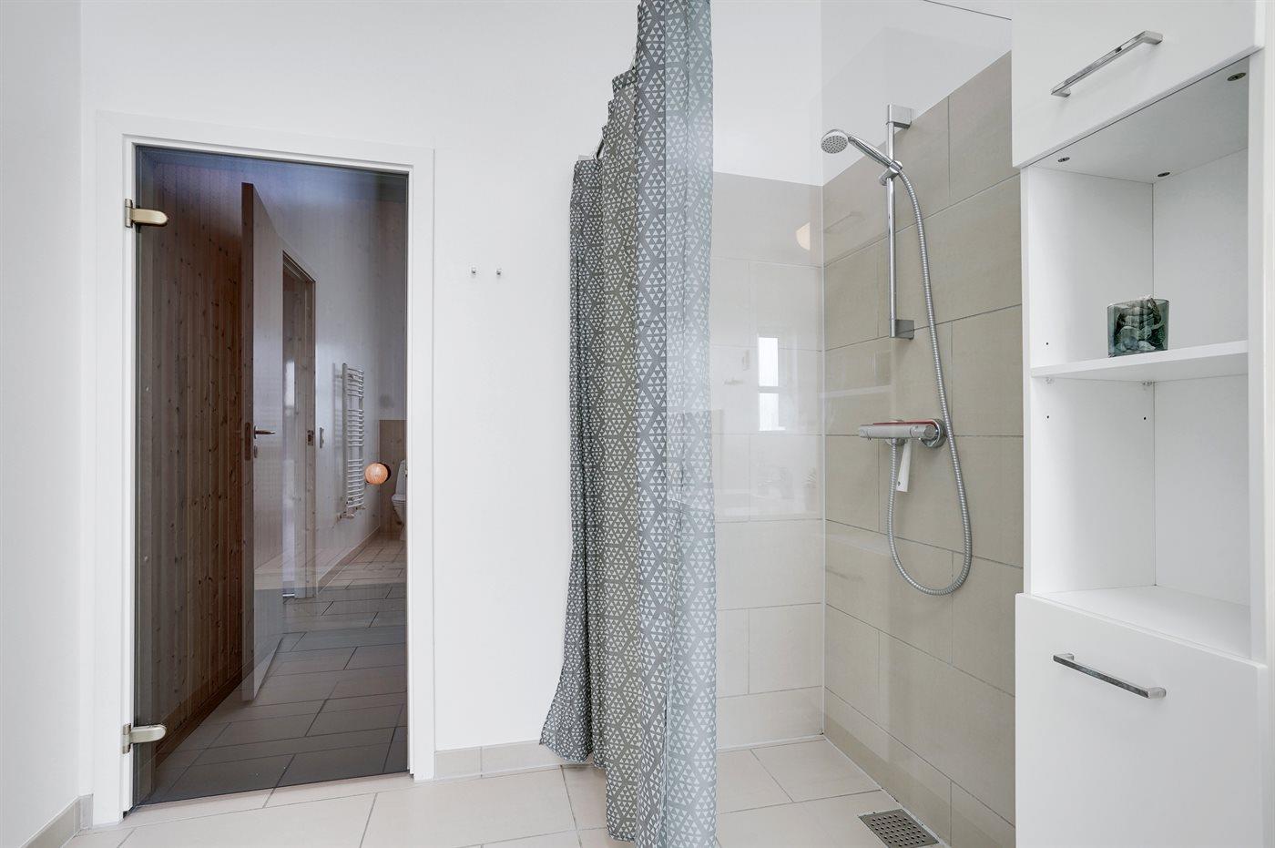 Der er 2 badeværelser med bruseniche og 2 toiletter. Der er gulvvarme på 2 badeværelser. I saunaen er der mulighed for afslapning.