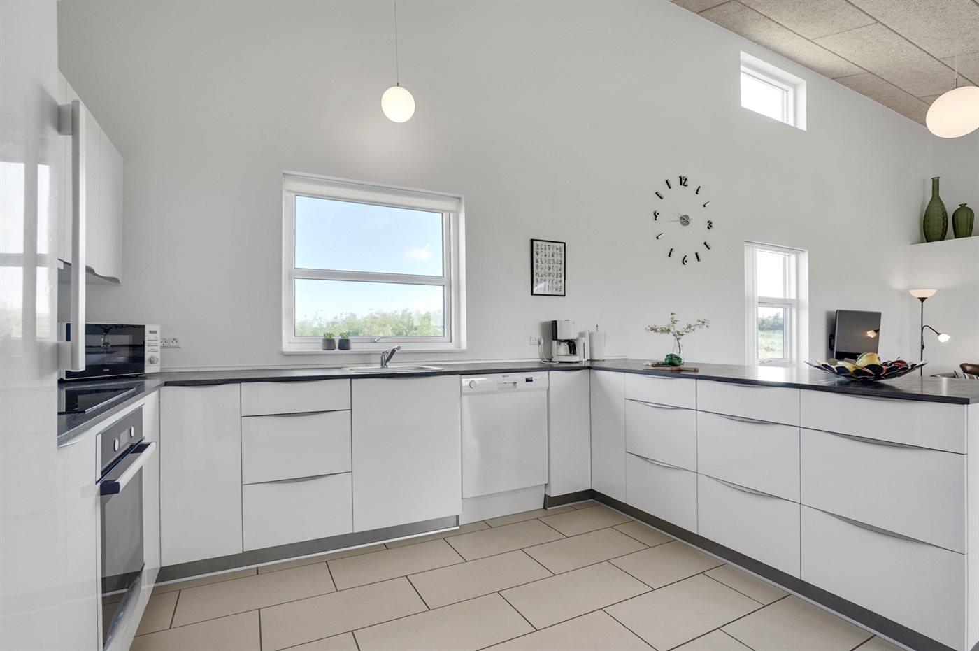 Køkkenet er udstyret med 1 køleskab. Der er 4 keramiske kogeplader, varmluftovn, mikrobølgeovn samt opvaskemaskine.