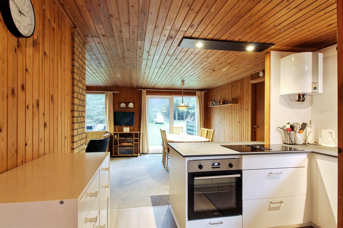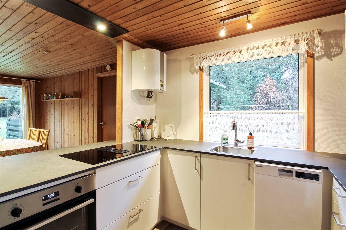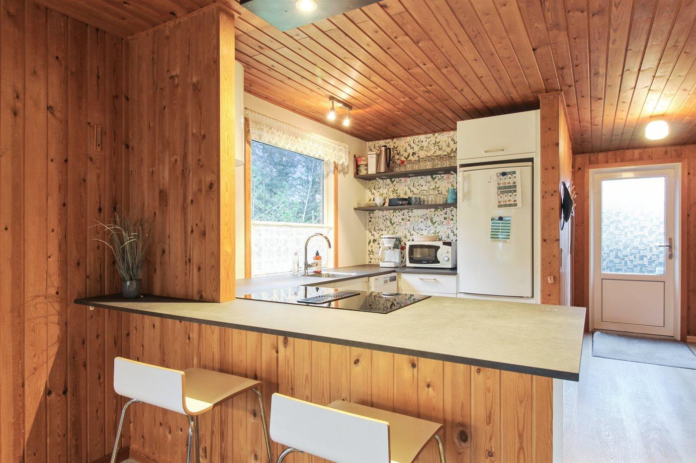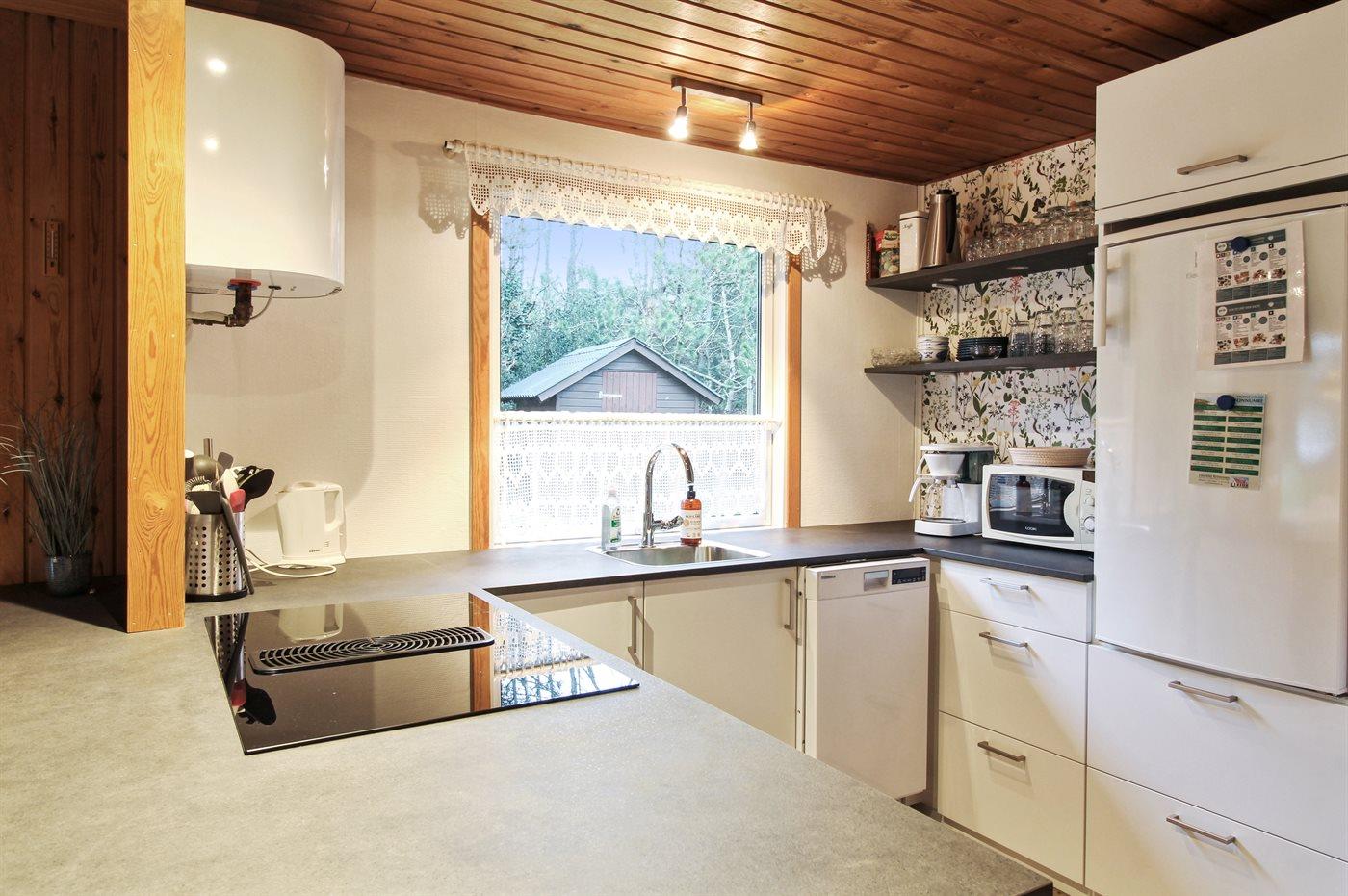 Køkkenet er udstyret med 1 køleskab. Der er 4 keramiske kogeplader, bageovn, mikrobølgeovn samt opvaskemaskine.