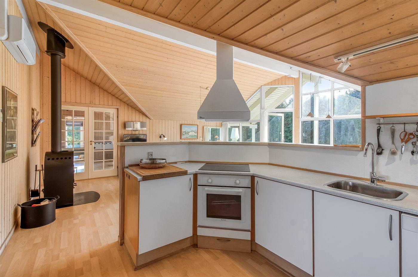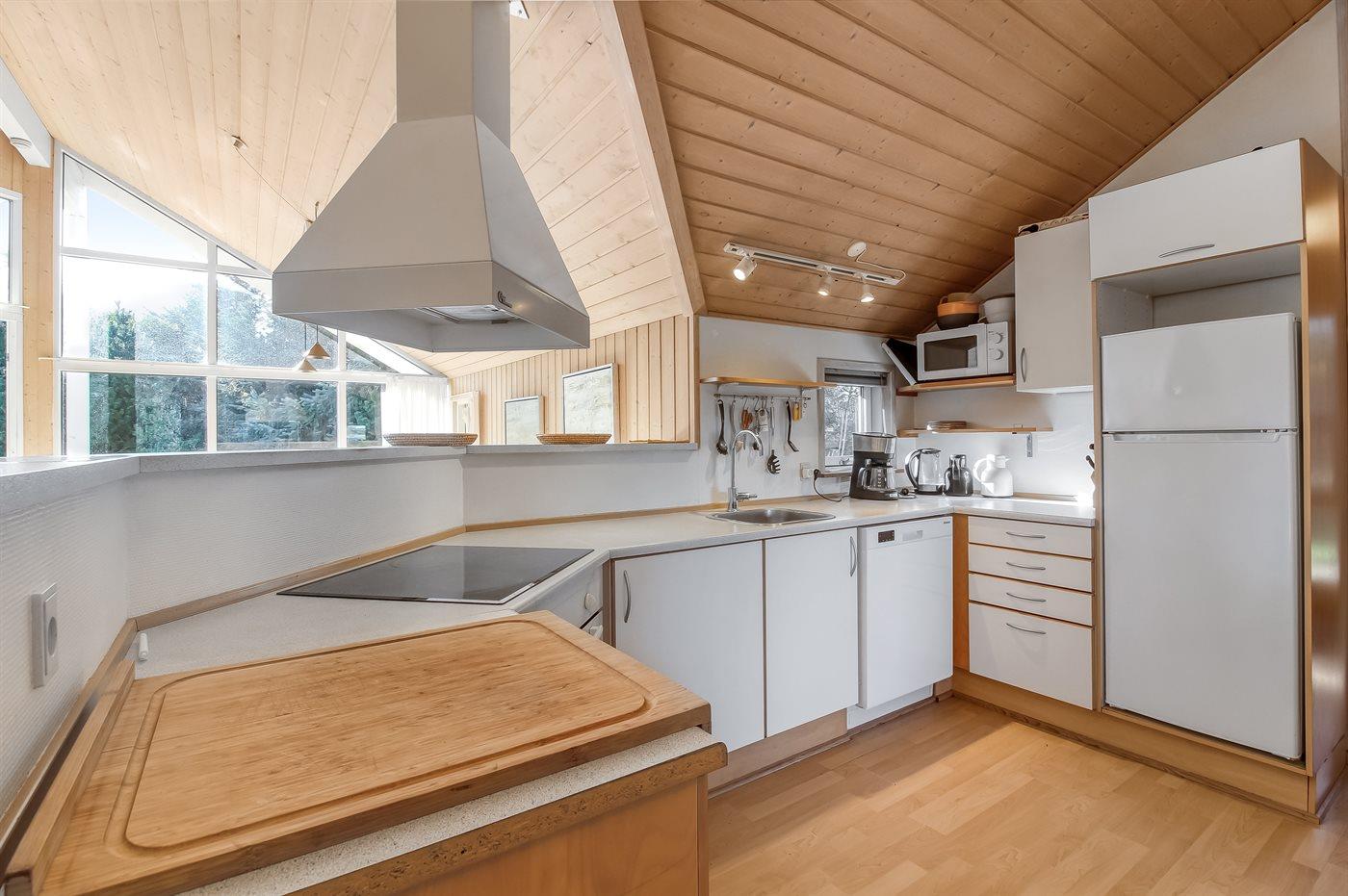 Køkkenet er udstyret med 1 køleskab. Der er 4 keramiske kogeplader, varmluftovn, mikrobølgeovn samt opvaskemaskine.