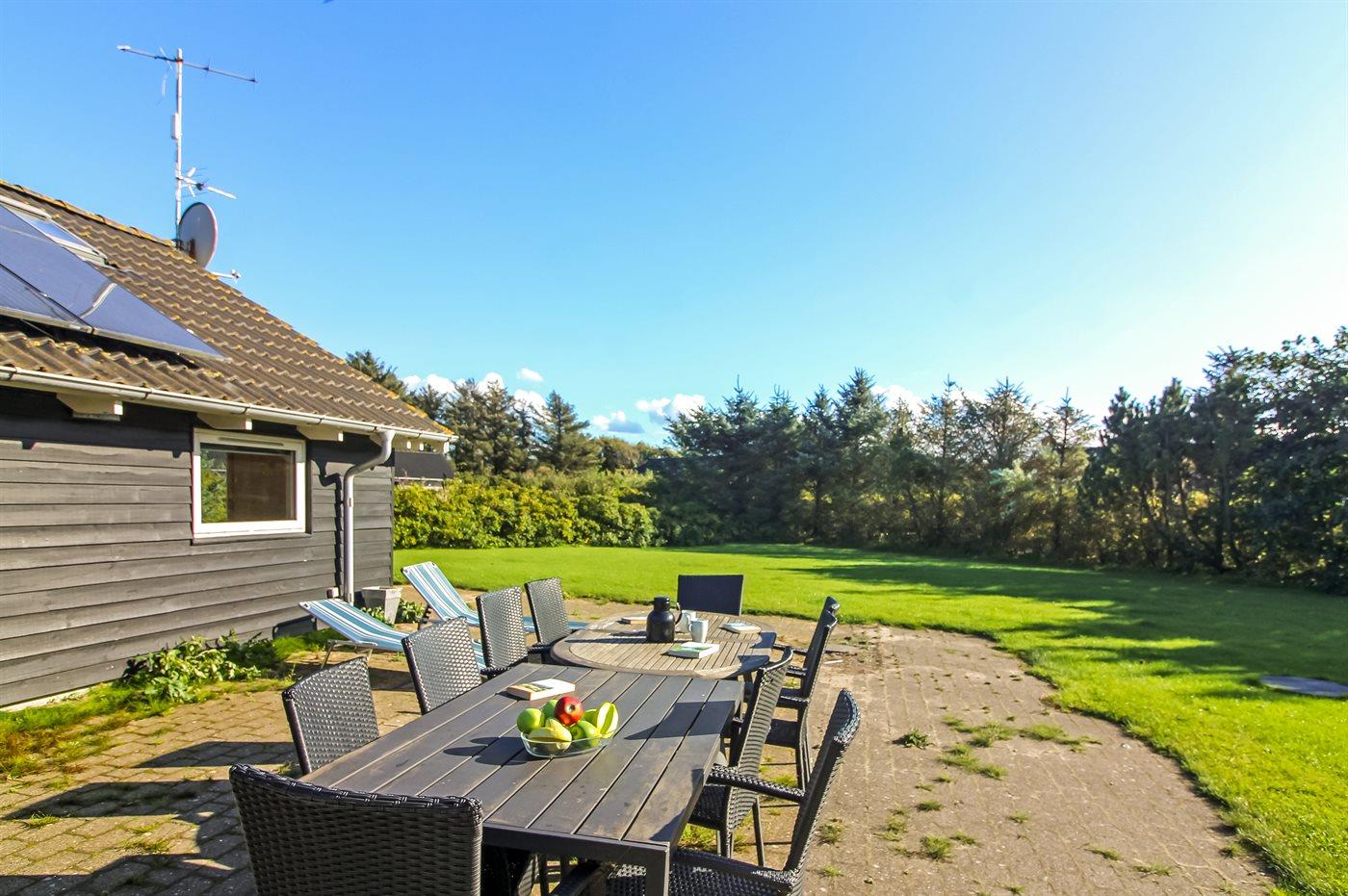 Ferieboligen er beliggende på en 1394 m² stor havegrund. Der er 600 m til havet. Nærmeste forretning er beliggende i en afstand af 5000 m. Til ferieboligen hører åbent terrasseareal. Desuden er der overdækket terrasse. Der er redskabsrum. Grill til rådighed. Parkering ved ferieboligen.