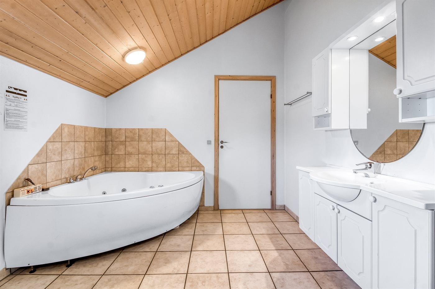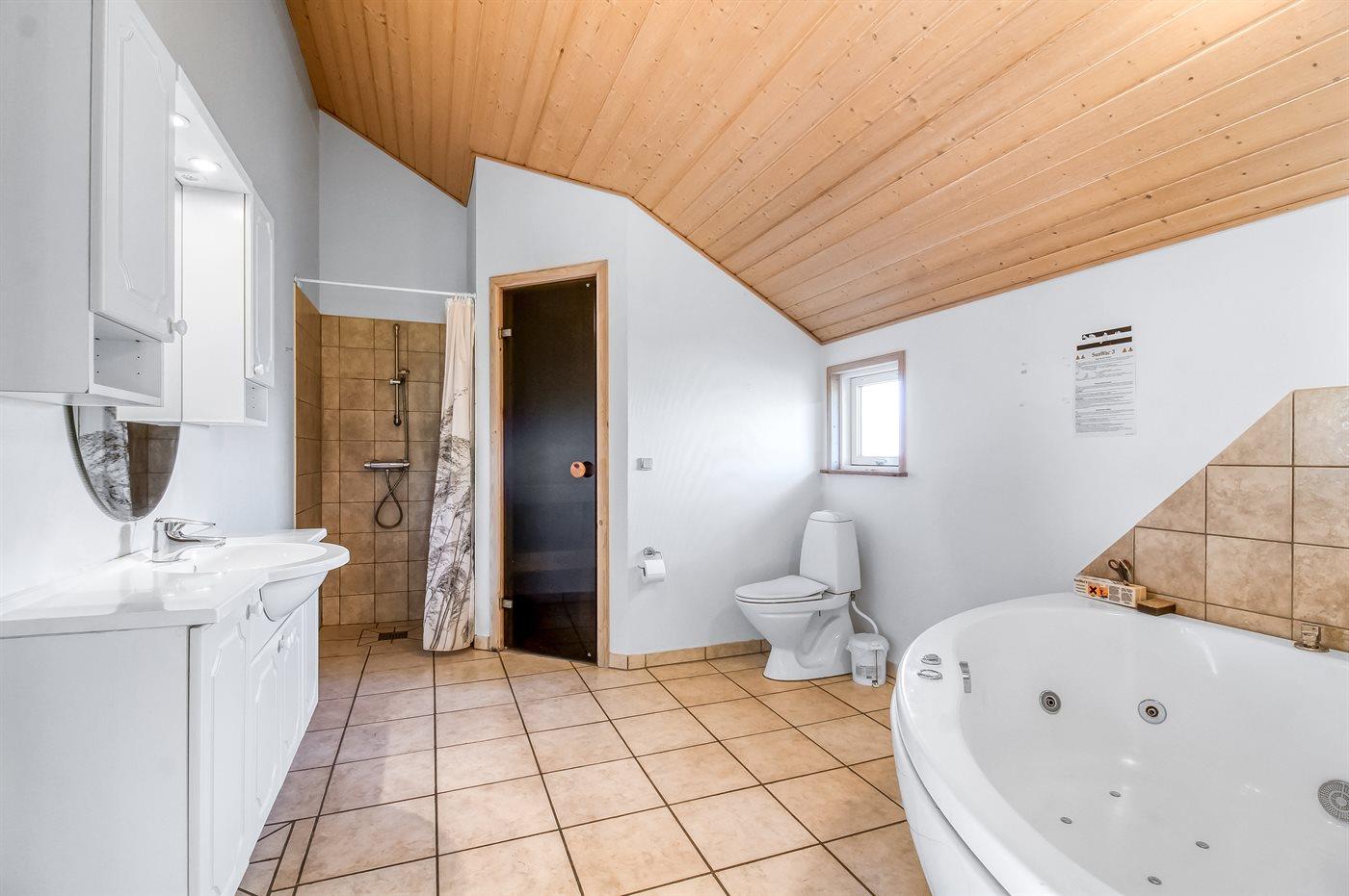 Der er 2 badeværelser med bruseniche og 2 toiletter. Der er gulvvarme på 2 badeværelser. I saunaen er der mulighed for afslapning.
