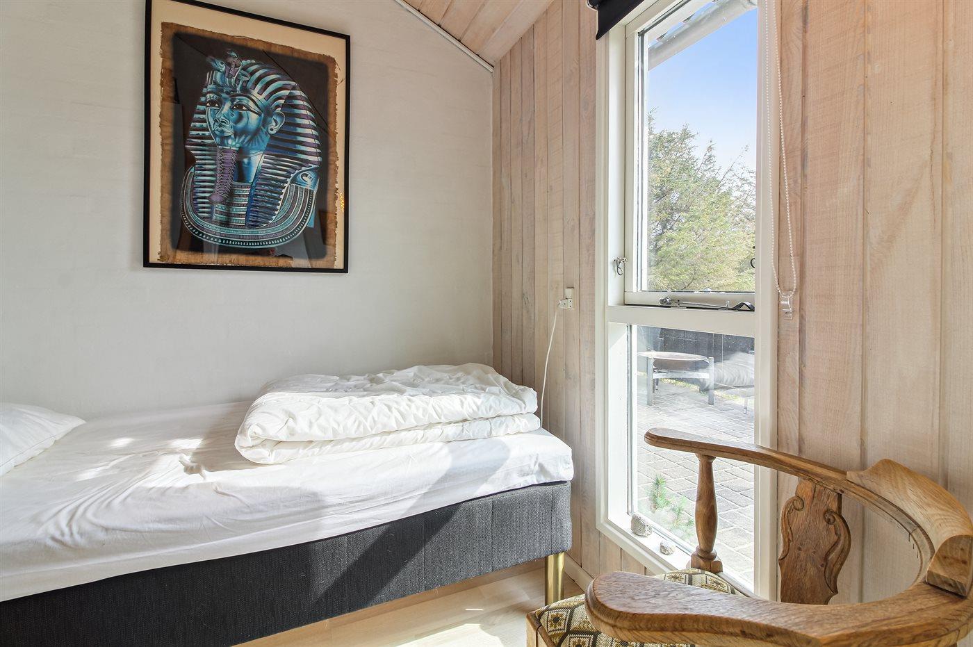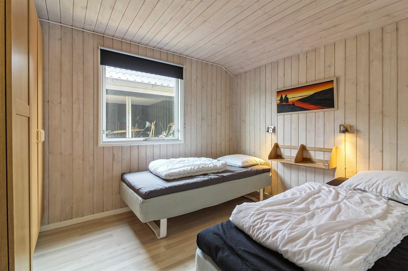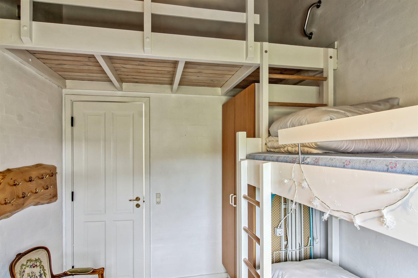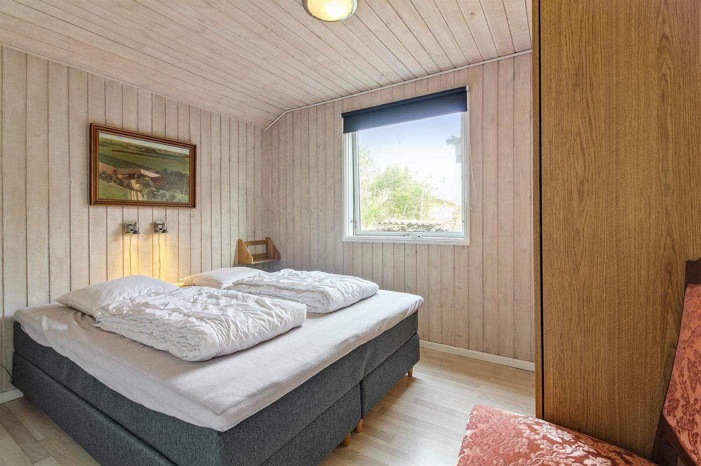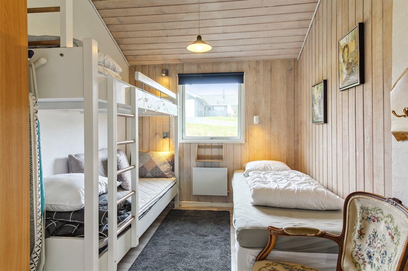 Der er i alt 4 soveværelser. Sovepladserne fordeler sig på: 2 sovepladser i dobbeltseng. 4 sovepladser i enkeltsenge. 2 sovepladser i køjeseng. 2 sovepladser på madrasser. 2 af disse sovepladser befinder sig på husets hems.