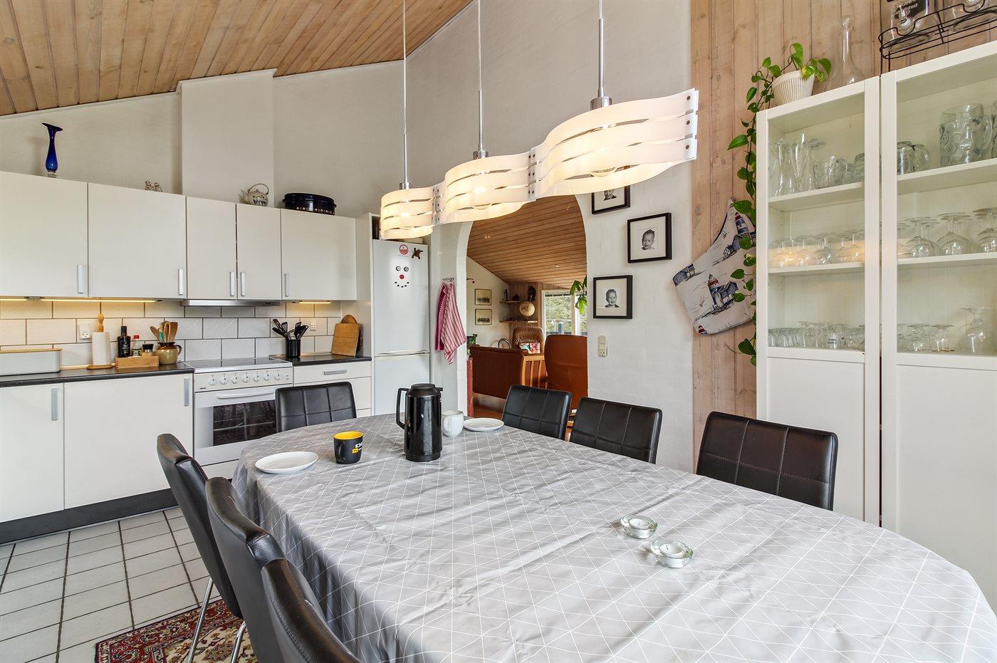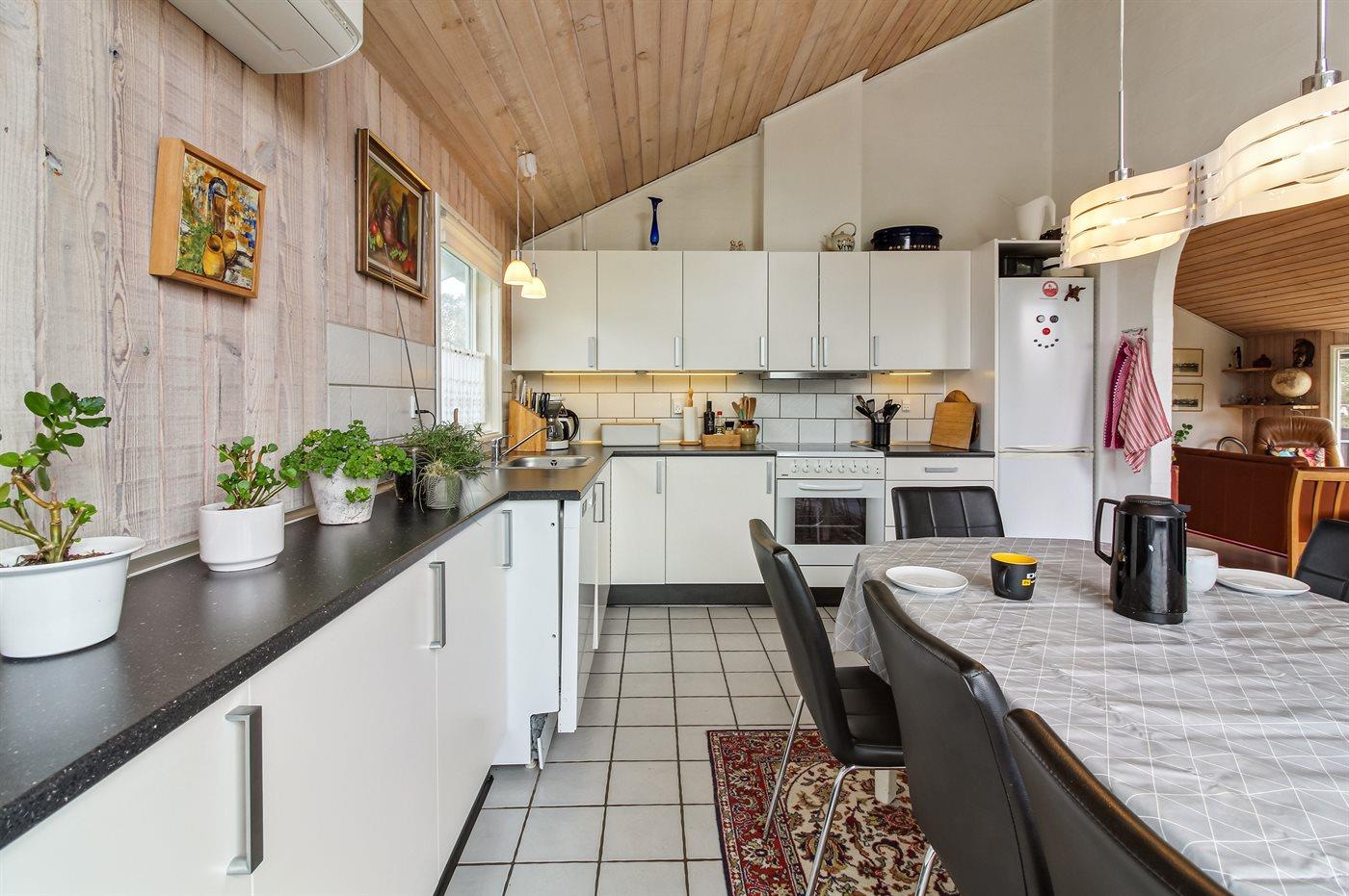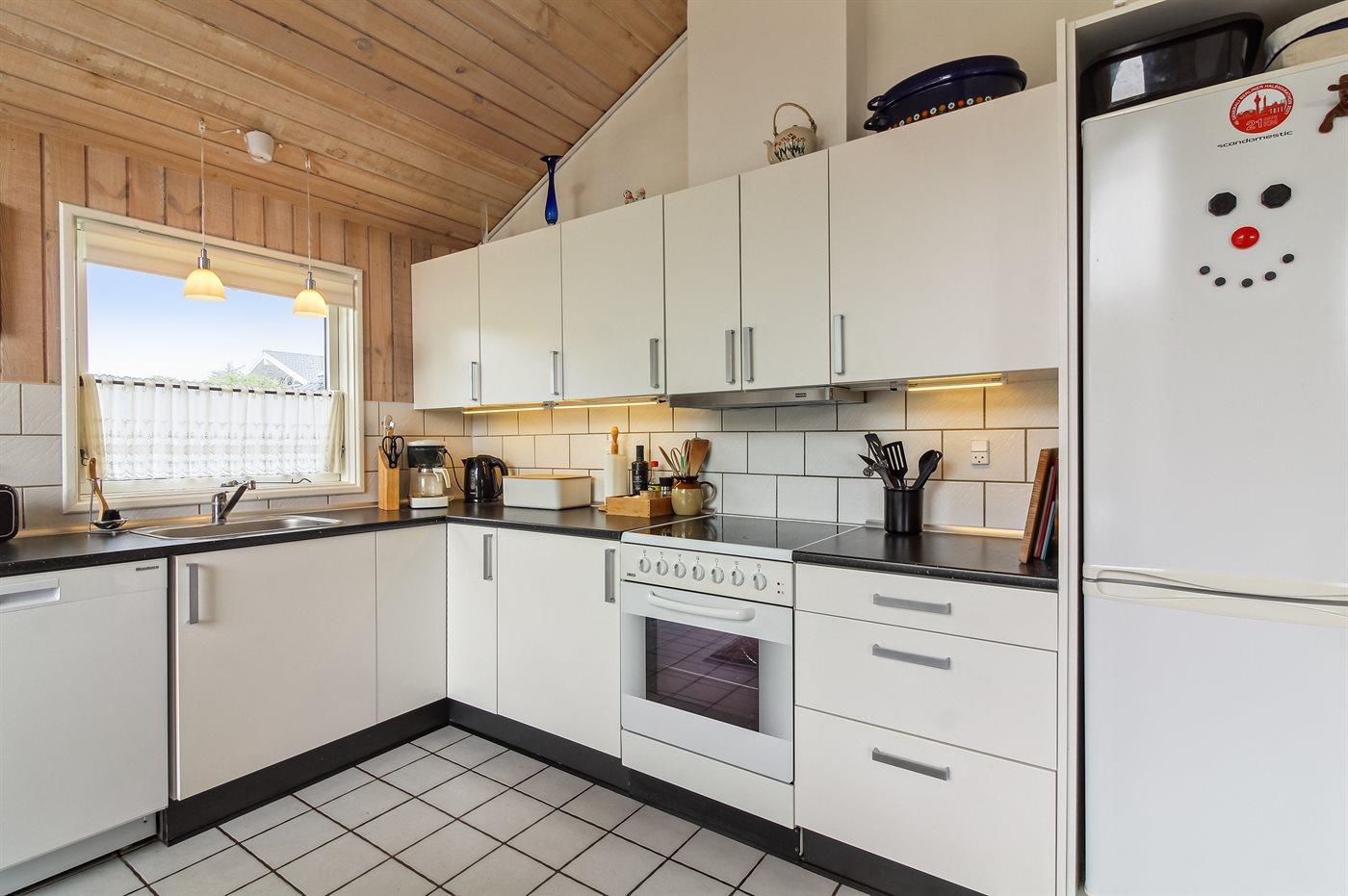 Køkkenet er udstyret med 1 køleskab. Der er 4 keramiske kogeplader, varmluftovn, mikrobølgeovn samt opvaskemaskine.