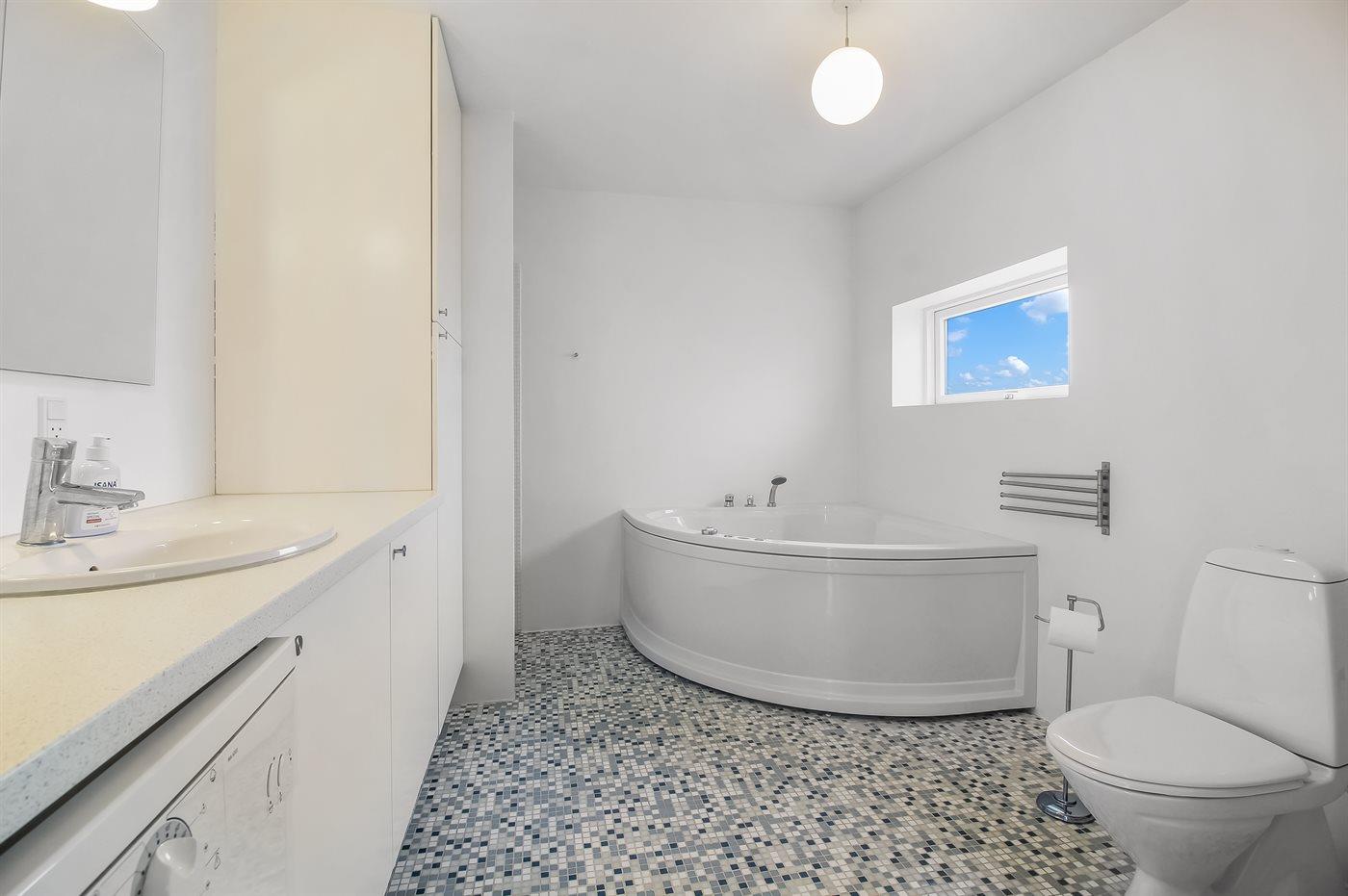 Der er 1 badeværelse med bruseniche og 2 toiletter, heraf 1 gæstetoilet. Der er gulvvarme på 1 badeværelse. I saunaen er der mulighed for afslapning.