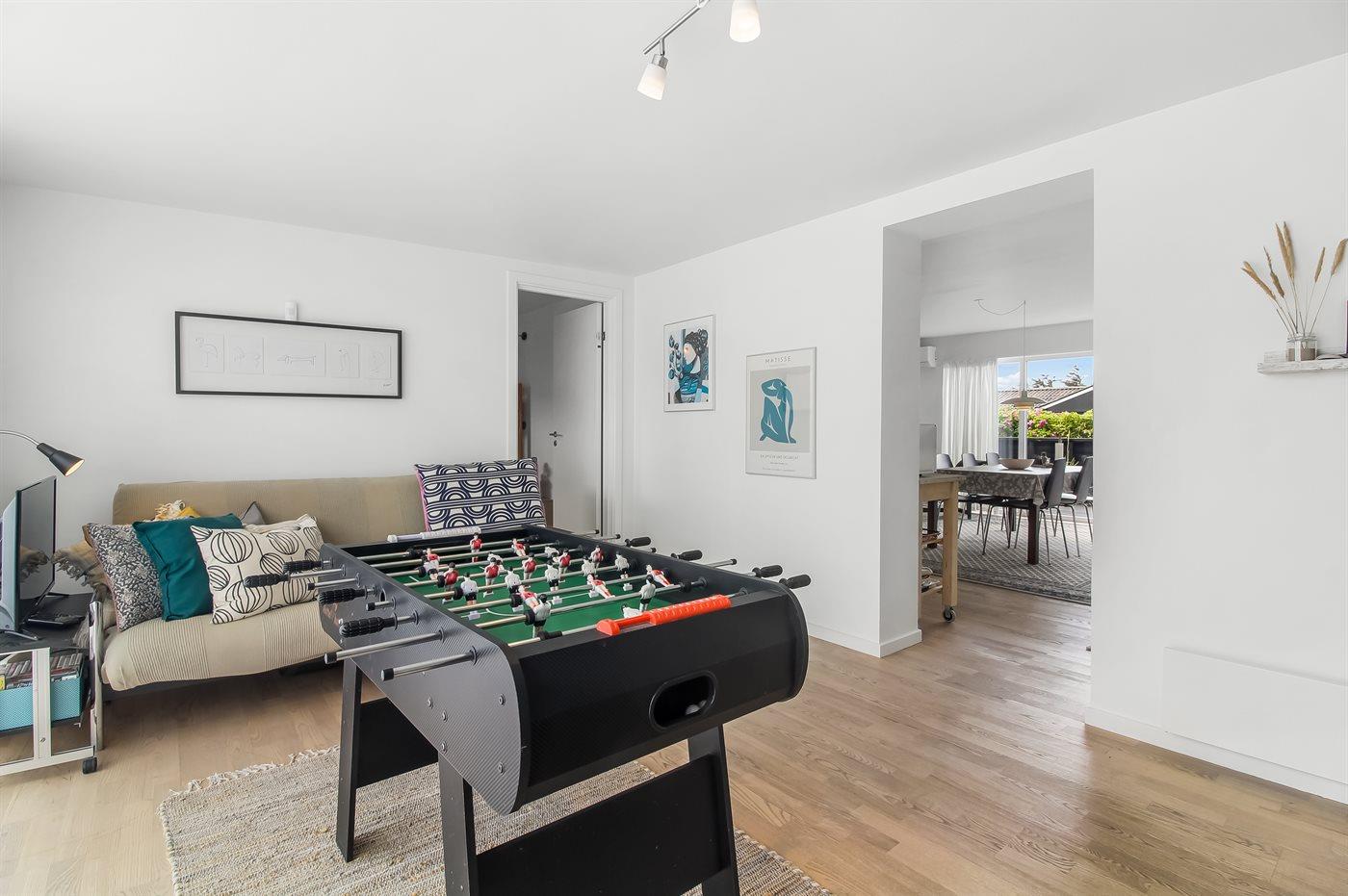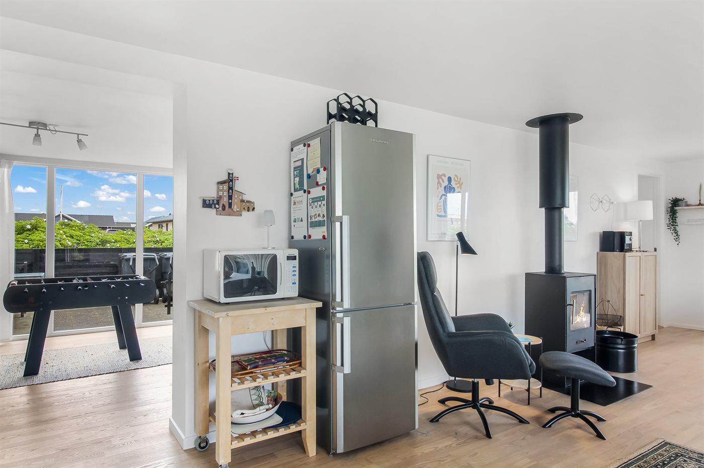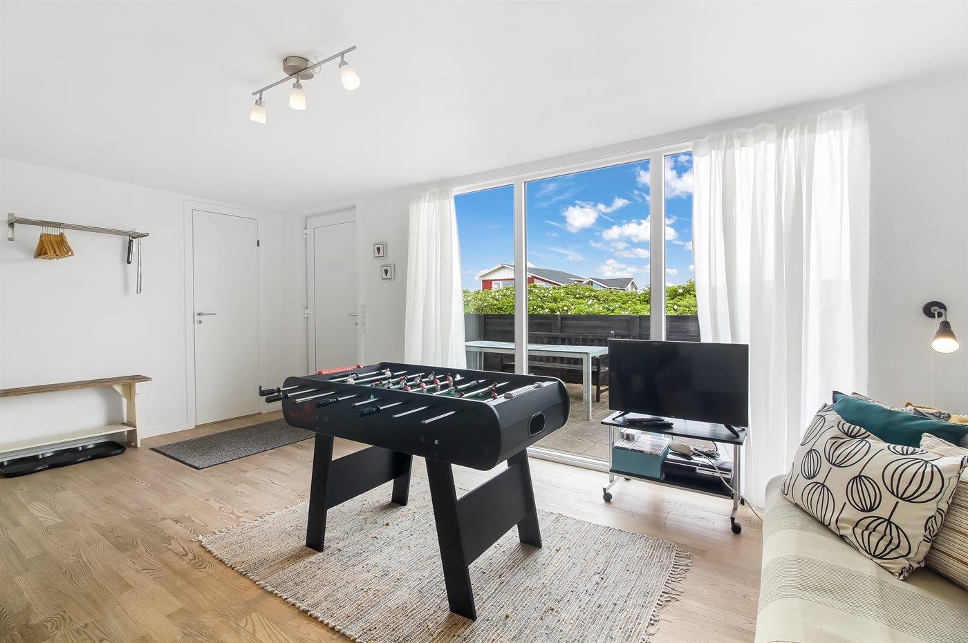 Skulle det være en kold sommerdag, så kan man krybe ind i sofaen og nyde brændeovnens varme eller tage et spil ved spisebordet. Skal det være lidt mere action så er der også bordfodbold i huset.