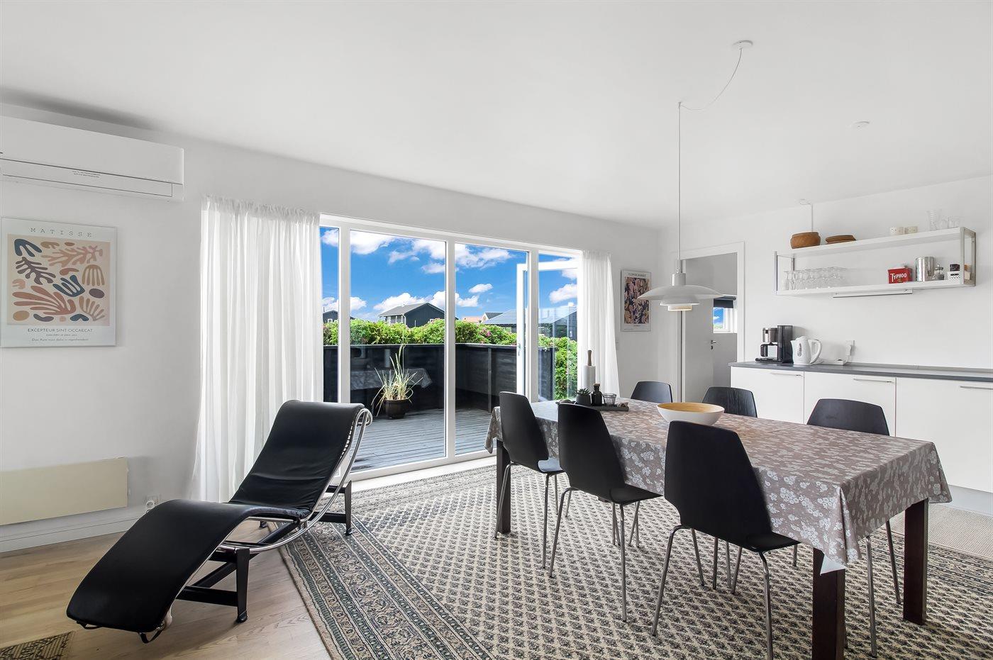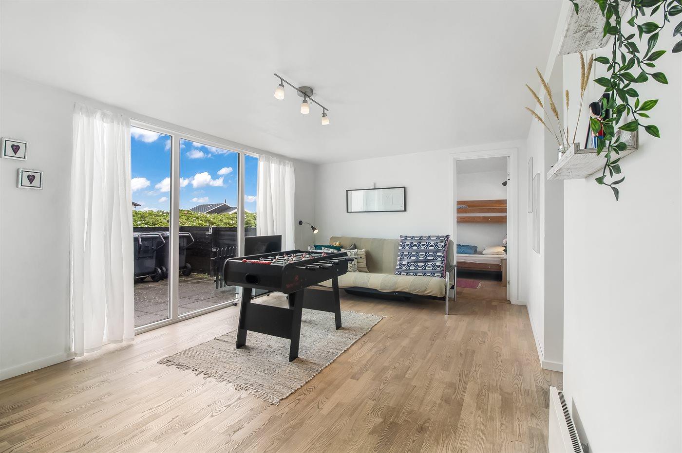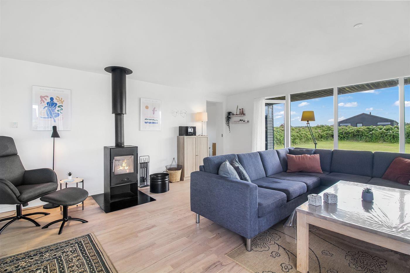Skulle det være en kold sommerdag, så kan man krybe ind i sofaen og nyde brændeovnens varme eller tage et spil ved spisebordet. Skal det være lidt mere action så er der også bordfodbold i huset.