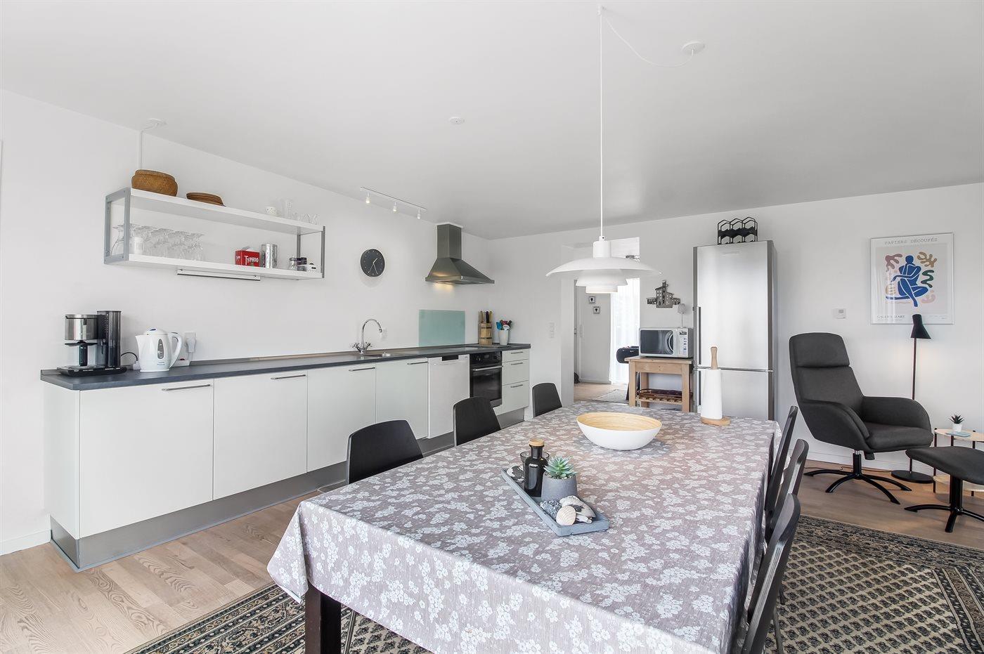 Køkkenet er udstyret med 1 køleskab. Der er 4 keramiske kogeplader, varmluftovn, mikrobølgeovn samt opvaskemaskine.