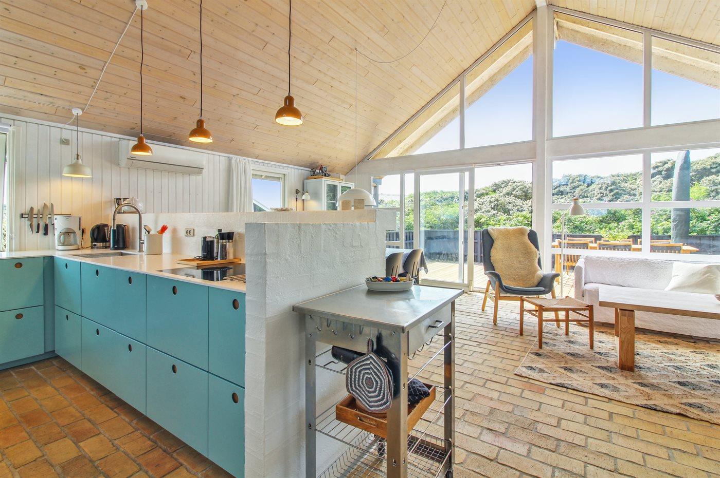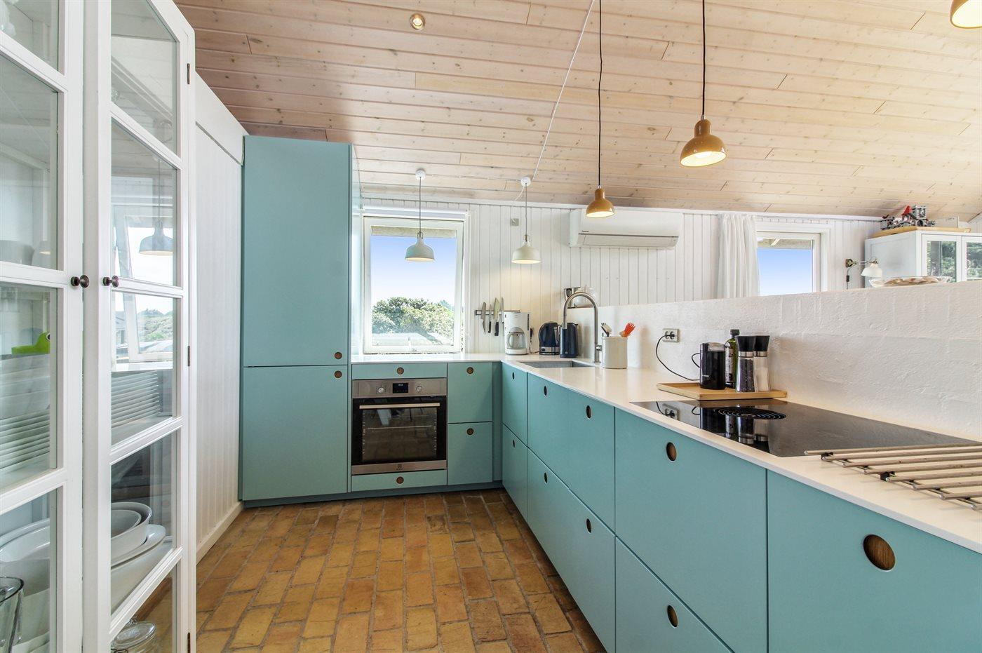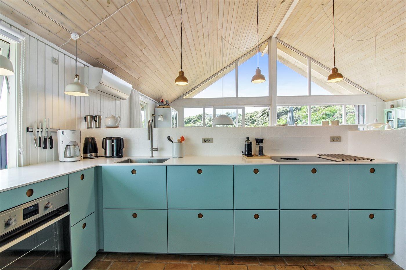 Køkkenet er udstyret med 1 køleskab. Der er 4 keramiske kogeplader, varmluftovn, mikrobølgeovn samt opvaskemaskine.