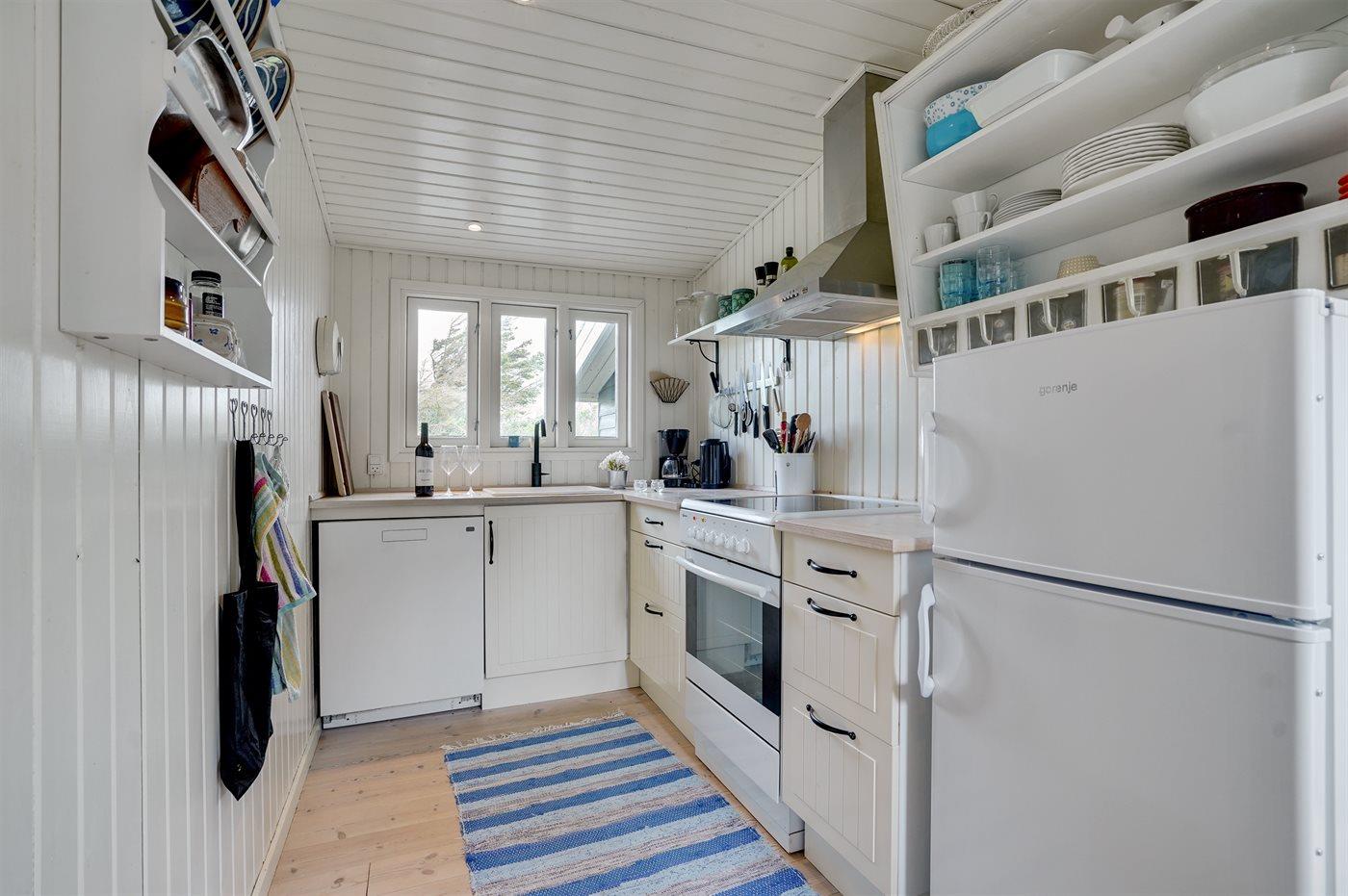Køkkenet er udstyret med 1 køleskab. Der er 4 keramiske kogeplader, varmluftovn samt opvaskemaskine.