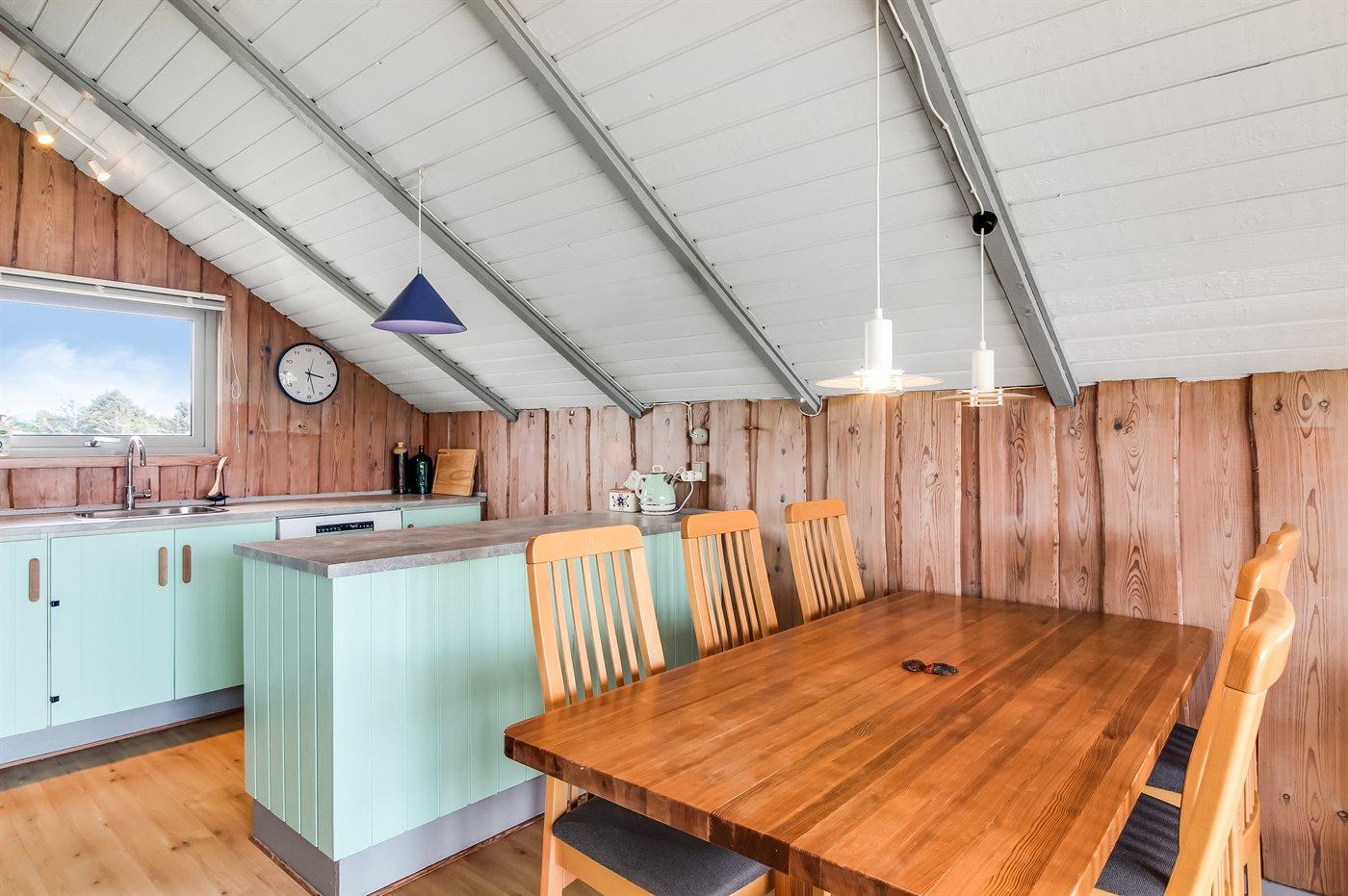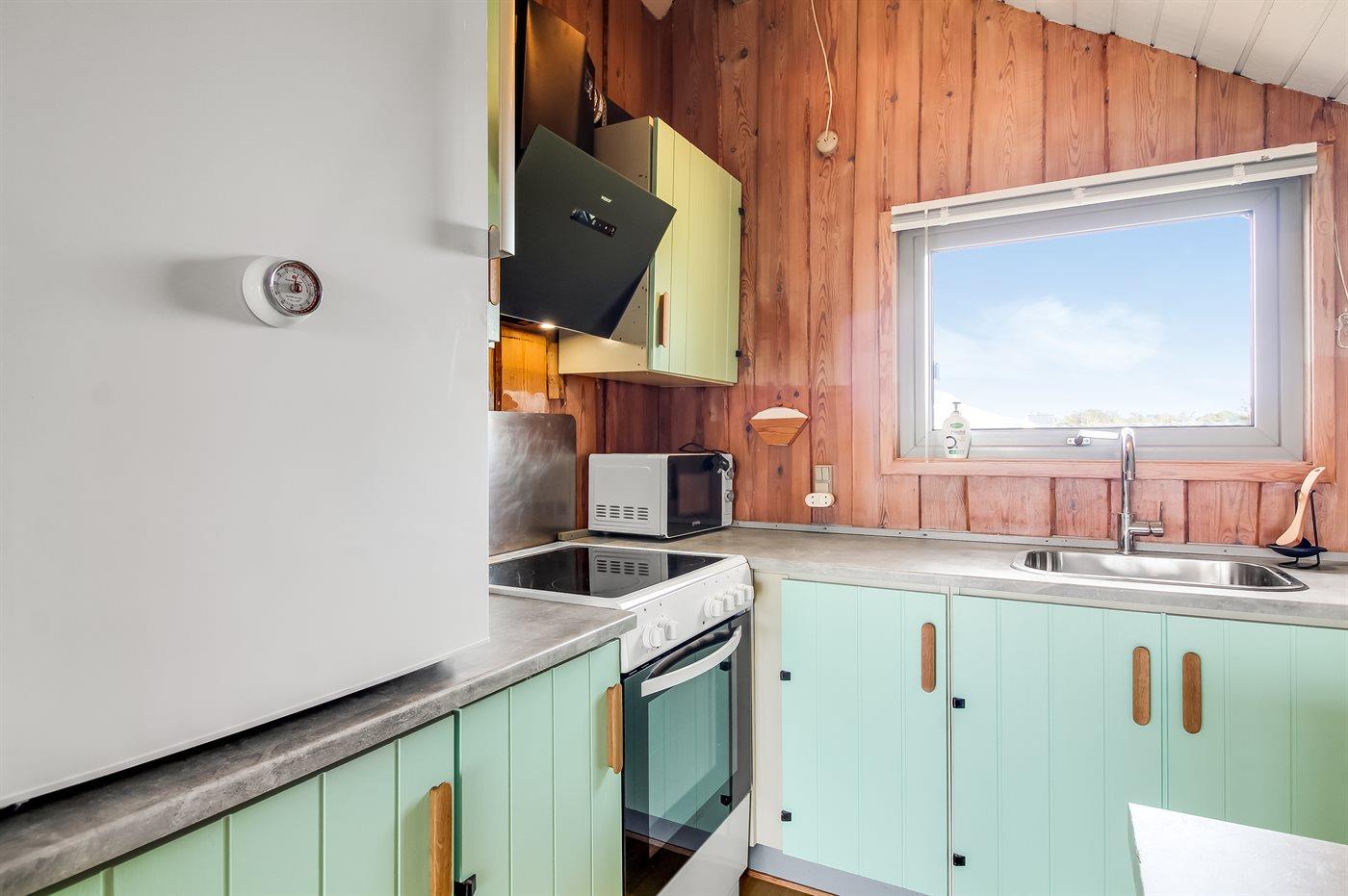 Køkkenet er udstyret med 1 køleskab. Der er 4 keramiske kogeplader, varmluftovn, mikrobølgeovn samt opvaskemaskine.