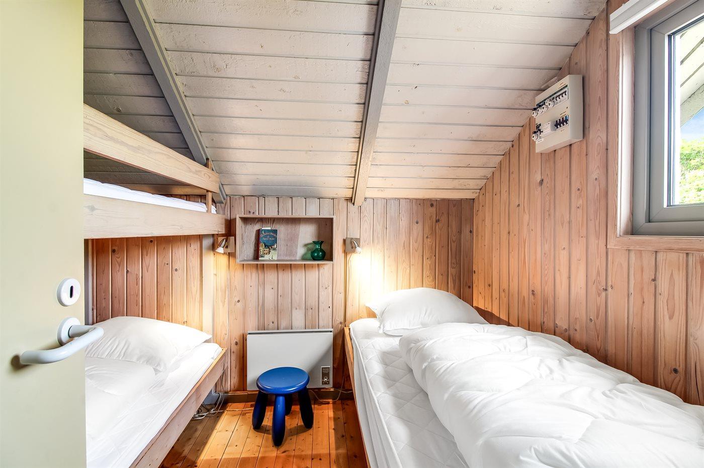 Der er i alt 2 soveværelser. Sovepladserne fordeler sig på: 2 sovepladser i dobbeltseng. 1 soveplads i enkeltseng. 2 sovepladser i køjeseng. Derudover er der 1 stk. barneseng.