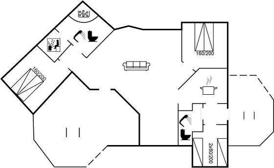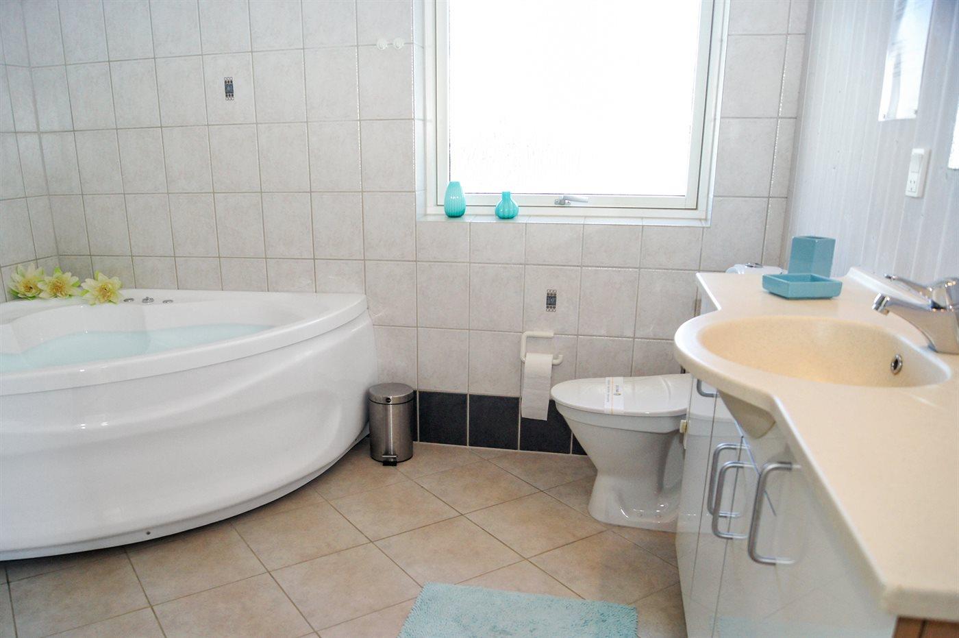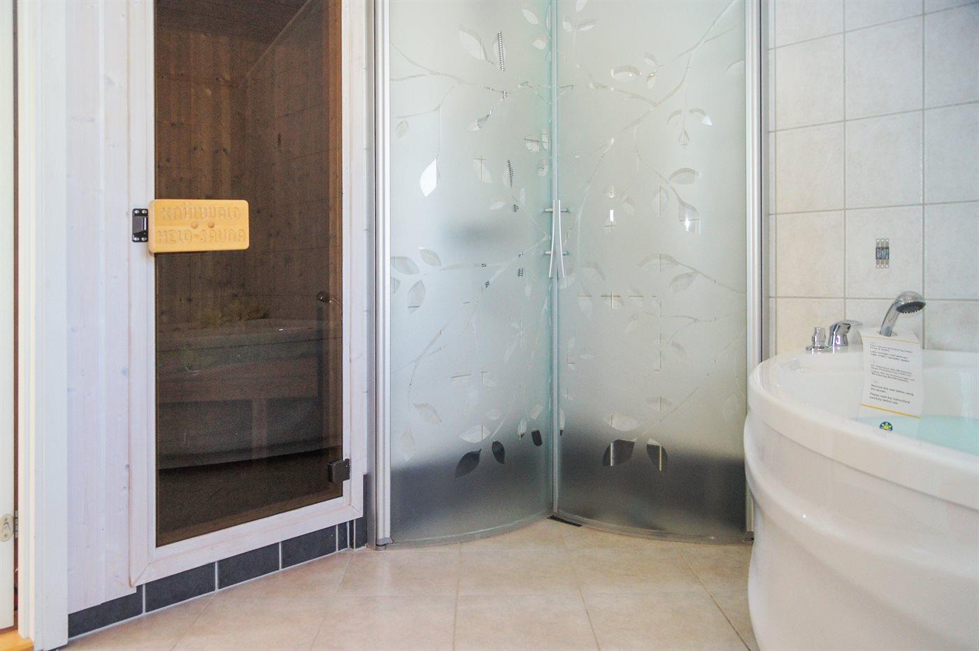 Der er 2 badeværelser med bruseniche og 2 toiletter. Der er gulvvarme på 2 badeværelser. I saunaen er der mulighed for afslapning.