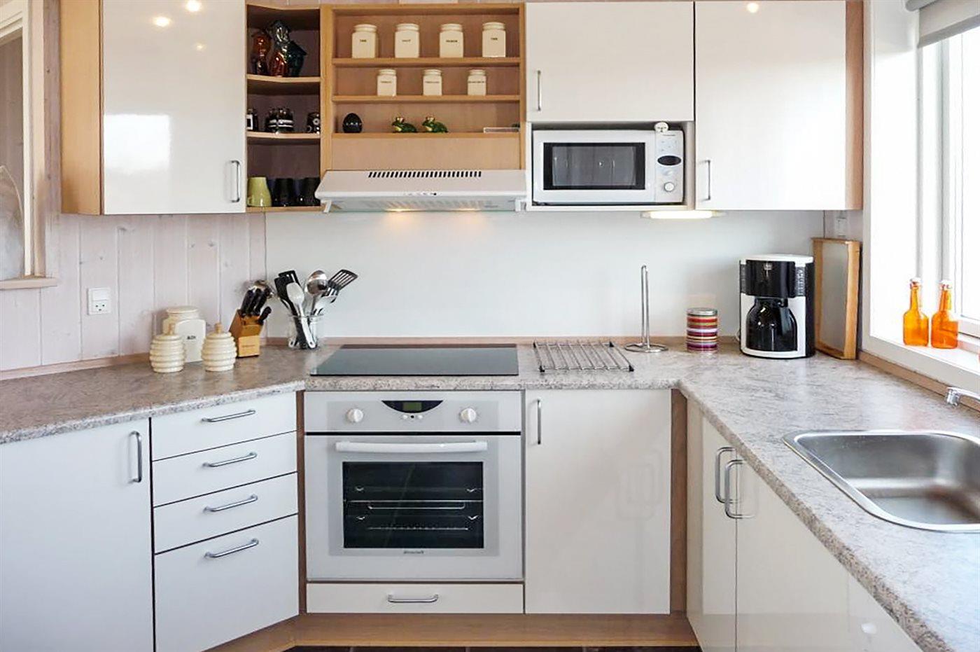 Køkkenet er udstyret med 1 køleskab. Der er 4 keramiske kogeplader, varmluftovn, mikrobølgeovn samt opvaskemaskine.