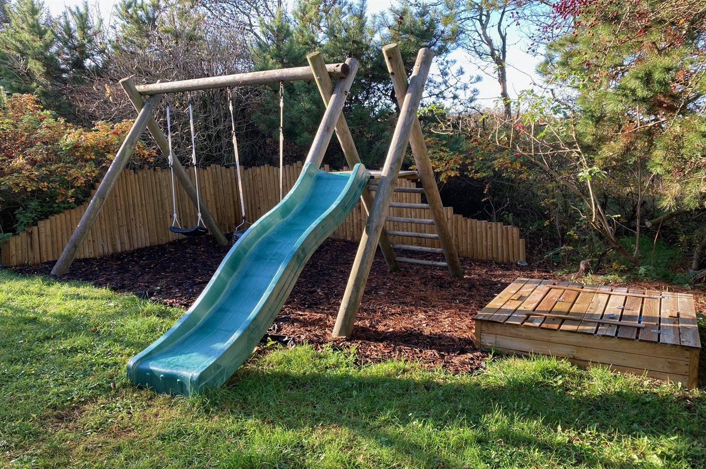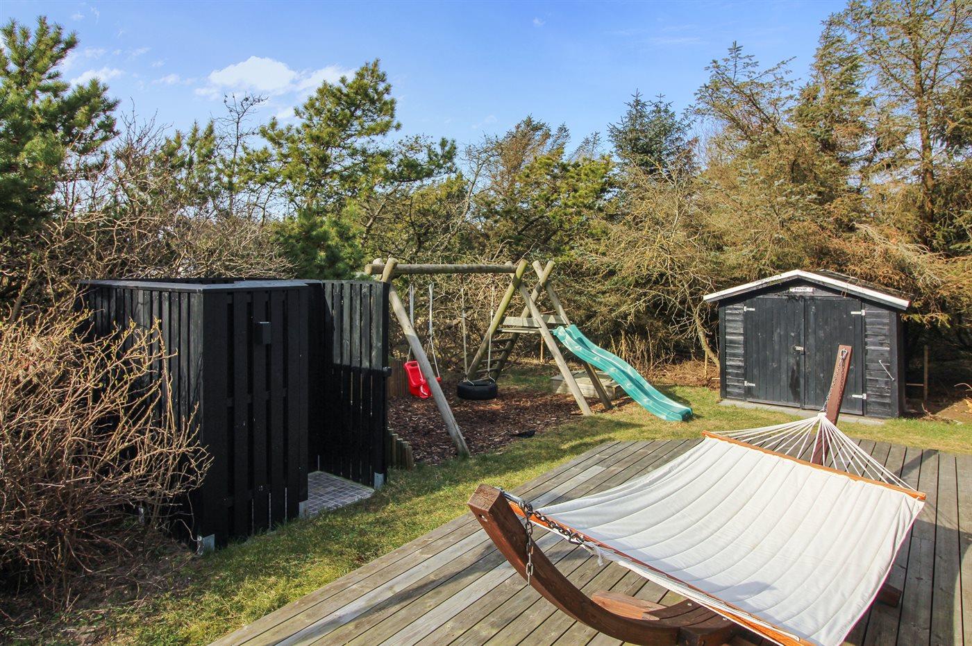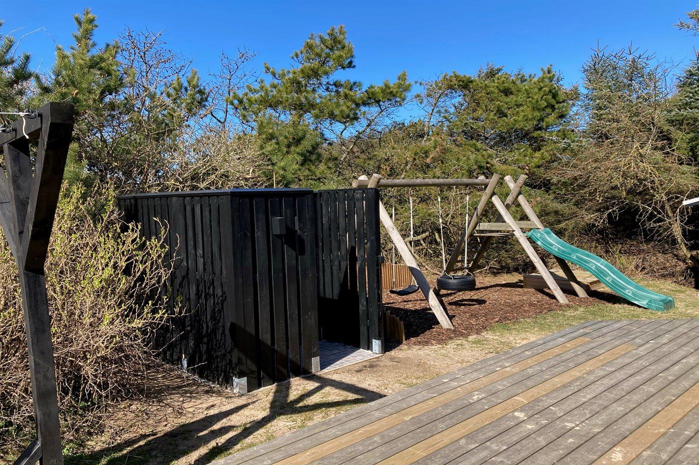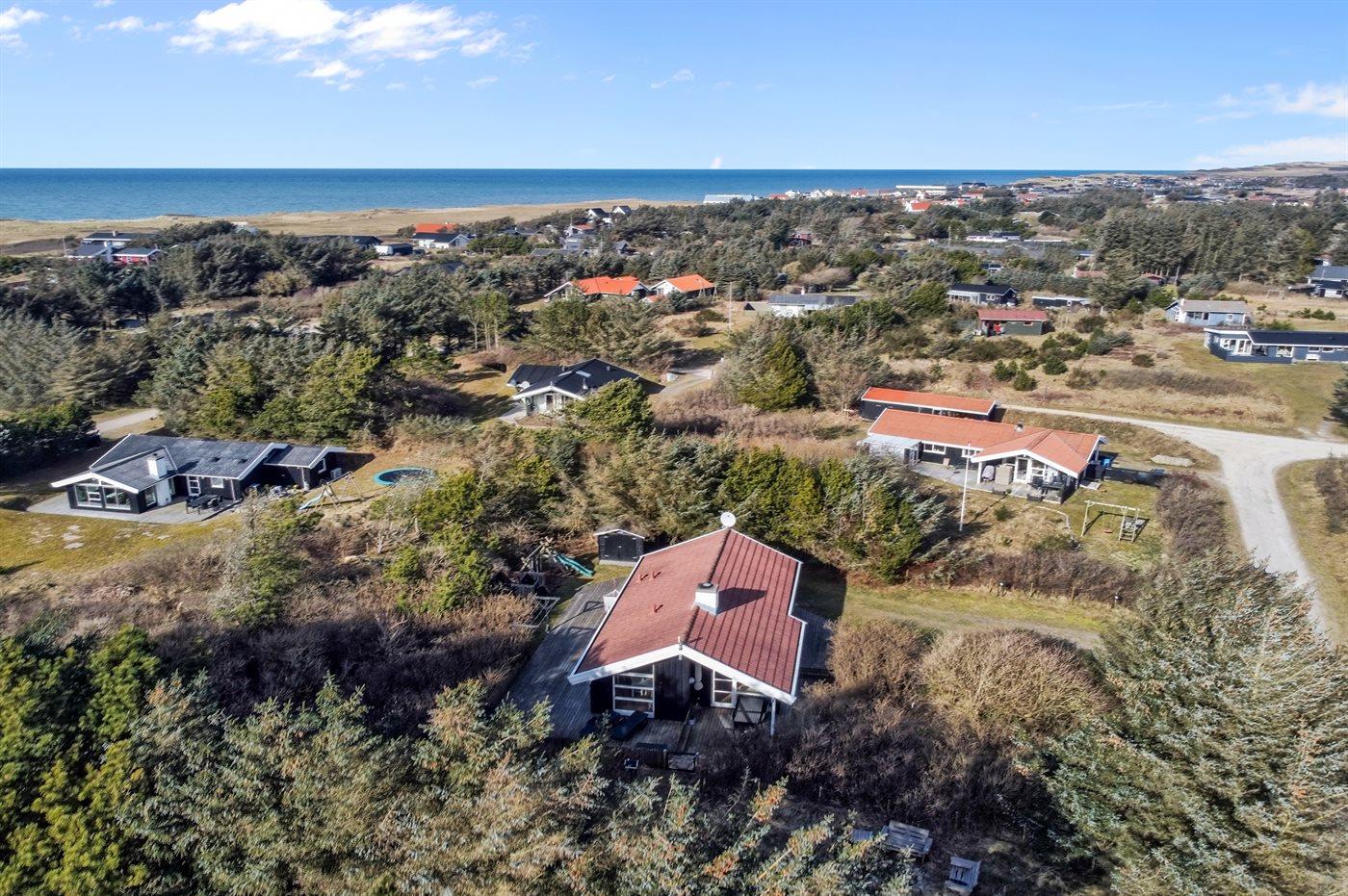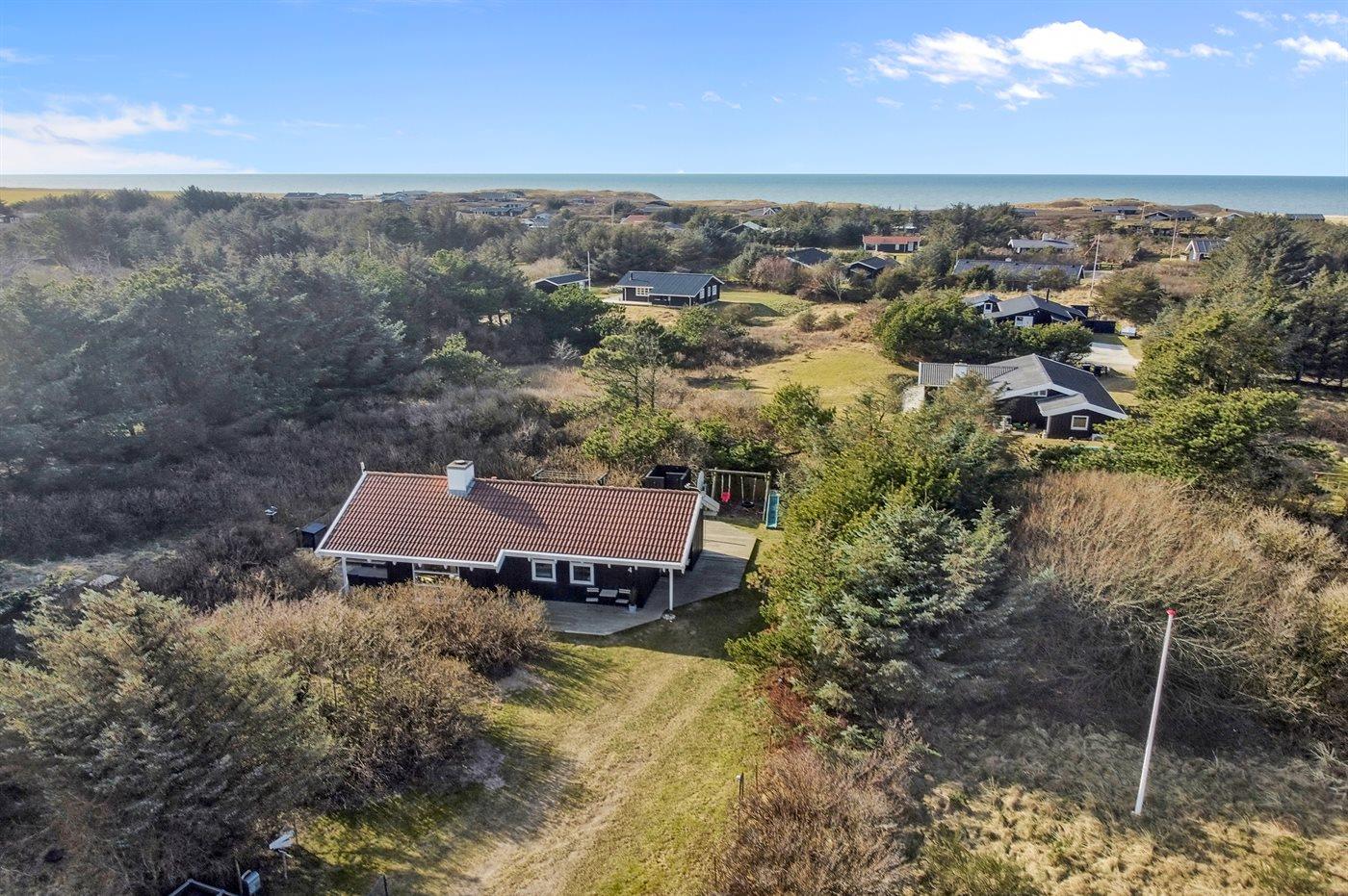 Ferieboligen er beliggende på en 1400 m² stor naturgrund. Grunden er indhegnet. Der er 300 m til havet. Nærmeste forretning er beliggende i en afstand af 5000 m. Til ferieboligen hører 80 m² terrasseareal. Desuden er der 8 m² overdækket terrasse. Der er redskabsrum. Der findes gyngestativ med 2 gynger og rutchebane. Sandkasse. Bålsted. Udendørs bruser. Der er installeret stik til opladning af elbil. Parkering ved ferieboligen.