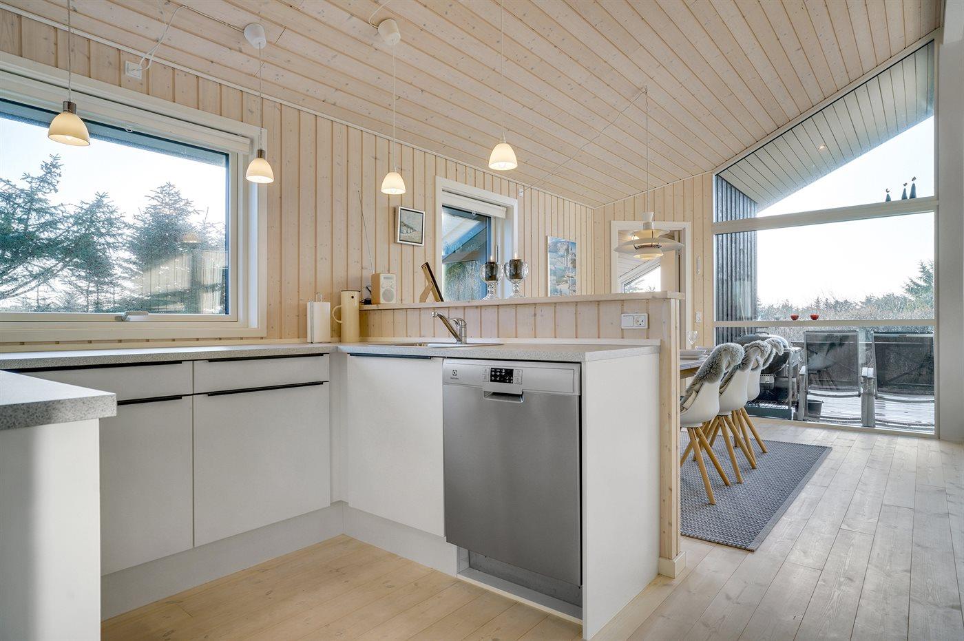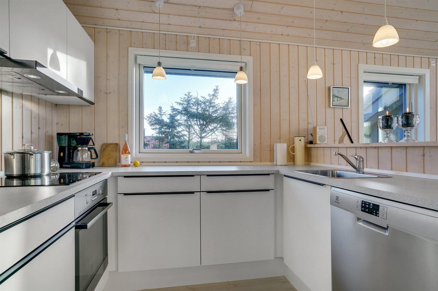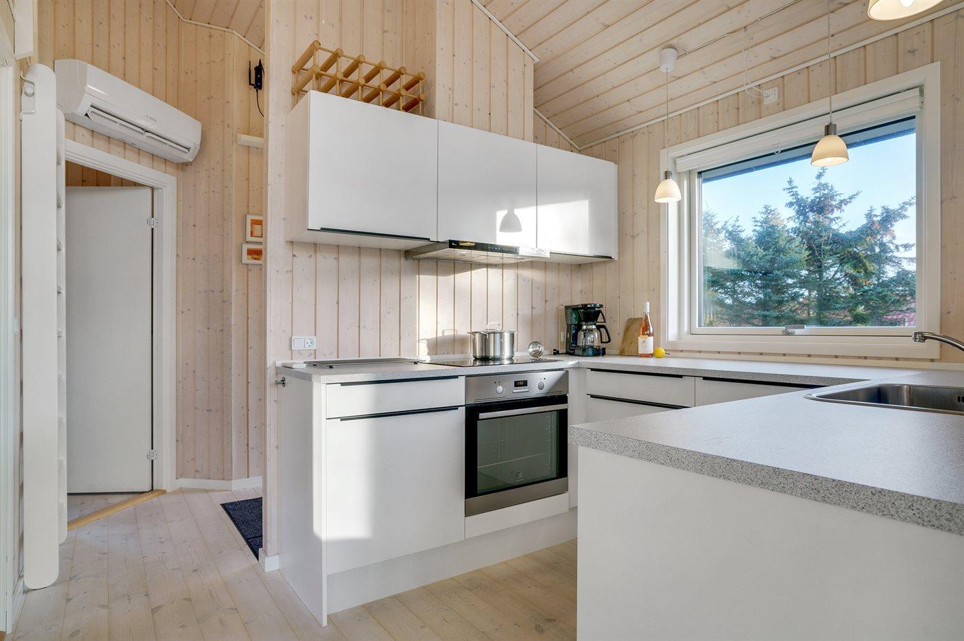 Køkkenet er udstyret med 1 køleskab. Der er 4 induktionskogeplader, varmluftovn, mikrobølgeovn samt opvaskemaskine.