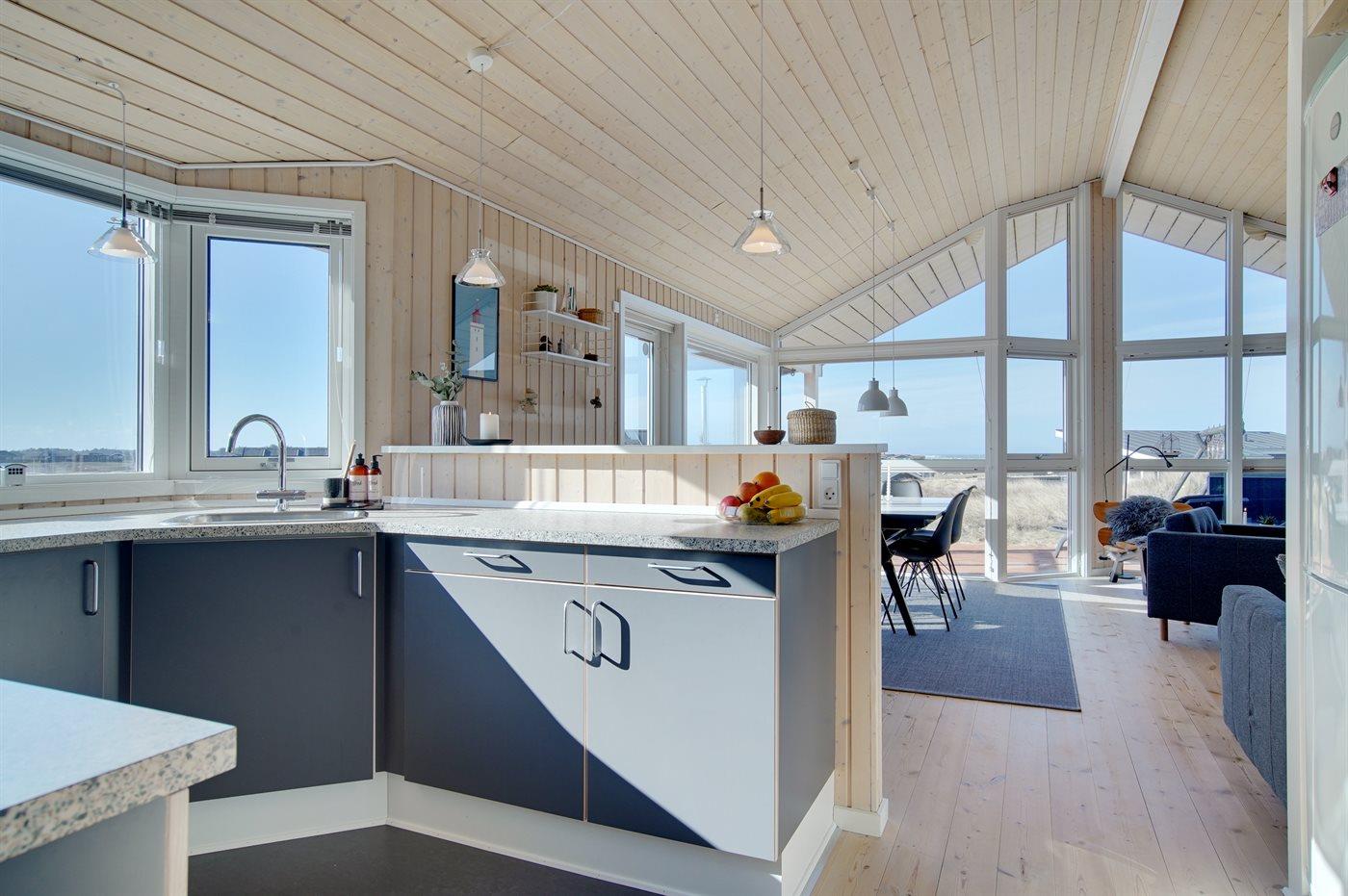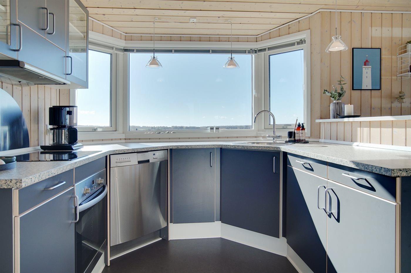 Køkkenet er udstyret med 1 køleskab. Der er 4 keramiske kogeplader, varmluftovn samt opvaskemaskine.