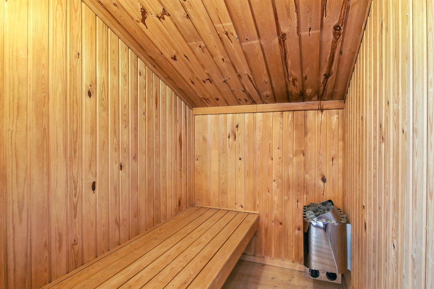 Der er 1 badeværelse med bruser og 1 toilet.. Der er gulvvarme på 1 badeværelse. I saunaen er der mulighed for afslapning.