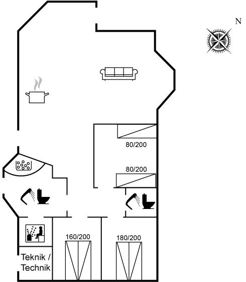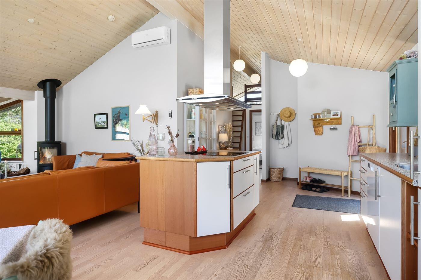 Køkkenet er udstyret med 1 køleskab. Der er 4 induktionskogeplader, varmluftovn, mikrobølgeovn samt opvaskemaskine.