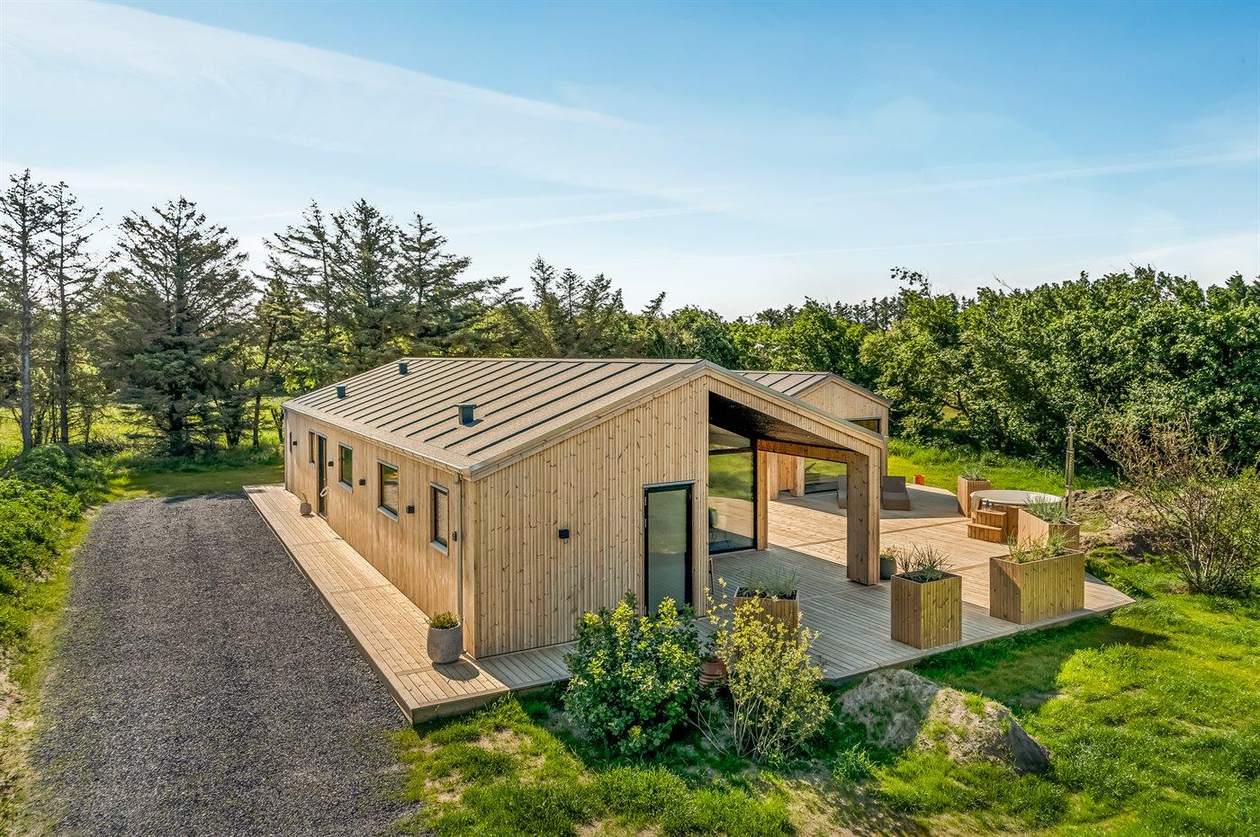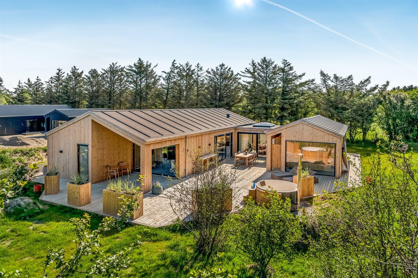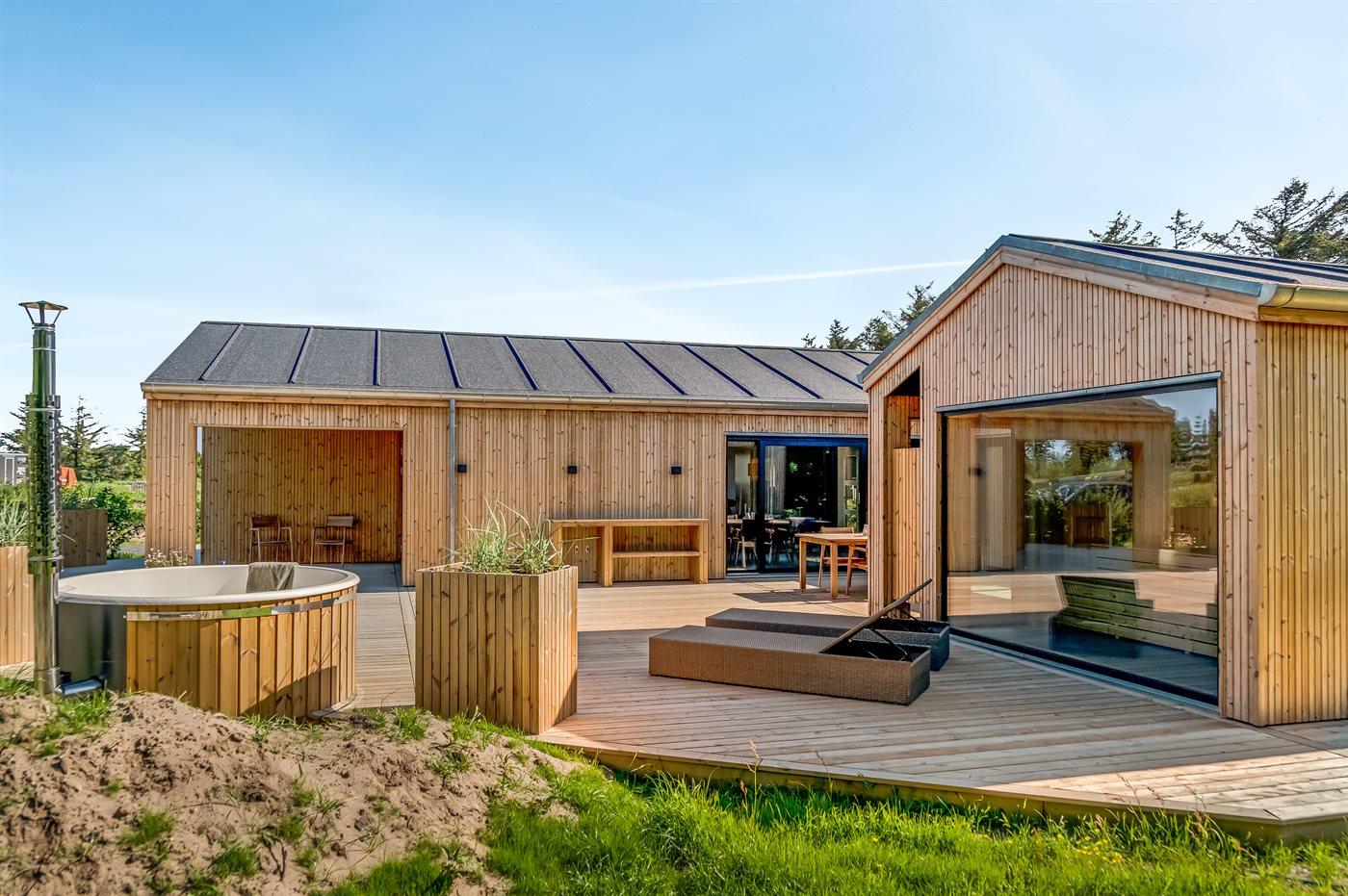 Nybygget sommerhus i Løkken med plads til 10 personer, aktivitetsrum og spa i naturskønne omgivelser.