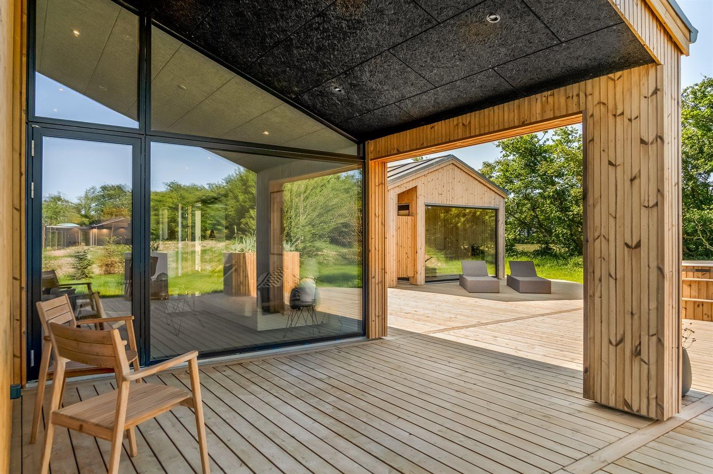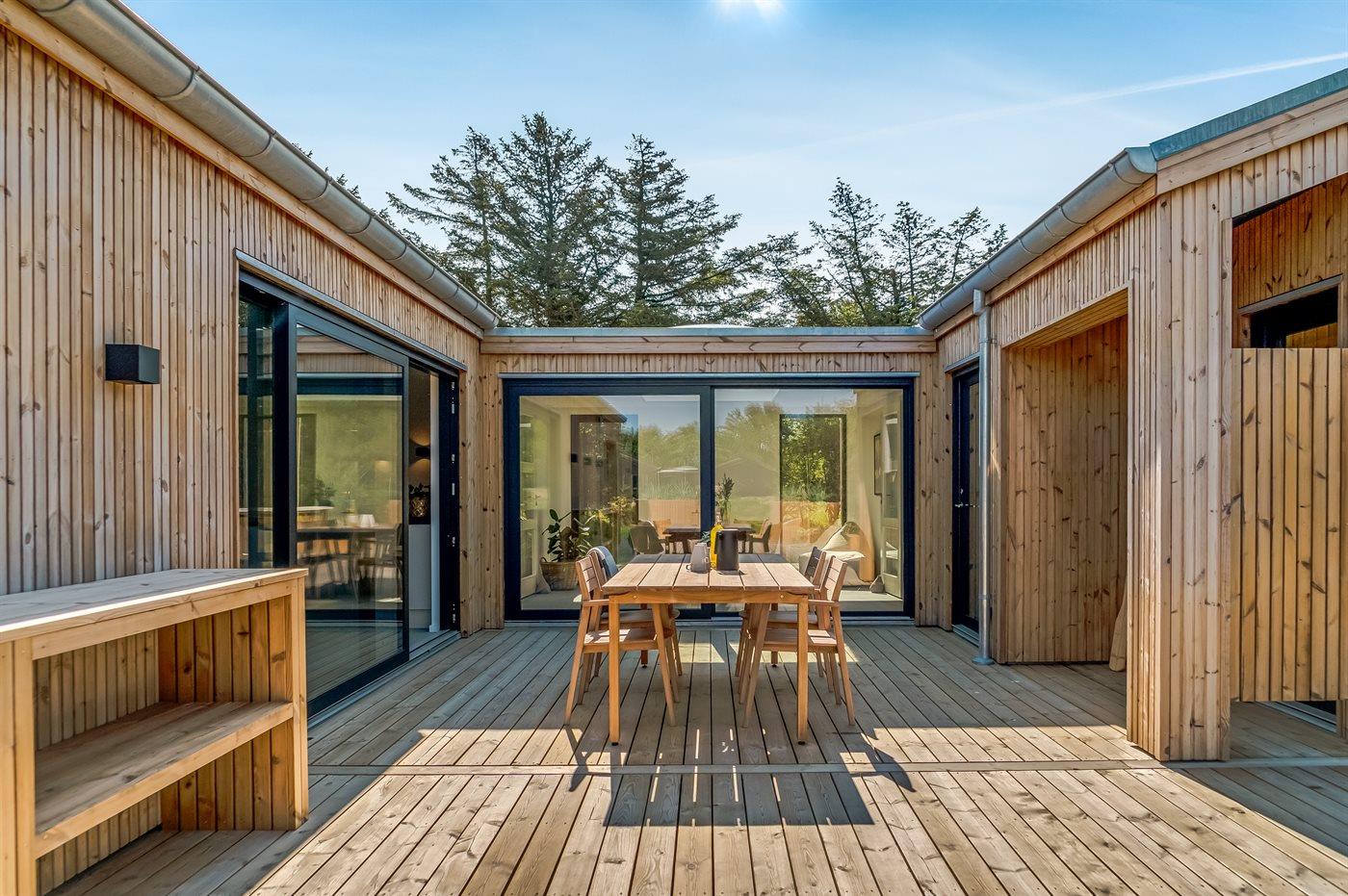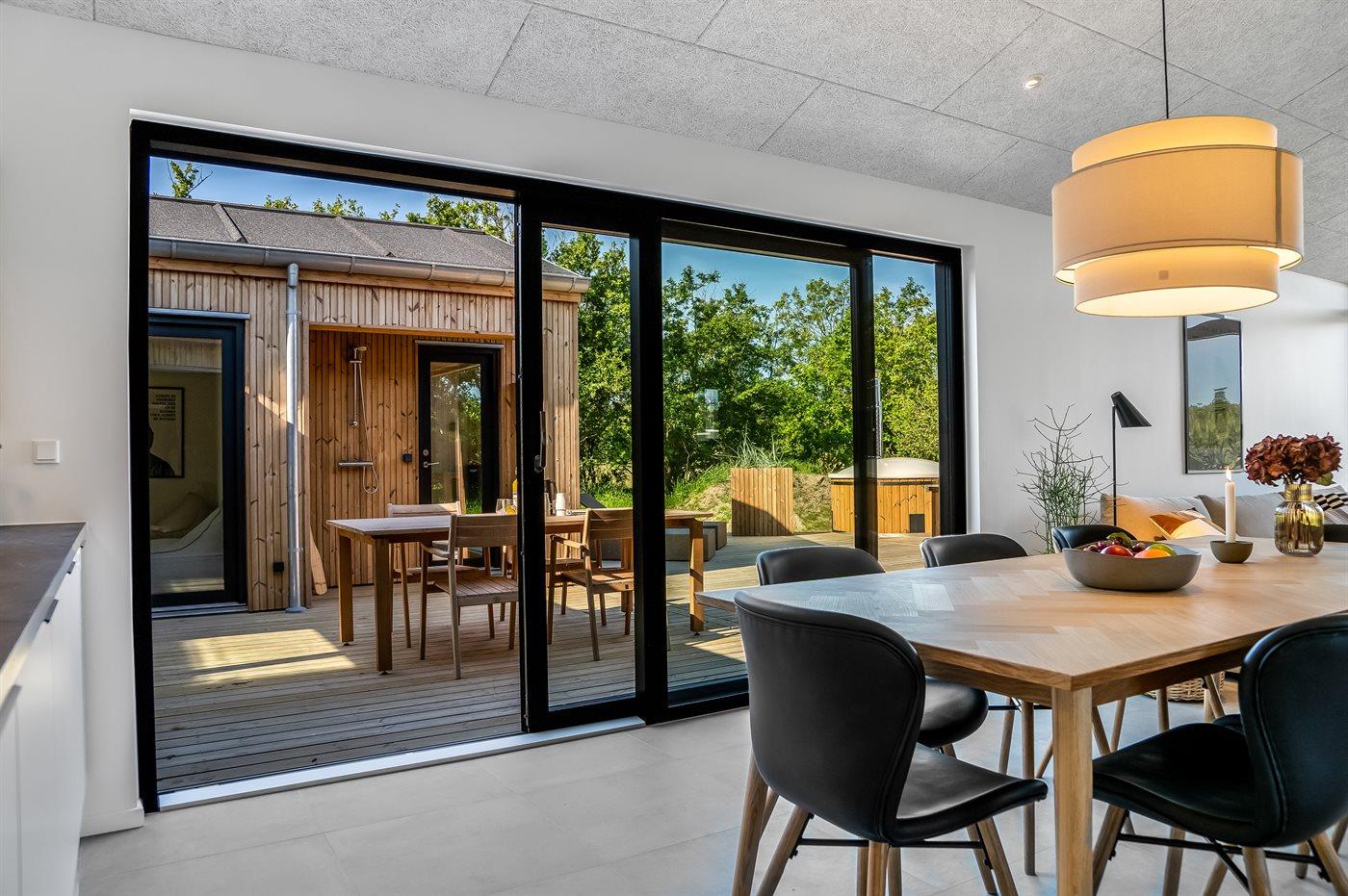 Nybygget sommerhus i Løkken med plads til 10 personer, aktivitetsrum og spa i naturskønne omgivelser.