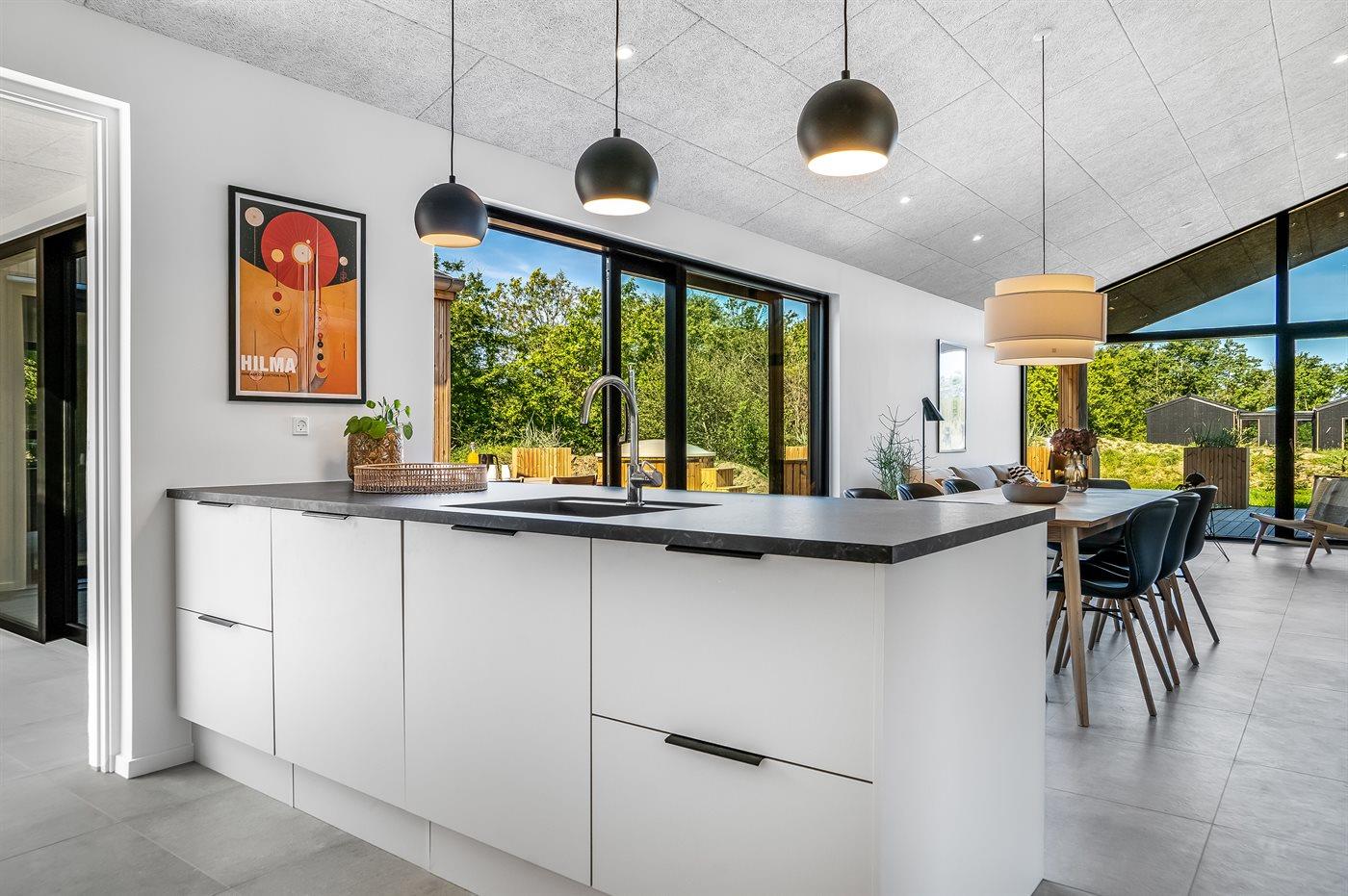 Køkkenet er udstyret med 1 køleskab. Der er 4 induktionskogeplader, varmluftovn, mikrobølgeovn samt opvaskemaskine.