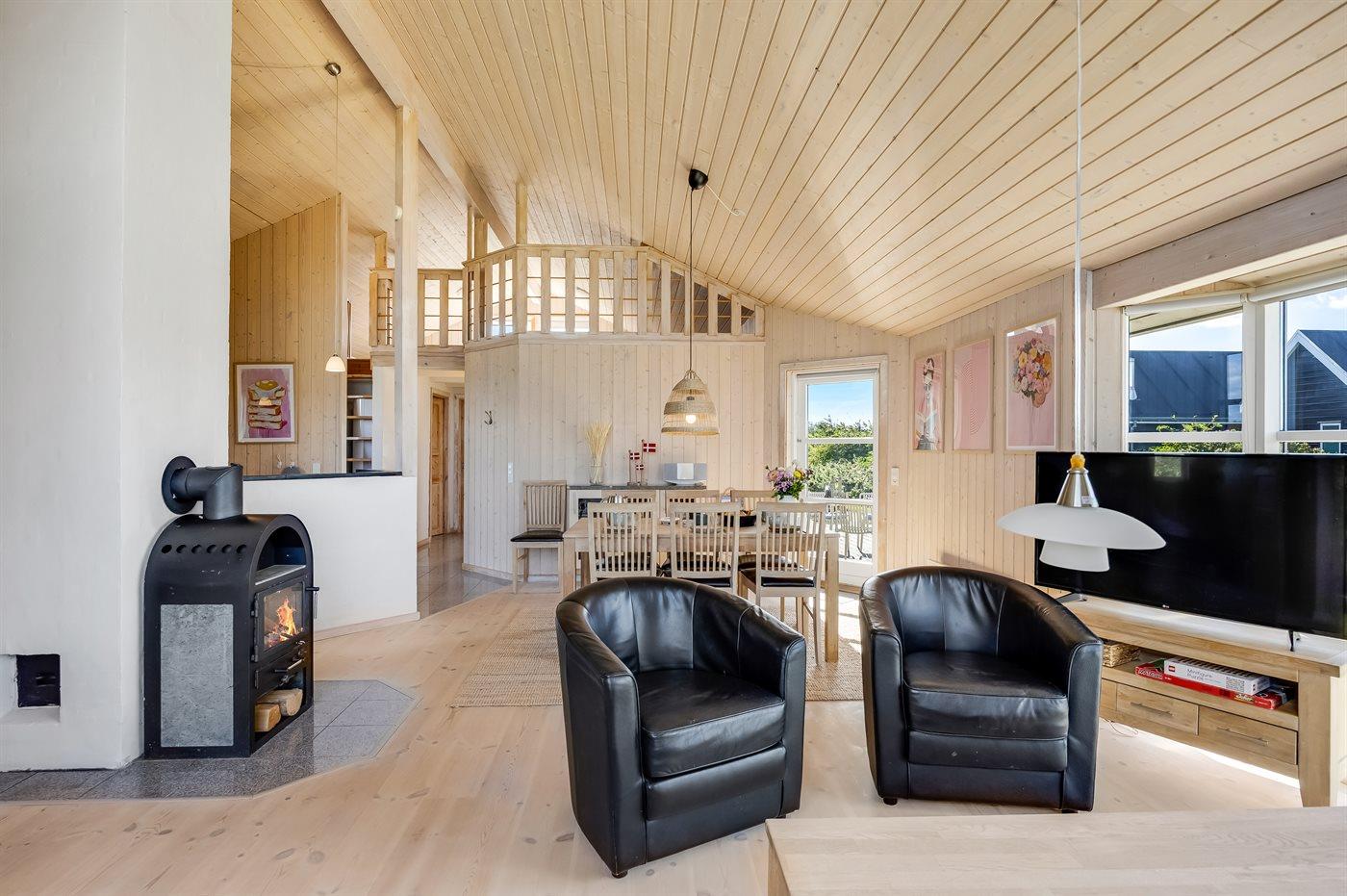 Huset fremstår lyst og indbydende med god plads til både afslapning og samvær. Dejlig terrasse.