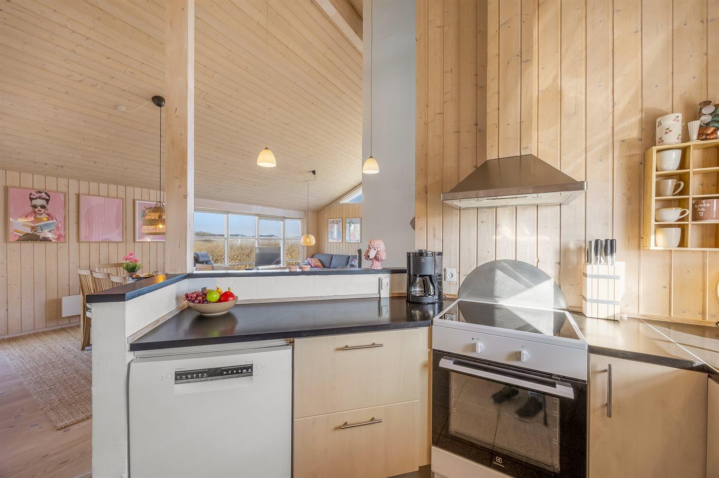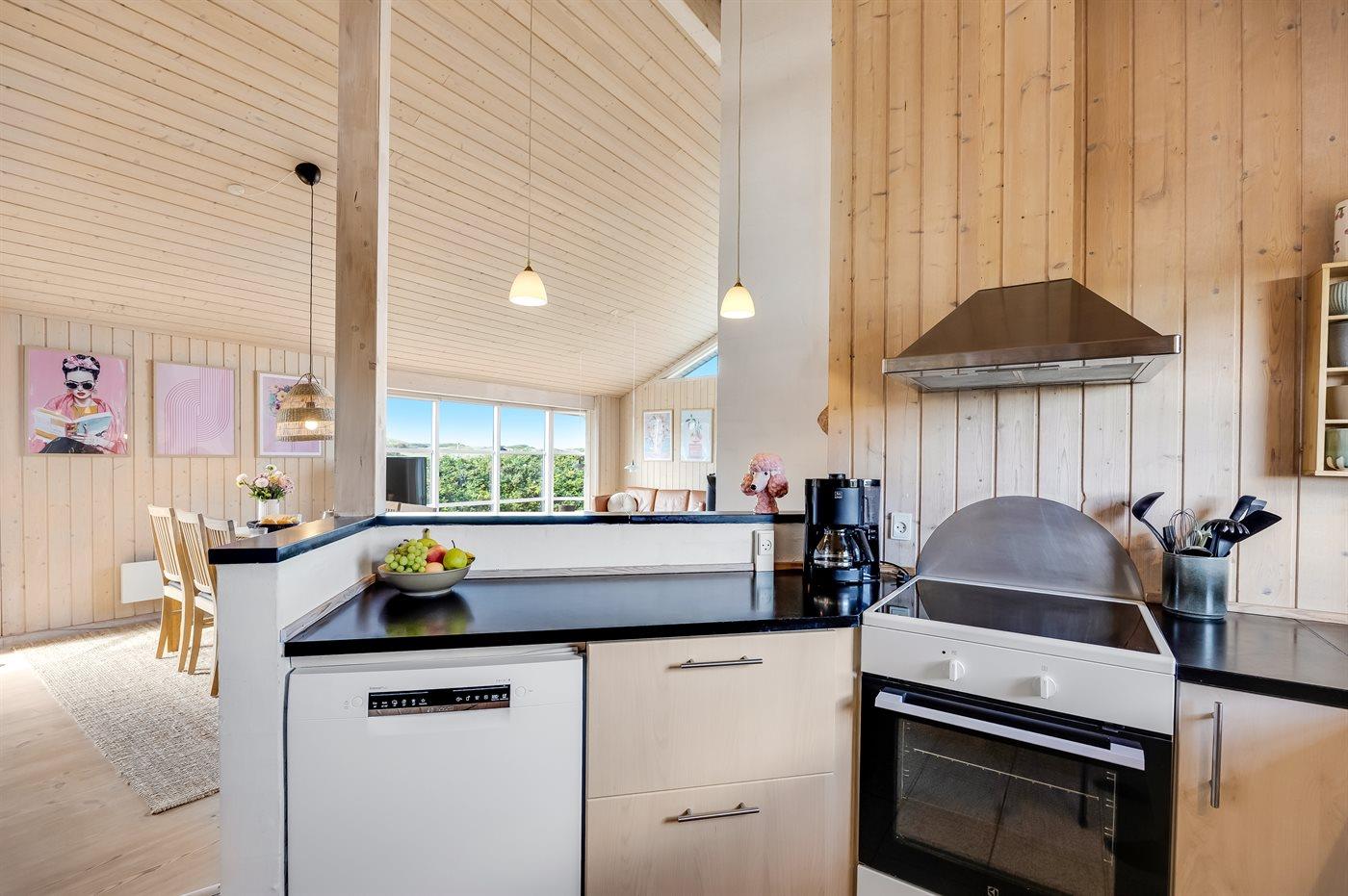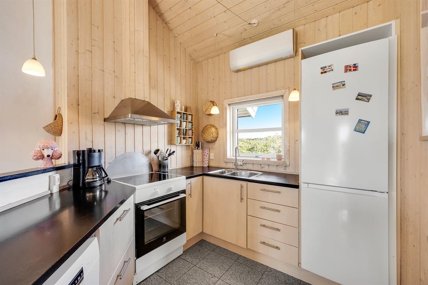 Køkkenet er udstyret med 1 køleskab. Der er 4 keramiske kogeplader, varmluftovn, mikrobølgeovn samt opvaskemaskine.
