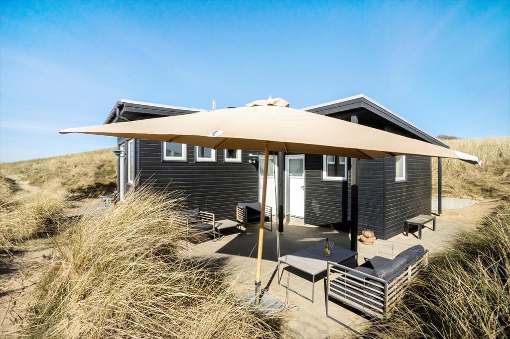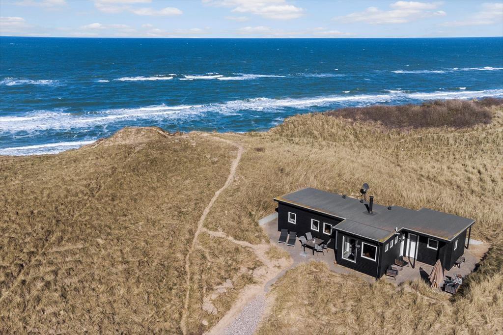 Sommerhuset ligger på en stor klitgrund, der smelter sammen med de naturskønne omgivelser. Og takket være det kuperede landskab ligger terrassemiljøet i læ mellem klitterne, så I kan nyde sol og sommerliv i ugenerede rammer, når I slapper af i havemøblerne, griller og leger. At sommerhuset ligger for enden af vejen betyder selvfølgelig også noget for den fredfyldte fornemmelse, som hersker her – på trods af at I bor så tæt på stranden og Vesterhavet.