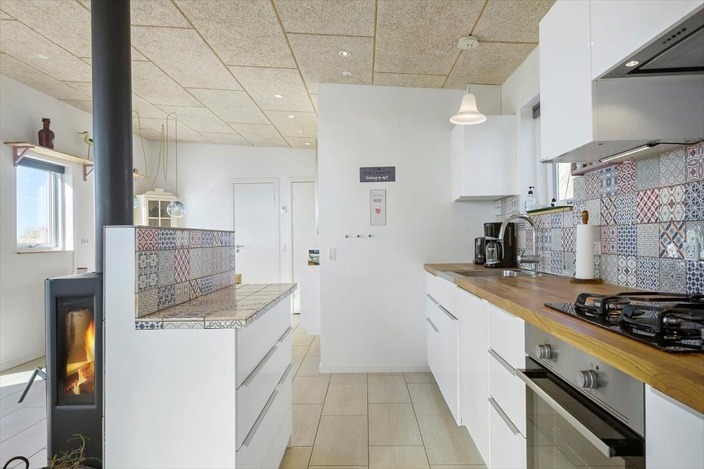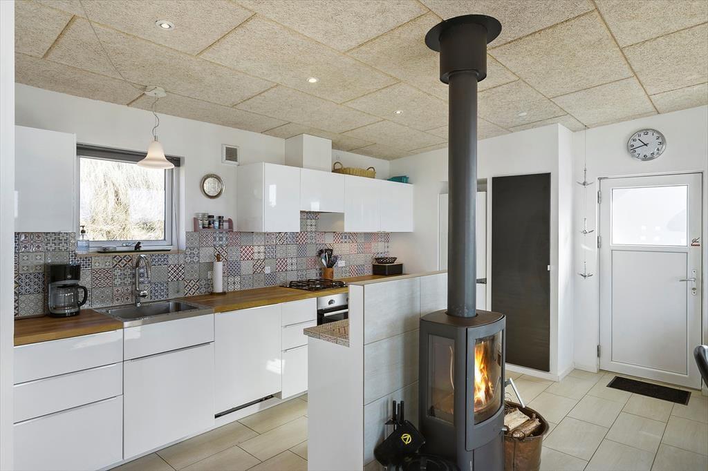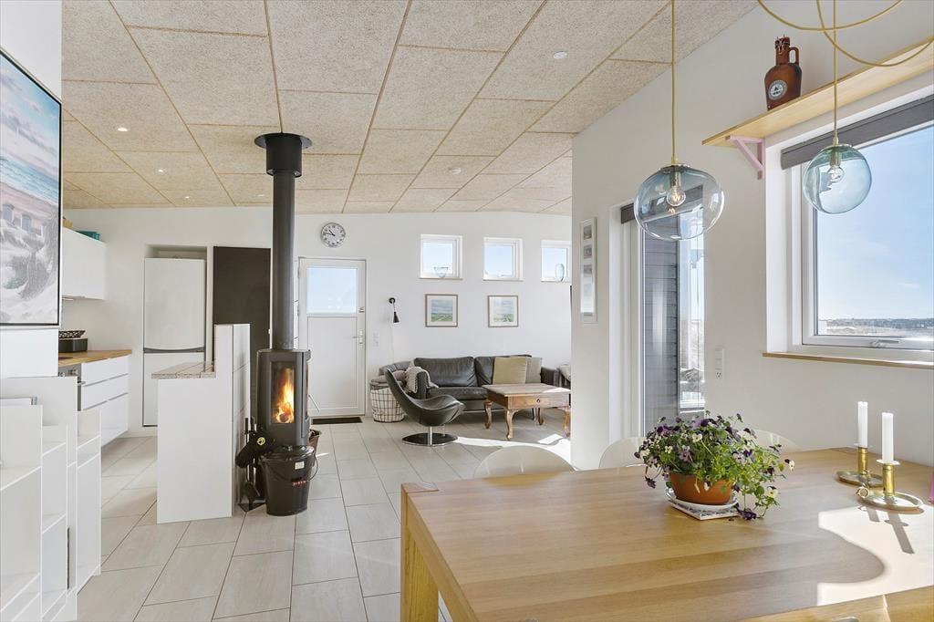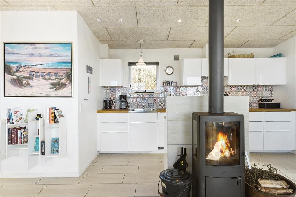 Feriestemningen er i top inden døre, hvor rummene har en dejlig lys atmosfære og er indrettede med møbler af god kvalitet. Den gode rumfornemmelse kommer også af, at der er gulvvarme i hele huset, og med varmepumpe og brændeovn oveni kan I se frem til et behageligt indeklima året rundt. Husets mange vinduer sørger for et dejligt lysindfald, og udsigten til klitterne er selvfølgelig også med til at pynte. Opholdsrummet er indrettet med et flot åbent køkken, en god spiseplads og en komfortabel sofaafdeling med tv med Chromecast. Et pænt badeværelse med bruser hører også med til planløsningen foruden tre gode soveværelser, hvoraf det ene ligger for sig som et anneks i direkte forlængelse af sommerhuset.
