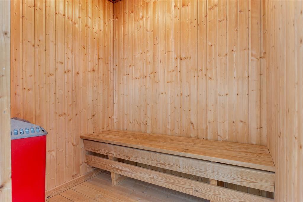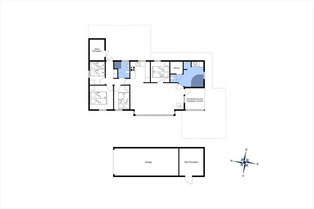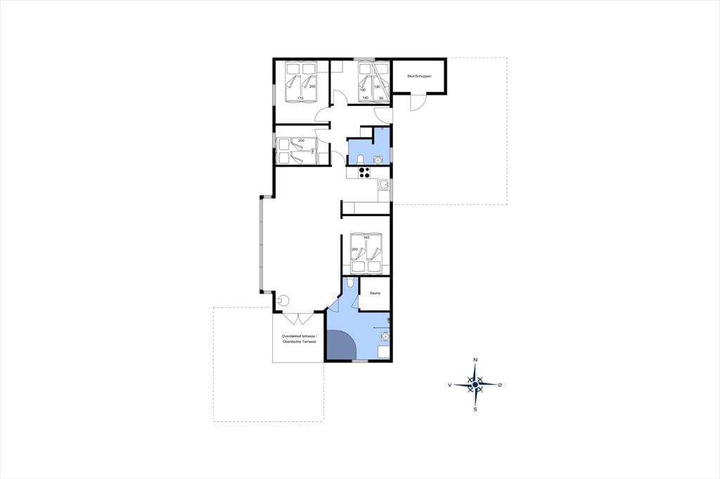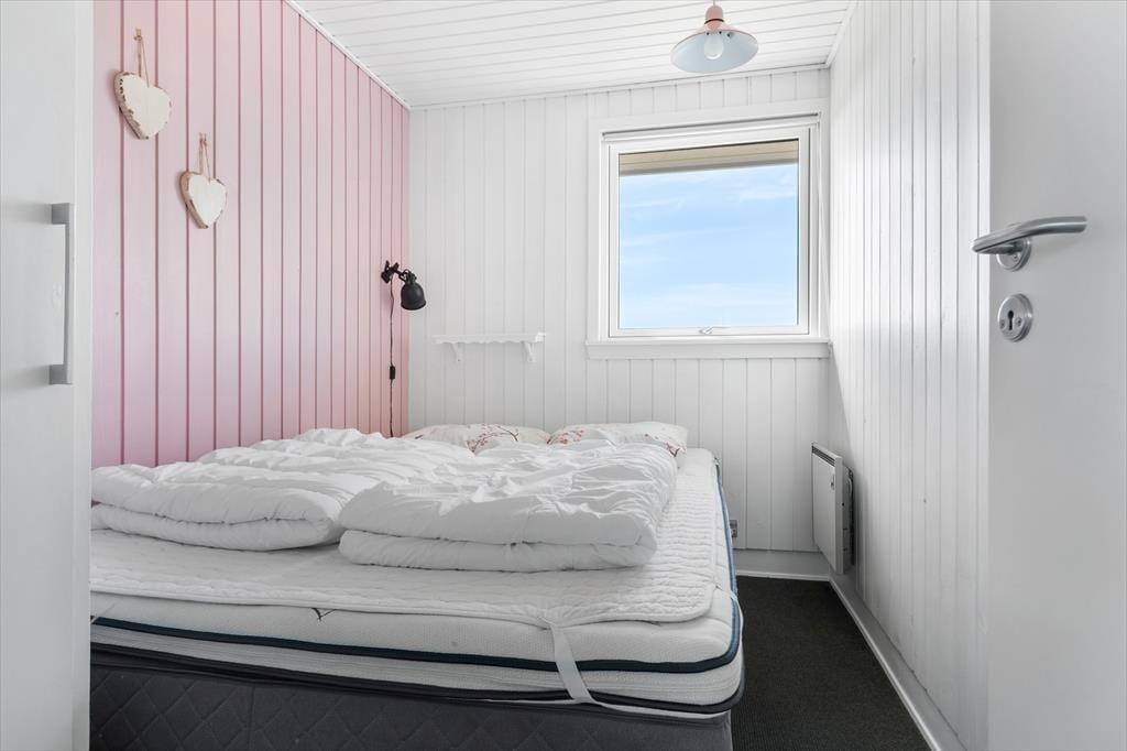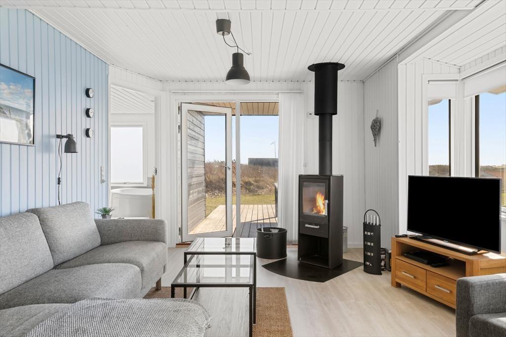 Sommerhuset er hyggeligt og velindrettet med fire soveværelser. Huset har to badeværelser, det ene med spabad og sauna. Værelserne er godt fordelt, og er især velegnet hvis man rejser med f.eks. to familier. Sommerhusets samlingspunkt er den hyggelige stue hvorfra man har udgang til den overdækkede terrasse. I stuen kan hyggen nydes om aftenen ved brændeovnen med solnedgangen i horisonten.