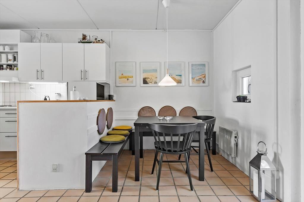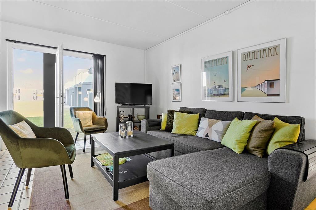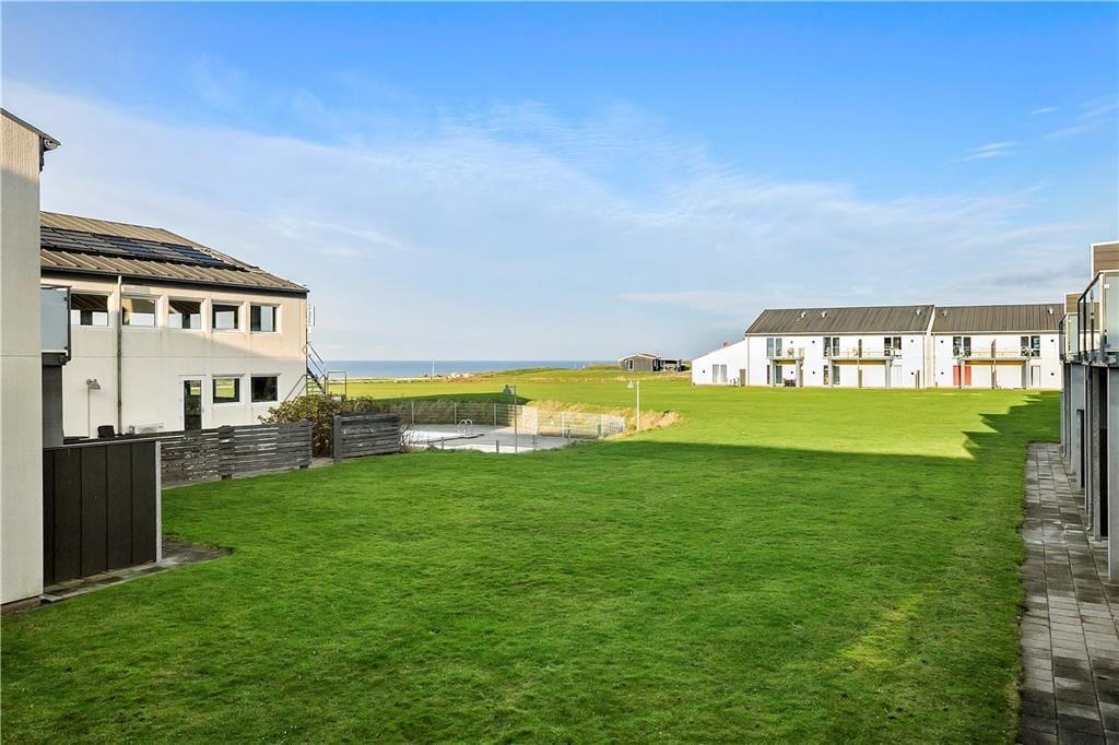Driverlivet kan også nydes i fulde drag på lejlighedens flisebelagte terrasse, der ligger i forlængelse af stuen. Eller tag havemøblerne ud på den store græsplæne og nyd solen og udsigten til Vesterhavet og den høje himmel. Giver det gode sommervejr jer lyst til en dukkert, har I fri adgang til feriecentrets udendørs poolområde, der byder på en dyb swimmingpool og et lavere børnebassin – og begge kan benyttes fra juli til august. En legeplads hører også med til fællesfaciliteterne, og så har centrets restaurant for øvrigt åbent i højsæsonen og i weekenderne, mens en lille købmand holder åbent i sommerperioden.