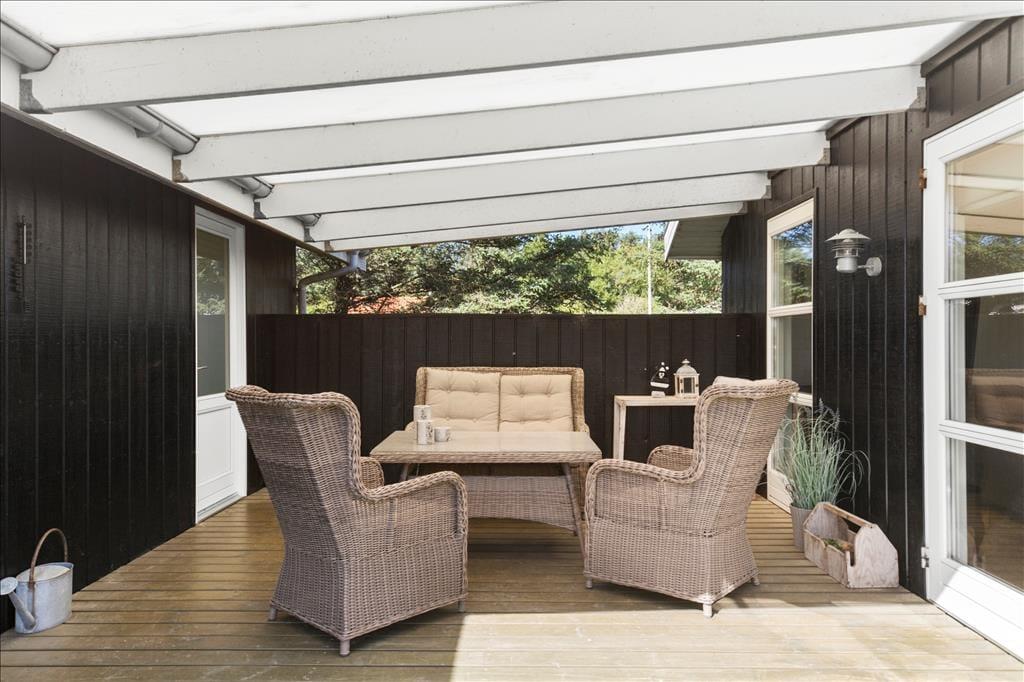 Skinner sommersolen, kan morgenmaden blive serveret på terrassen. Faktisk er der to terrasser at vælge imellem: En østvendt, der netop ligger godt i forhold til dagens tidlige solstråler, og en sydvendt terrasse, som er både stor, solrig og delvist overdækket. Den store grund er enkelt anlagt med græsplæne og randbeplantning, og så er der for øvrigt en carport til bilen.