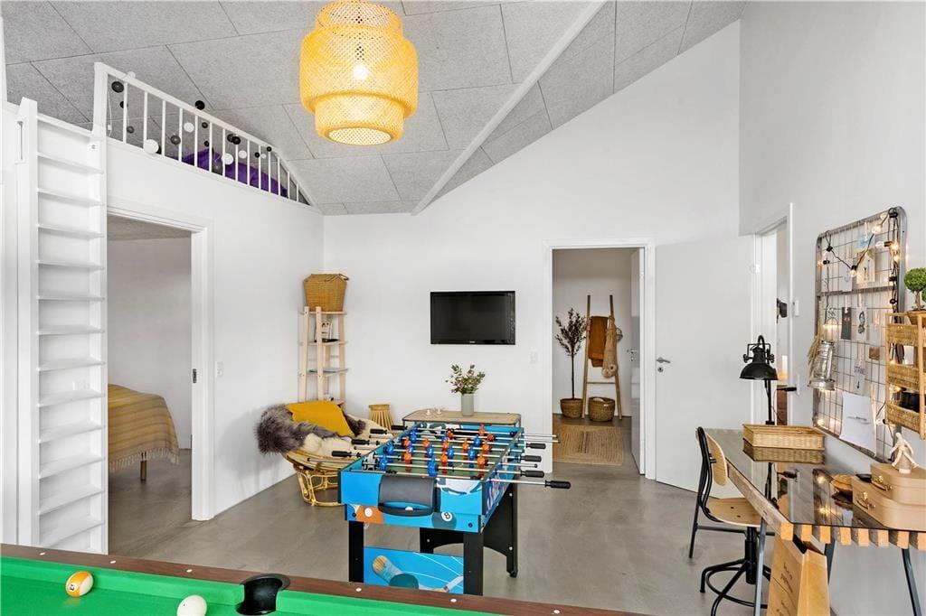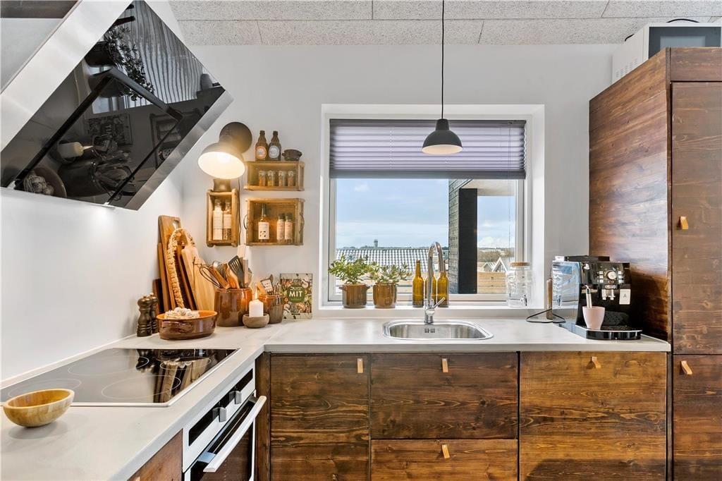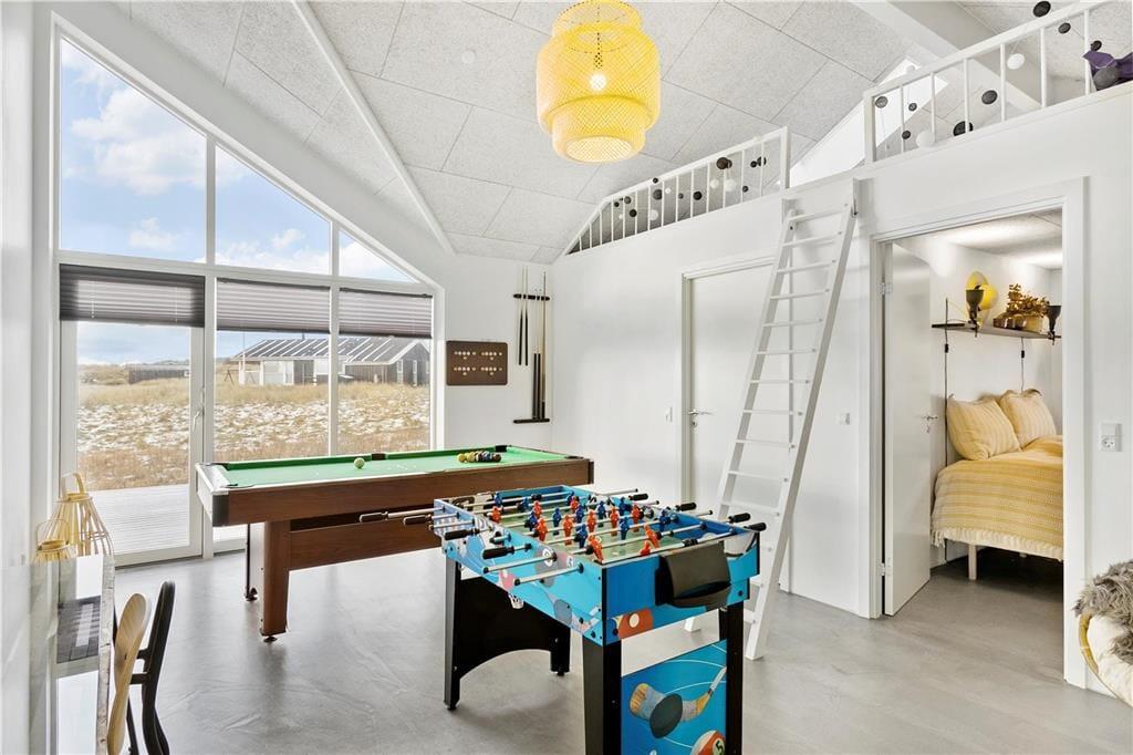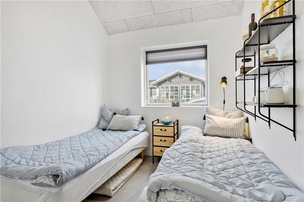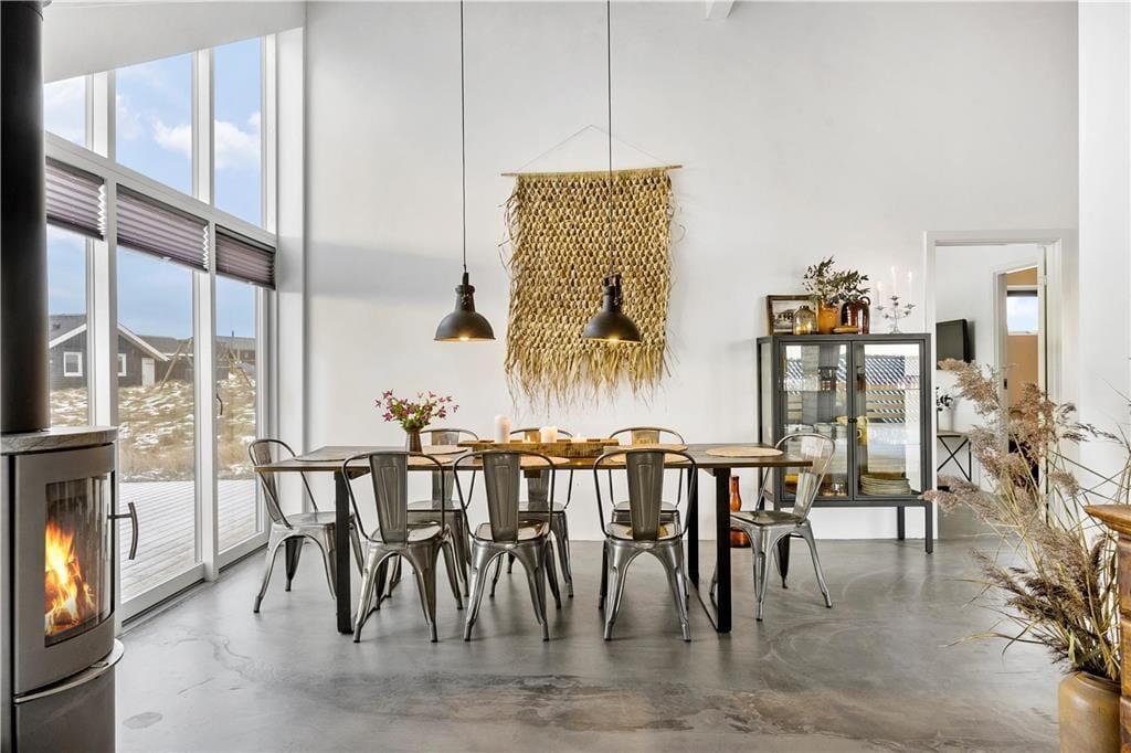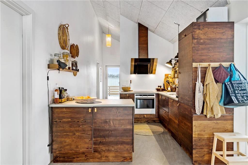 Huset er opført i en elegant og minimalistisk byggestil med store vinduespartier, der giver masser af lys og flot udsigt over omgivelserne. Med 125 m2 under tag får I god plads at brede jer på. I får både store, lyse opholdsrum med loft til kip, tre soverum og to badeværelser, og herudover indeholder huset et herligt aktivitetsrum med hems. Huset er smagfuldt indrettet i en enkel og rustik sommerhusstil, og man føler sig med det samme godt tilpas. Køkkenet er velindrettet og ligger i åben forbindelse med opholdsrummet, og I får de bedste betingelser for at hygge jer og lave mad i fællesskab.