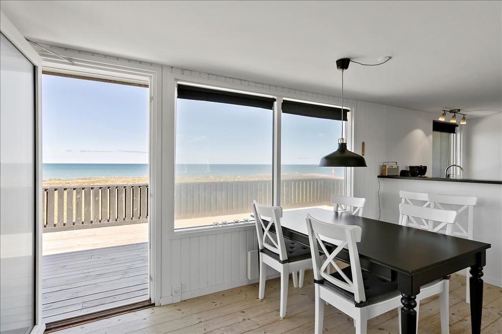Hvis I drømmer om at holde ferie med flot natur lige udenfor vinduerne, er dette fine sommerhus helt klart en værdig kandidat. Det ligger nemlig i første række til Nr. Lyngby Strand, så fra både stuen og terrassen har I fri og uforstyrret udsigt til Vesterhavet.