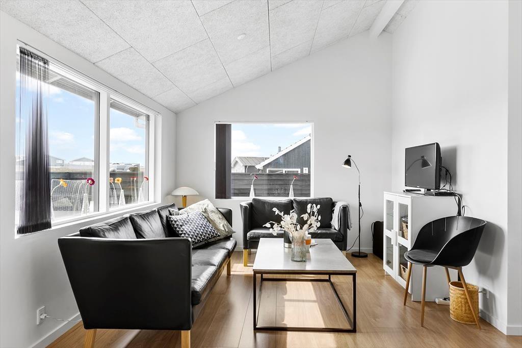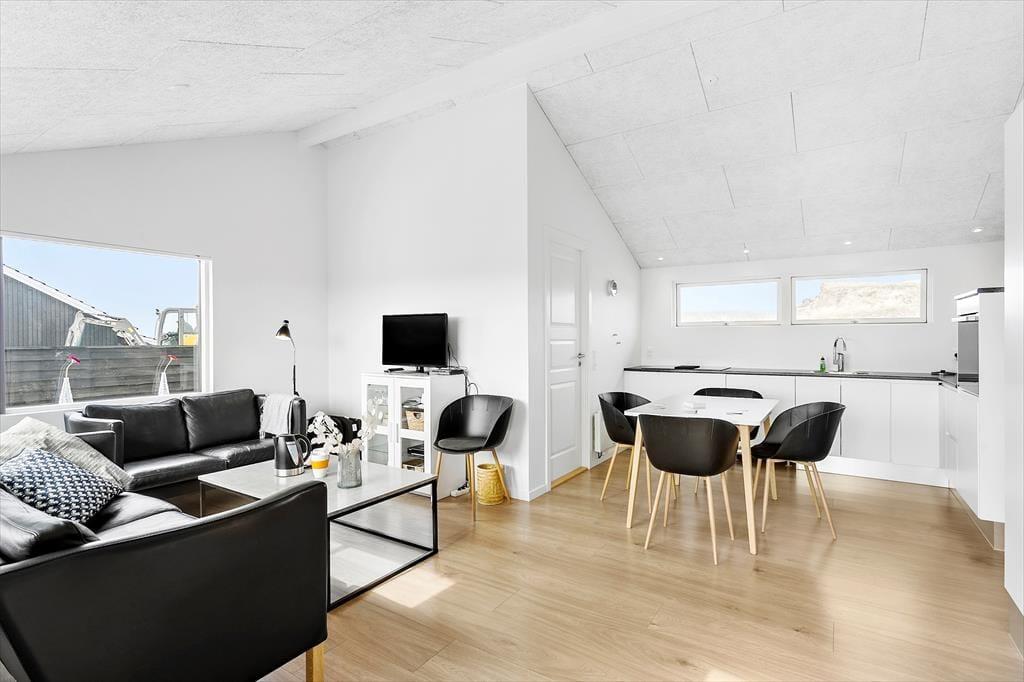 I kan straks begynde at glæde jer til at holde ferie i dette lyse og lækre sommerhus, der er opført så sent som i 2021. Sommerhuset er gennemført indrettet og byder på en skøn terrasse – og så har det ovenikøbet en udsøgt beliggenhed i første række til Nr. Lyngbys stejle klint og dermed til stranden og Vesterhavet.