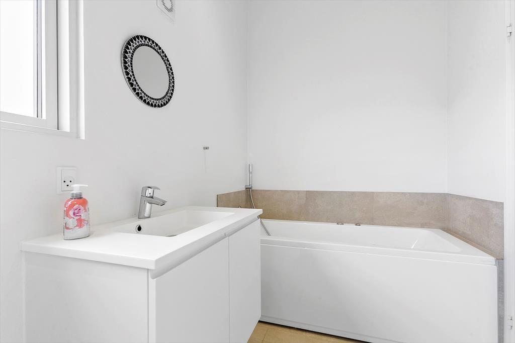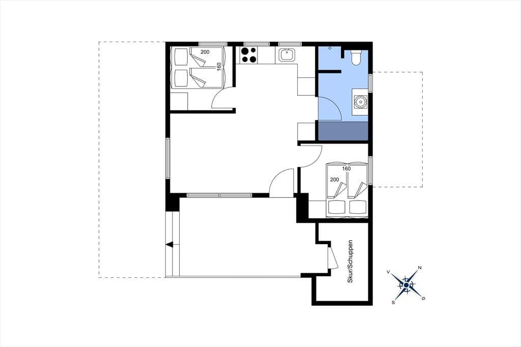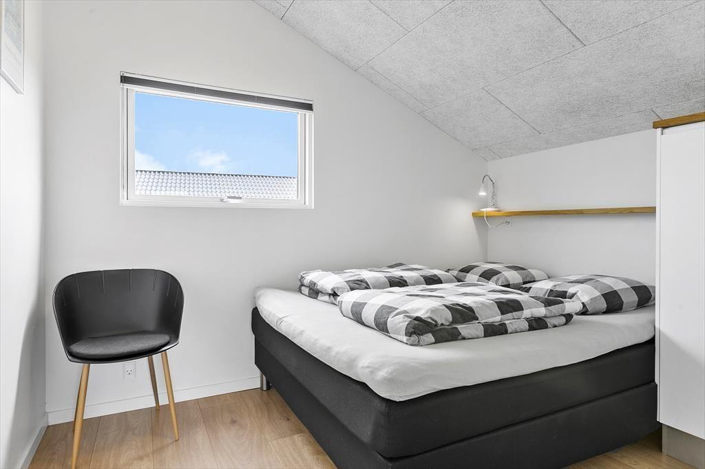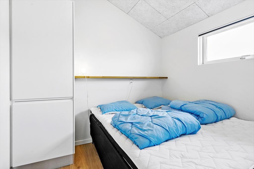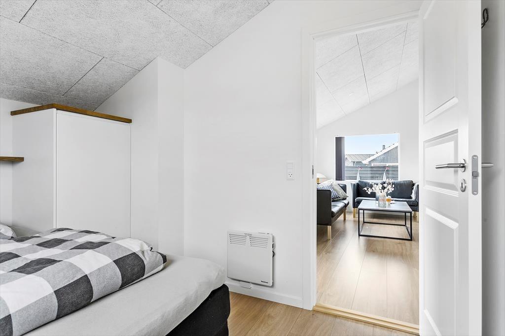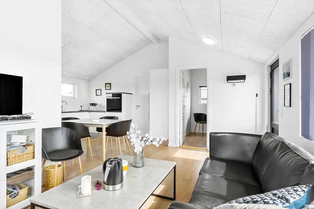 Det 56 m2 store sommerhus har en perfekt planløsning til fire personer. De to soveværelser er begge indrettet med gode dobbeltsenge, og det flotte badeværelse er udstyret med både bruseniche og badekar. Midt i huset er køkken og stue samlet i ét opholdsrum, så fælles madlavning og sofaafslapning kan begge dele nemt indgå i dagens ferieprogram. Alle rum fremstår lyse og indbydende – ikke mindst i opholdsrummet, hvor der er gennemstrømmende lysindfald og fin udsigt til det omkringliggende kystlandskab.