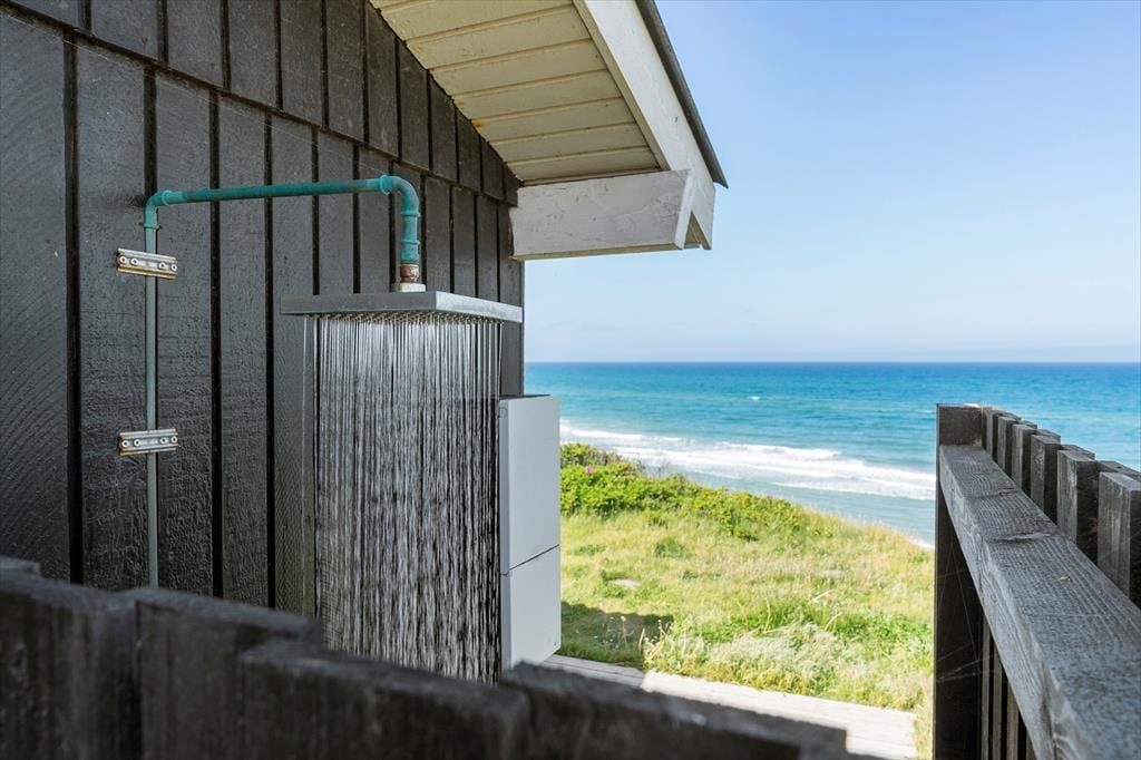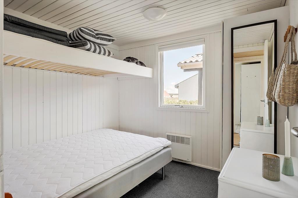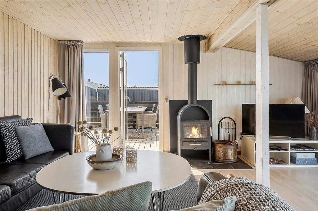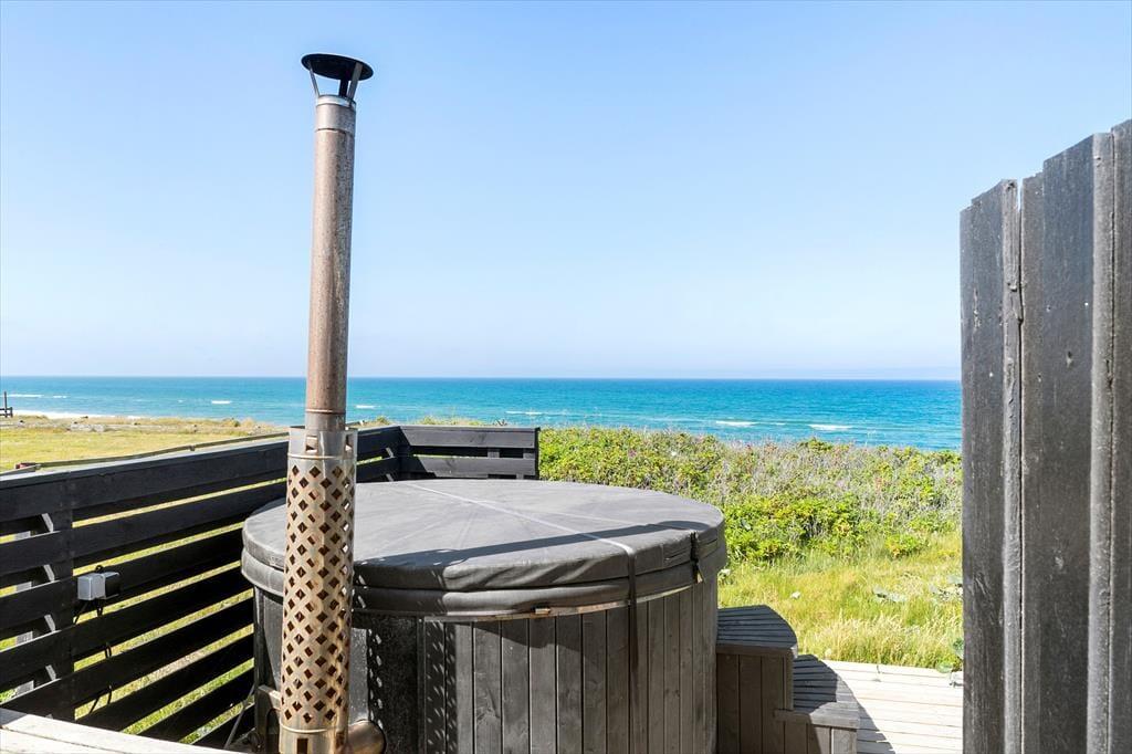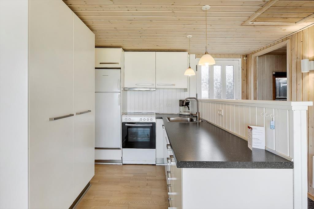 Hvis I er til imponerende udsigtspunkter, frit udsyn og flot natur, skal I unde jer selv at holde ferie i huset. Her på adressen bliver I nemlig belønnet med det vildeste vue i stuen, hvor et vinduesparti dækker hele den vestvendte væg, og selv når I børster tænder på badeværelset kan I kigge ud på Vesterhavets blå bølger. Køkkenet ligger i åben forbindelse med stuen, så her går I ikke glip af noget – heller ikke det hyggelige samvær, der finder sted i opholdsrummet. I stuen er der for øvrigt brændeovn, og hvis I ellers kan løsrive blikket fra udsigten, er der tv med Chromecast. Er det ved at være sengetid, kan I sige godnat og se frem til en god nats søvn på sommerhusets to soveværelser.