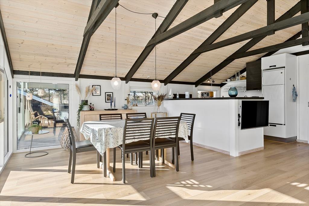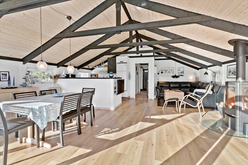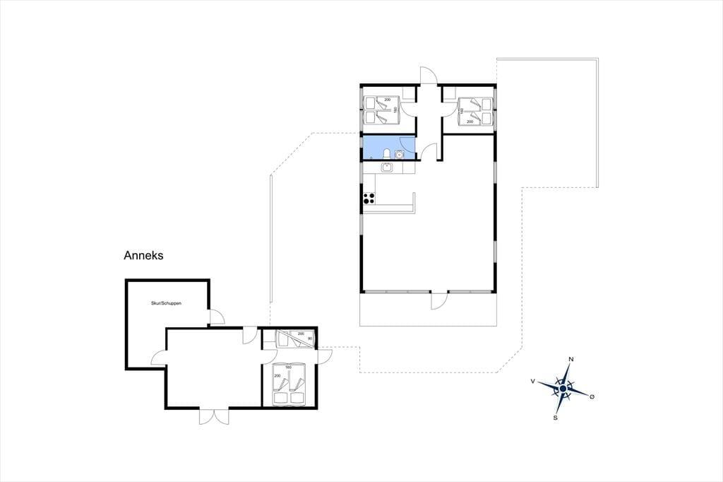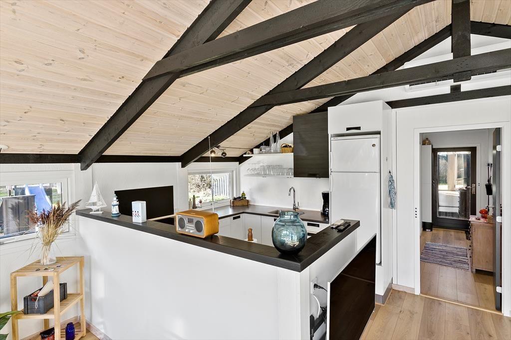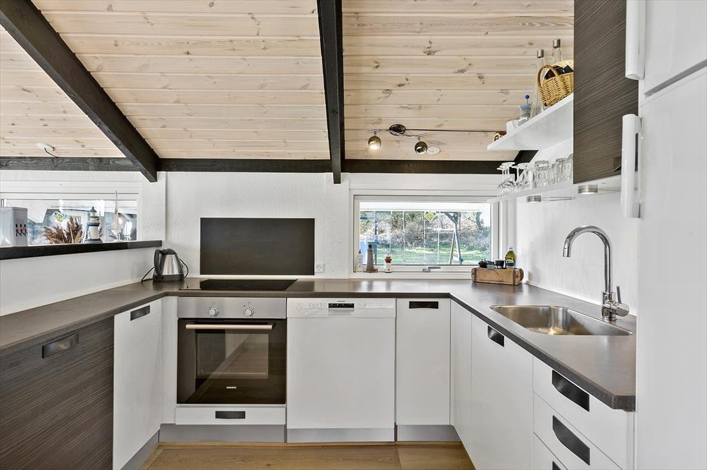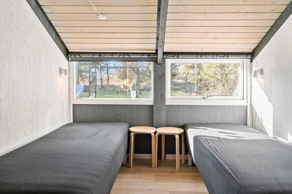 Sommerhuset, der er blevet renoveret i 2019, måler 68 m2, og dertil kommer et godt anneks på 36 m2. I har med andre ord god plads til at brede jer og kan sagtens være seks personer samlet, for der er to soveværelser i selve sommerhuset og et tredje i annekset. Det rummelige anneks byder desuden på et aktivitetsrum, hvor I kan hygge jer med at spille pool og dart, indtil I har fundet feriens ubestridte mester. Efter dysten er det måske tid til at rykke over i sommerhusets stue, som er et herligt opholdsrum med brændeovn, loft til kip og et stort vinduesparti, der inviterer dagslyset ind fra syd. I åben forbindelse med stuen ligger husets veludstyrede køkken, og planløsningen byder endelige også på et badeværelse med bruser.
