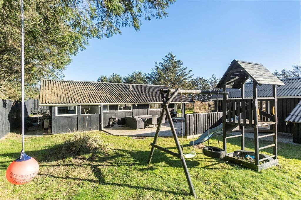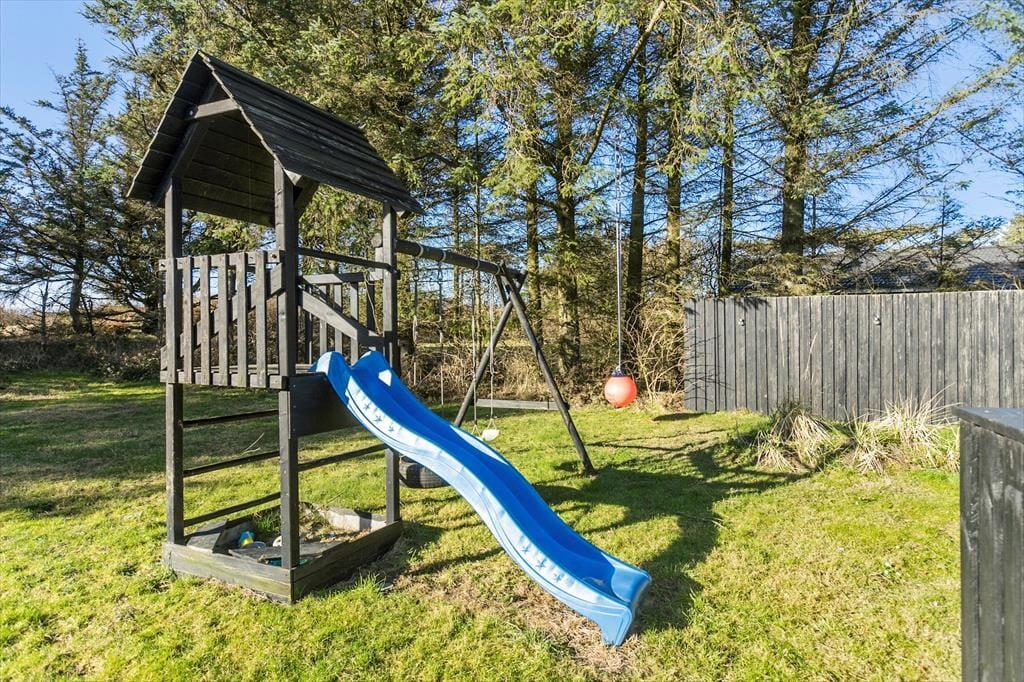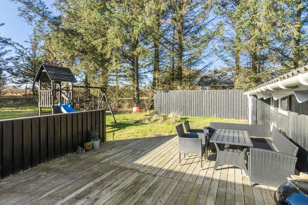 Grunden, som sommerhuset ligger på, er ganske stor med sine 1439 m2, og den skærmes af randbeplantning ud mod vejen. Familien kan samles om at spille bold og havespil på græsplænen, og til de yngste er der sandkasse og legestativ med gynger – så mon ikke der bliver tid til, at de voksne kan slappe af på terrasserne, mens børnene boltrer sig.