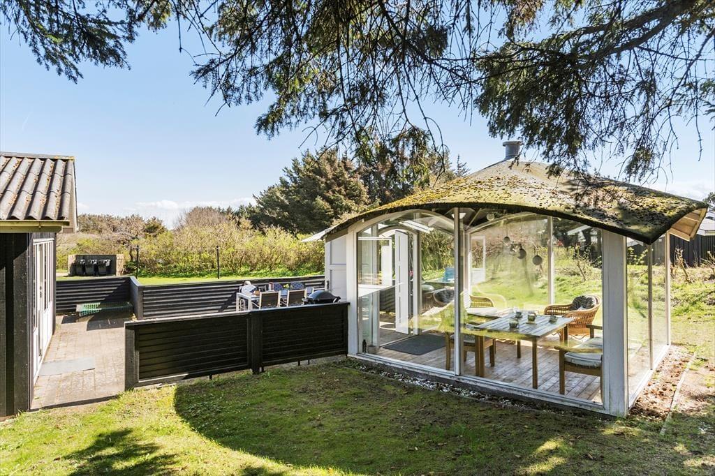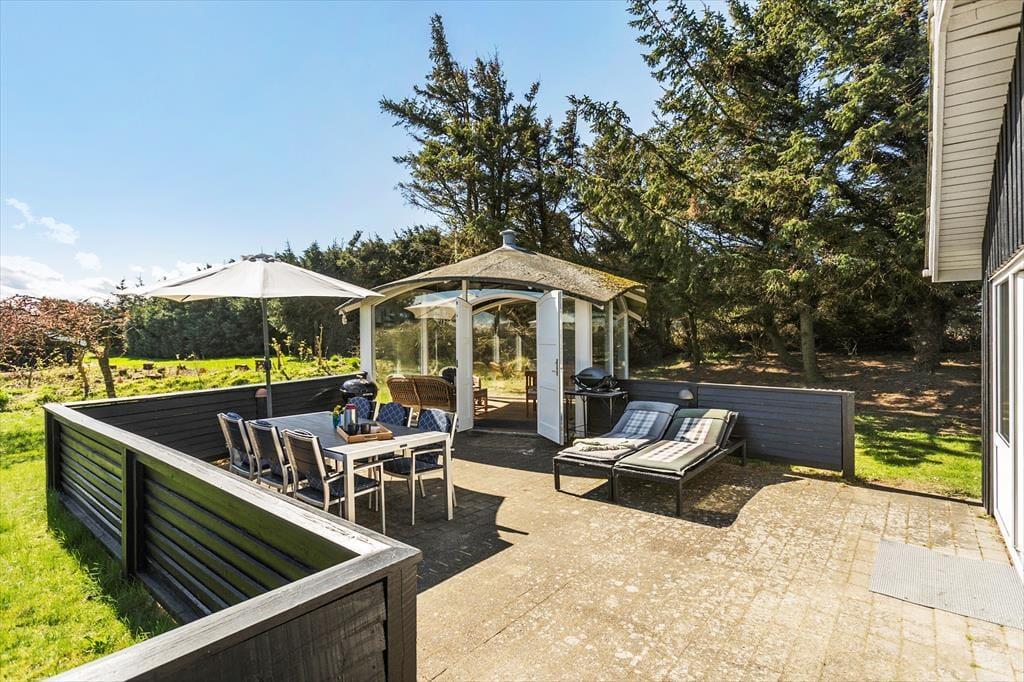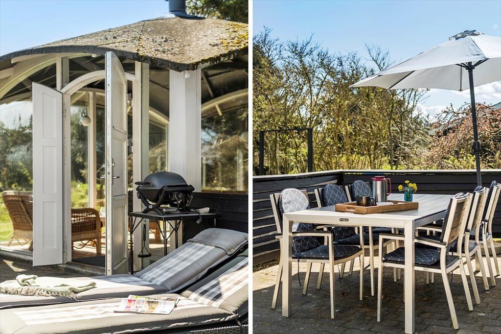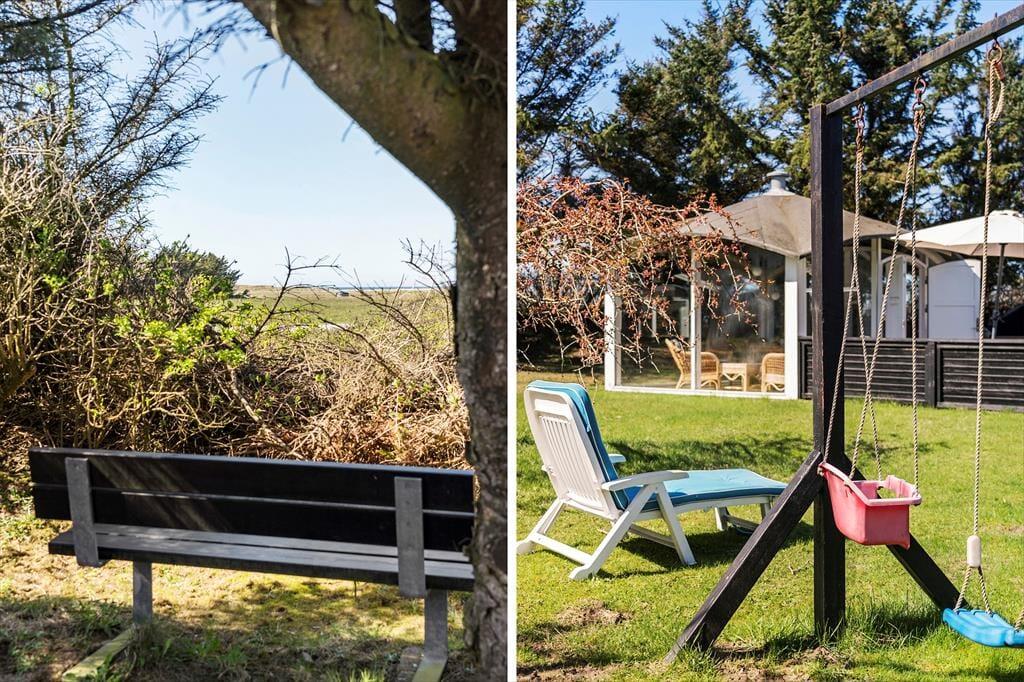 Den fritstående havepavillon minder om en udestue, for den er helt aflukket med store glaspartier, og dermed kan den være med til at udvide udesæsonen – det er nemlig også dejligt at sidde her i forårssolen eller på en efterårsdag i gyldent lys. Når sommeren er på sit højeste, vil du måske hellere vælge en siddeplads på en af de dejlige terrasser, hvis ikke du slænger dig i en liggestol på græsplænen eller sætter dig på udsigtsbænken, hvorfra du kan nyde synet af Vesterhavet. Der er adgang til et aflåst skur, hvor man har mulighed for at låse cyklerne ind i. Til de yngste børn er der gynger og sandkasse, og hvis hele familien vil hygge sig med et spil petanque, har I fri adgang til grundejerforeningens bane, der ligger stort set på den anden side af hækken.