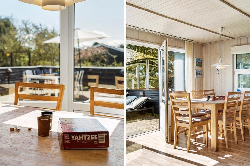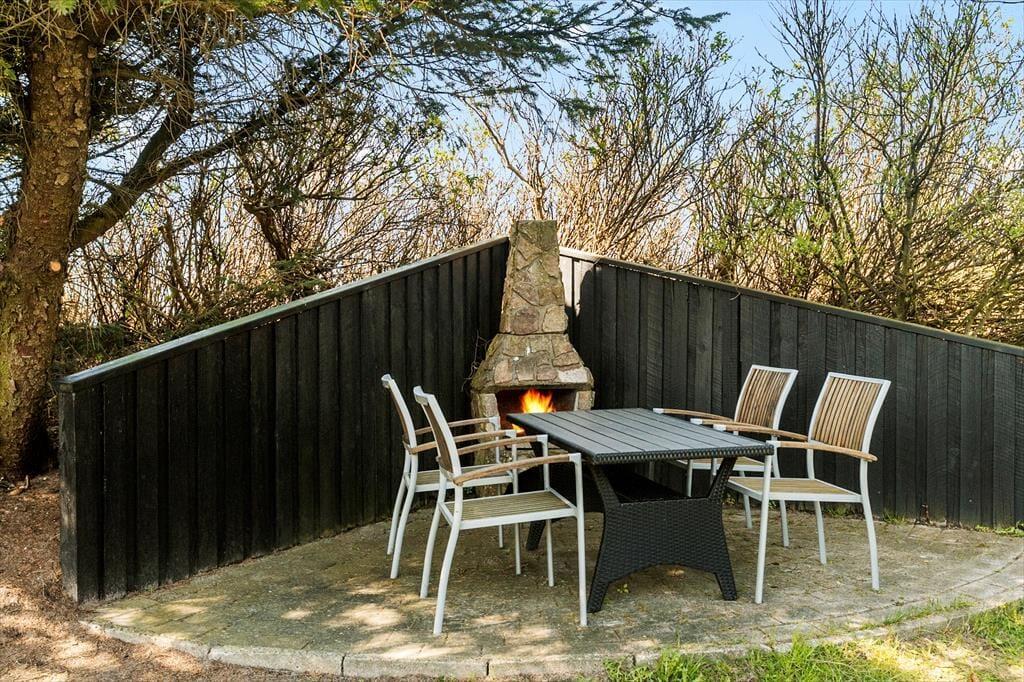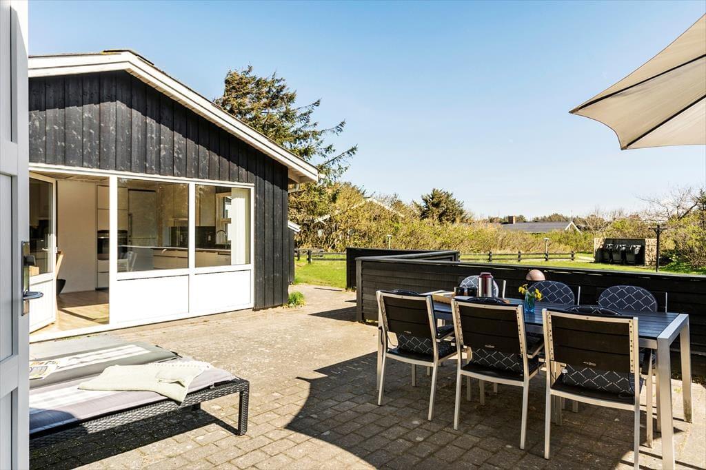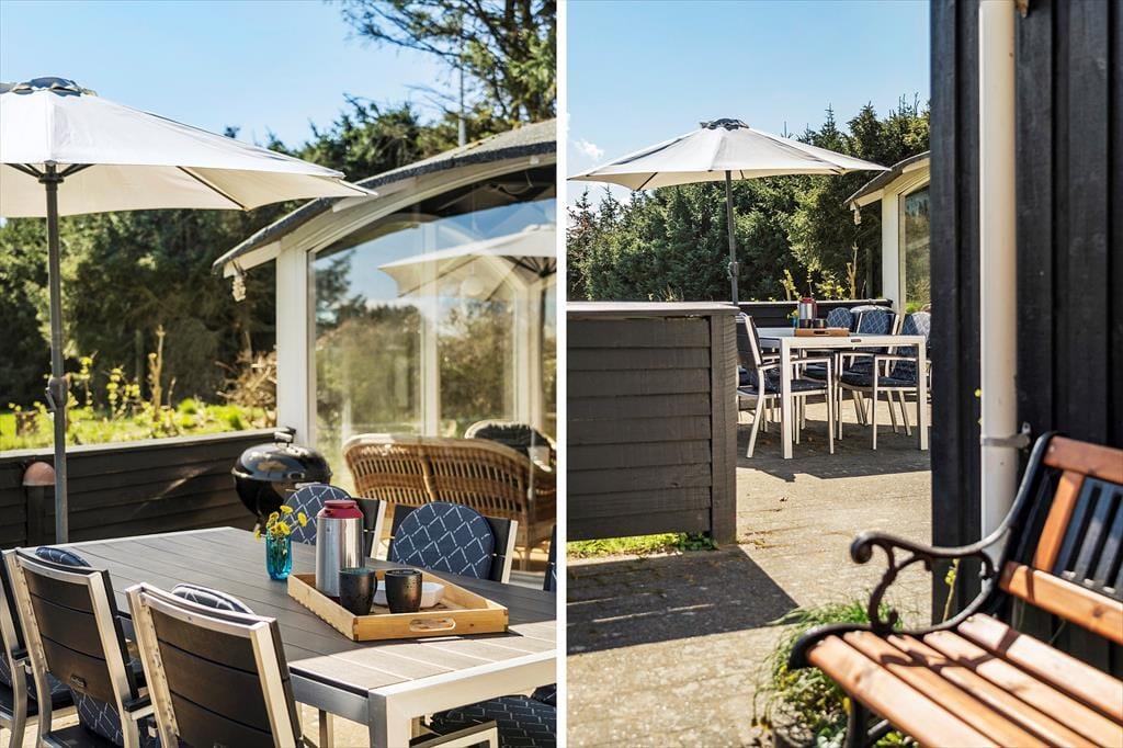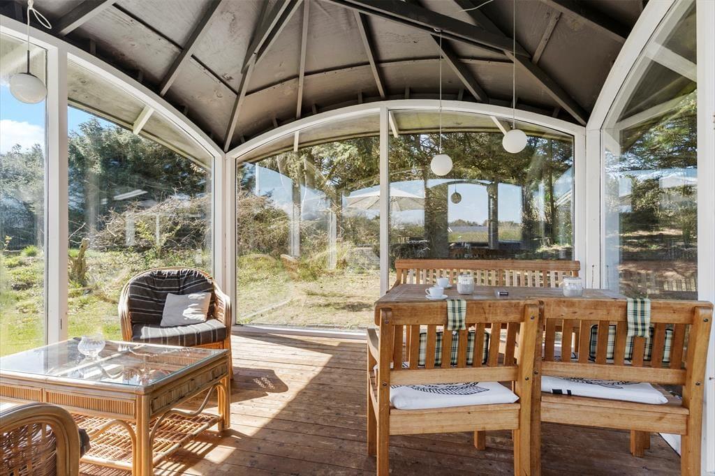 Den fritstående havepavillon minder om en udestue, for den er helt aflukket med store glaspartier, og dermed kan den være med til at udvide udesæsonen – det er nemlig også dejligt at sidde her i forårssolen eller på en efterårsdag i gyldent lys. Når sommeren er på sit højeste, vil du måske hellere vælge en siddeplads på en af de dejlige terrasser, hvis ikke du slænger dig i en liggestol på græsplænen eller sætter dig på udsigtsbænken, hvorfra du kan nyde synet af Vesterhavet. Der er adgang til et aflåst skur, hvor man har mulighed for at låse cyklerne ind i. Til de yngste børn er der gynger og sandkasse, og hvis hele familien vil hygge sig med et spil petanque, har I fri adgang til grundejerforeningens bane, der ligger stort set på den anden side af hækken.